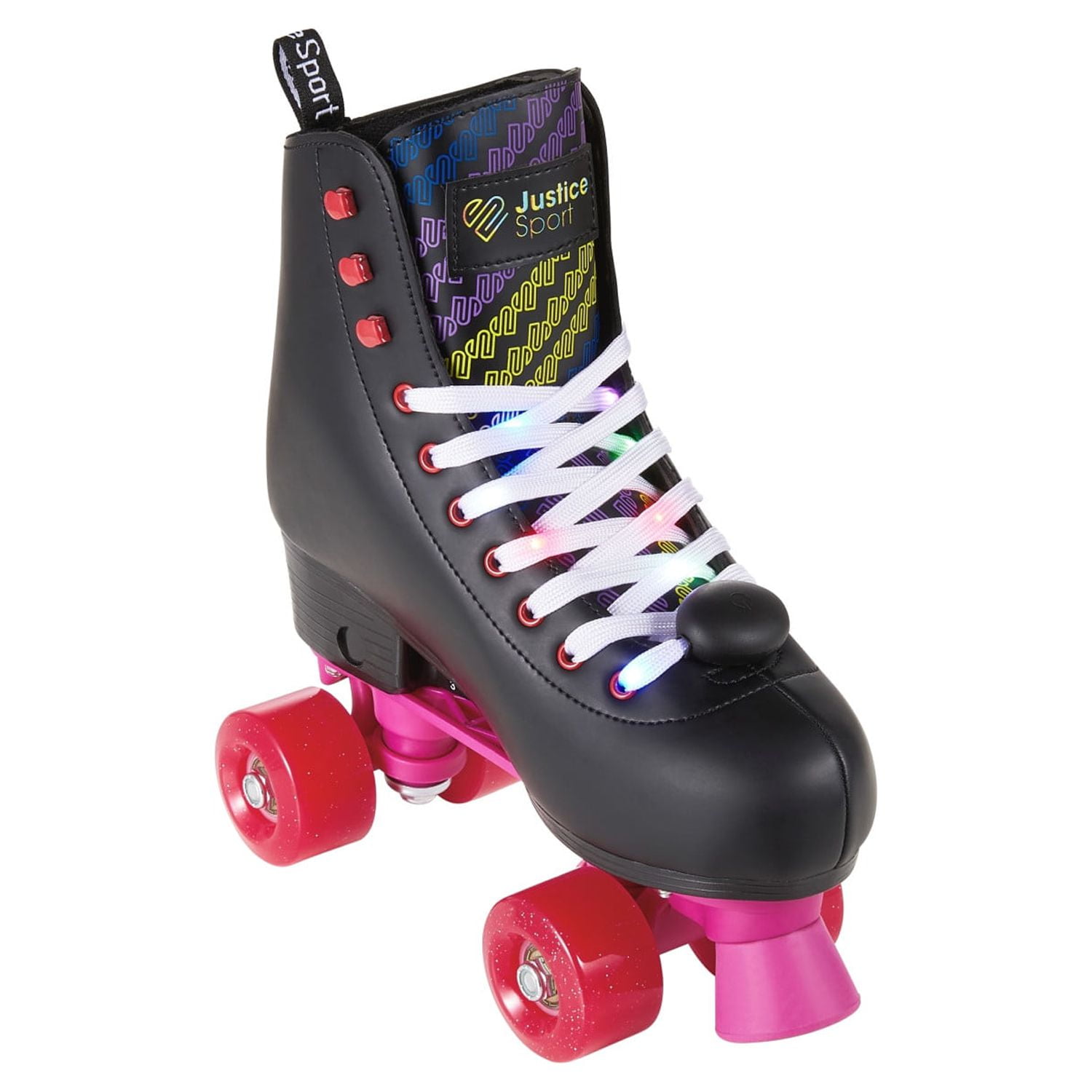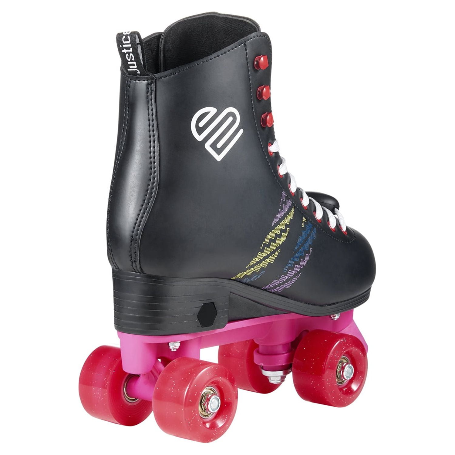 Justice Girls Roller Skates High Quality Roller Skate. trucks and cushions designed to guide you into turns and footwork with control, precision and standout style. Designer Roller Skates Front breaks for fast stopping. A pull tab for easy slip on. Laces with metal speed eyelets and hooks for a snug fit Female Ages 8+, Kid Size 3-6