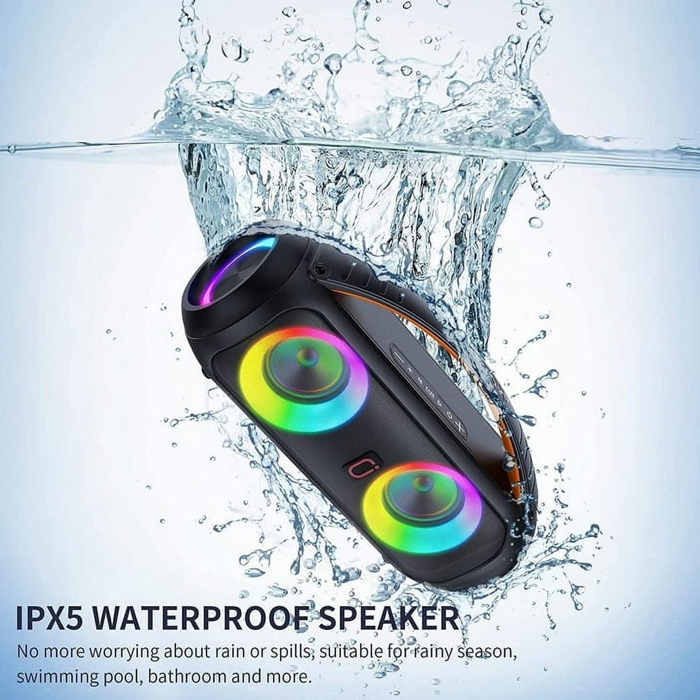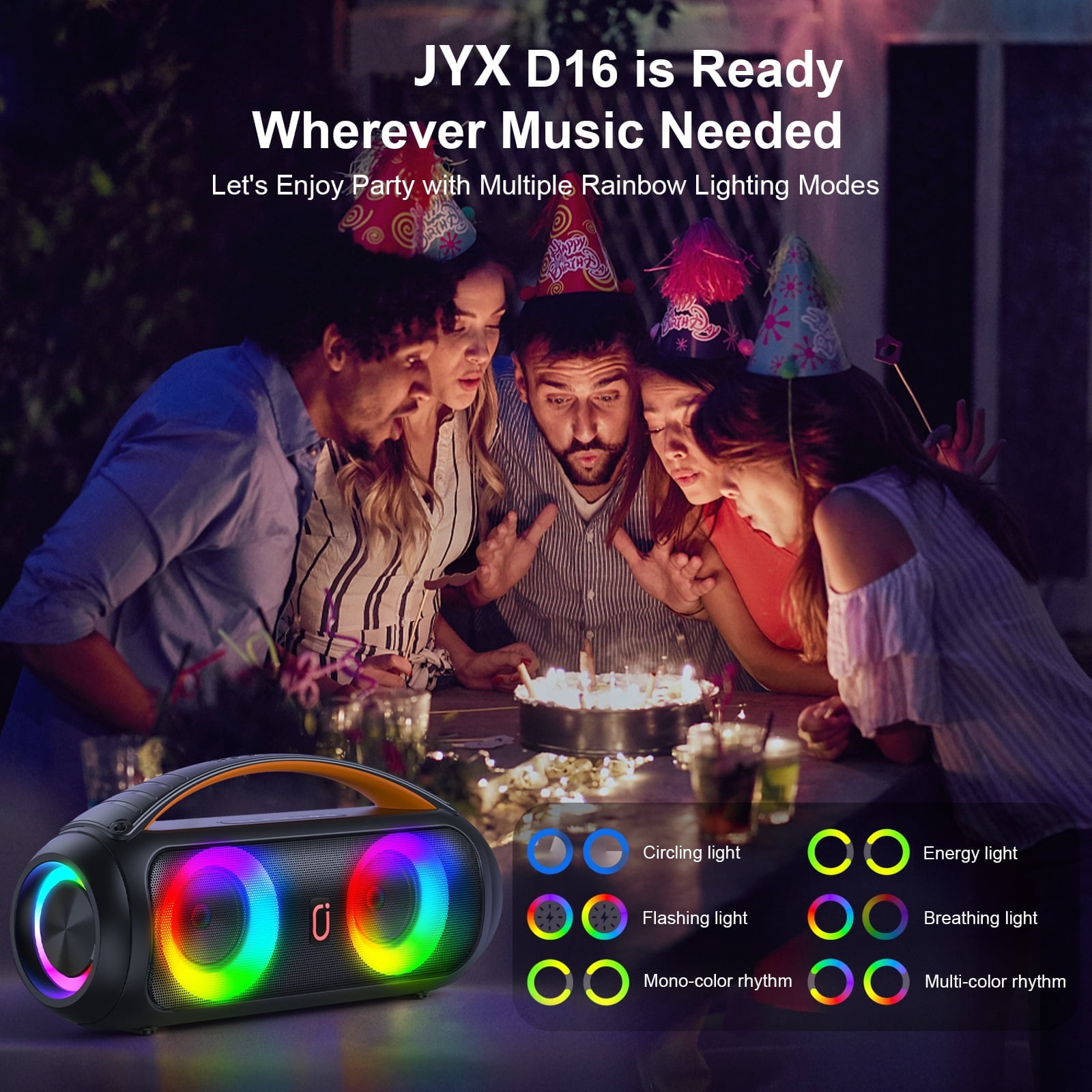 1.【HD Stereo Sound Quality & TWS Features】 This bluetooth speaker has a built-in 20W subwoofer driver to make the beats stronger. Superior high-definition stereo sound ensures powerful bass and zero distortion at any volume. JYX subwoofer supports True Wireless Stereo (TWS) technology, you can pair two of our D16 bluetooth speakers together for a more immersive listening experience. 2.【Multifunction Waterproof Outdoor Speaker with Remote Control】 With multiple connection methods, including AUX In, TF card, U disk, and Bluetooth, this outdoor speaker is incredibly versatile. You can easily connect to your favorite music source, whether it’s your phone, laptop, or tablet, and enjoy endless karaoke entertainment options. Our party speaker also comes with a remote control for easy operation, and it’s lightweight and easy to carry around. 3.【Large Battery Capacity & Long Playing Time】 The bluetooth boombox is equipped with a 8500mAh rechargeable battery that takes 5 hours to fully charge with the included TYPE-C cable. The big battery capacity allows you to play music for 24 hours continuously (standby for 72 hours). This party speaker for party is great for camping, hiking, or any other outdoor activities. 4.【8 Colorful Disco Lighting Modes】 The newest upgraded bluetooth subwoofer is designed with RGB lights to light up every corner of the party space. The colorful lights have 8 modes such as circling, breathing, and flashing. They will flow with the music rhythm, offering a festive atmosphere of happiness for parties at home, yards, gardens, or pools. 5.【Easy to Use & Perfect Gift】 No manual is needed here. The intuitive control panel of our wireless speaker makes it very easy to use. Clear, powerful bass, giving you a rock music atmosphere. The handle setting is very convenient to carry, you can easily carry it to the field, beach, party, etc., go anywhere you want. Exquisite appearance, high-definition sound quality, very suitable for music lovers, is a perfect birthday and Christmas gift. 6.【Product Specifications】 Bluetooth: 5.3 Waterproof: IPX5 Working Time: 72h Button: Volume, Switch to Previous/Next Track, Light Button, BASS Boost Function: Bluetooth, Aux In, TF Card, USB, Recording, TWS Size: 14.49*5.47*7.17 in Weight: 5.51 lbs Color: Black Package Includes: 1 × JYX Bluetooth Speaker, 1 × Remote Control, 1 × Charging Cable for JYX Party Speaker, 1 × AUX line, 1 × User Manual