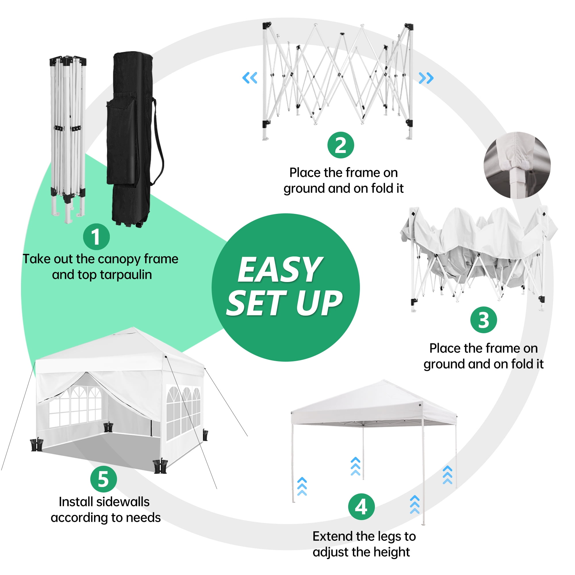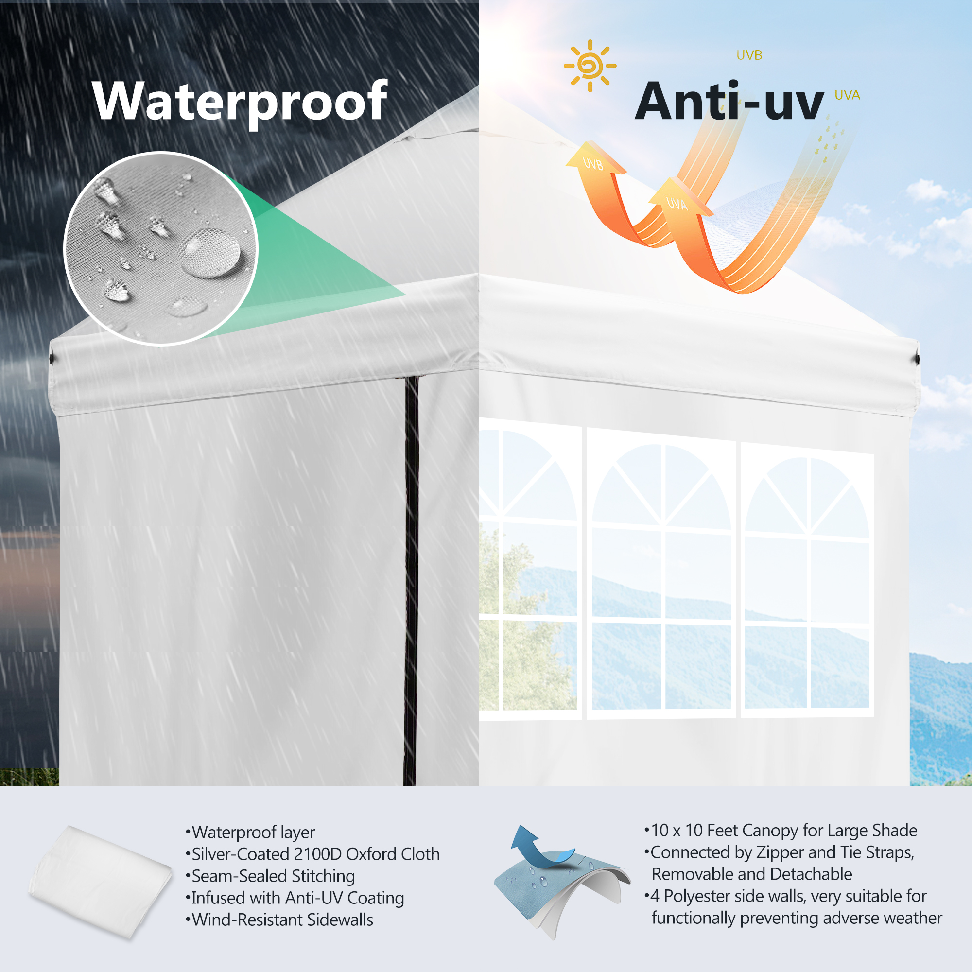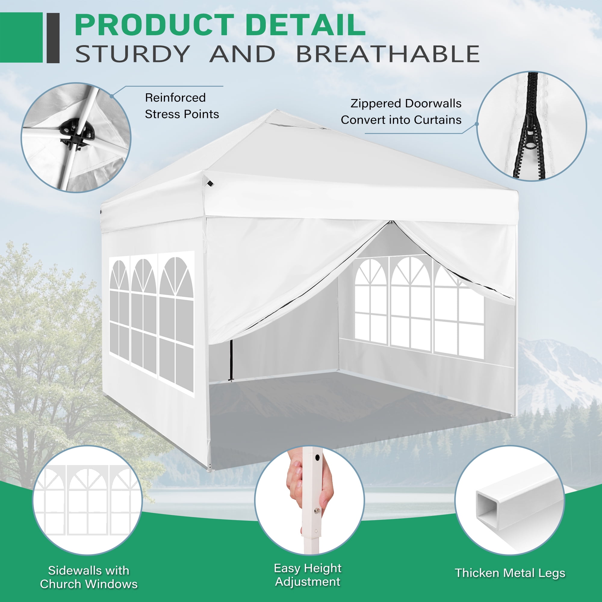 Robust Structure: Featuring a commercial-grade, full truss structure, our canopy tent is durable and wind resistant. The white-coated steel frame ensures sturdiness and longevity, truly built to last. Weather-resistant Fabric: Our high-quality canopy top cover is crafted from 500-denier polyester fabric with a silver-coated PU lining. Offering UPF 50+ and 99.98% UV blockage, it’s waterproof and suitable for year-round use. Unique Church Window Sidewalls: The four sidewalls of this tent boast distinctive church window designs, adding an elegant touch to your event while also providing protection against the elements. User-friendly Design: Thanks to its push-button system, you can easily set up this canopy with a single person. The height can be adjusted to suit your needs, and no tools are required. Comes complete with weight bags, stakes, and ropes for stability. Versatile Usage: This spacious canopy, covering 100 square feet, is perfect for various outdoor occasions such as markets, parties, picnics, camping, art shows, and public benefit activities. Also, it offers enough room for 6-8 people.