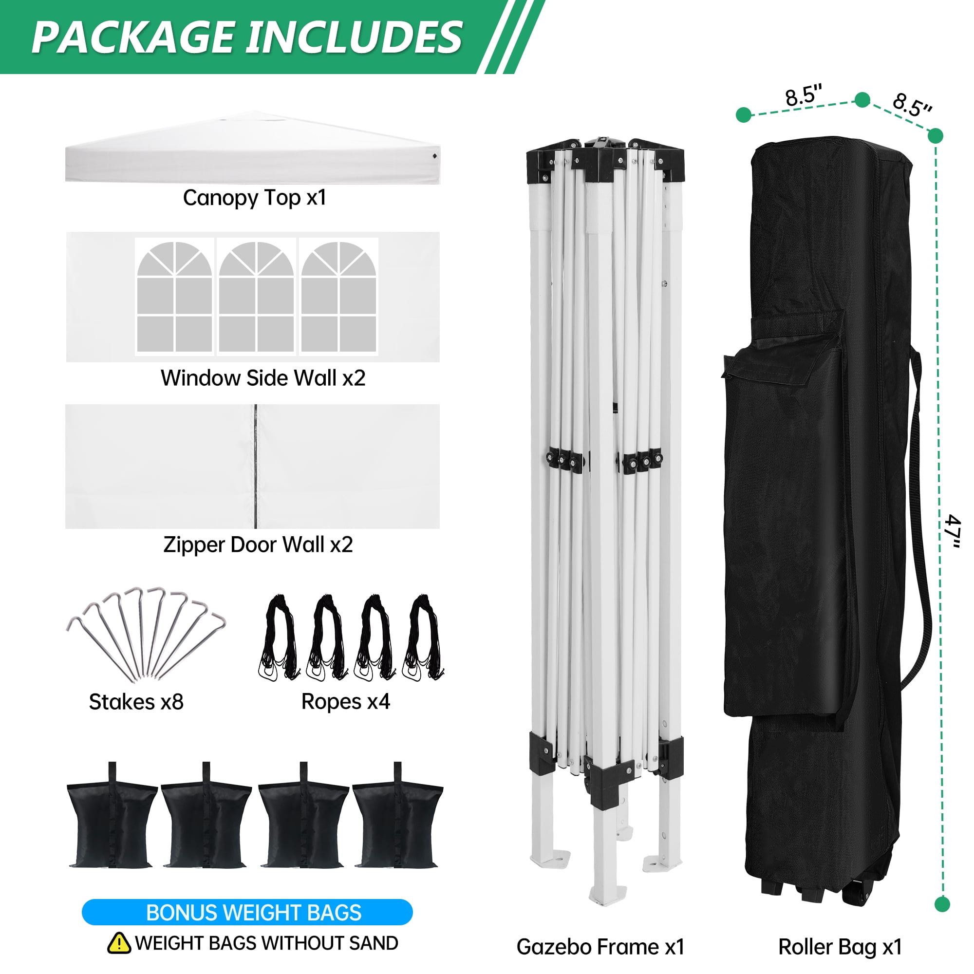 JZSDB 10′ x 10′ Pop Up Canopy Tent with Sidewalls Windows, Wheeled Bag, 4 Weight Bags – White