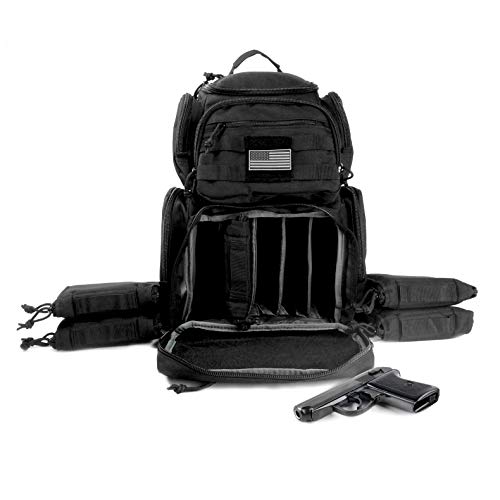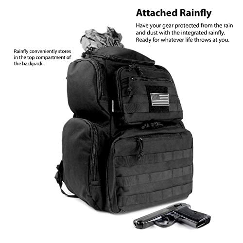 K-Cliffs High Quality Shooting Range Backpack with Rain Cover. Perfect for camping Trekking, Hiking and traveling. Heavy Duty Material: High Density 900D Polyester Color: Black Range Backpack Dimensions: 18 x 13 x 10 Package Contents: 1x Backpack, 5x pouches, 1x rainfly With US Flag Unisex, adults