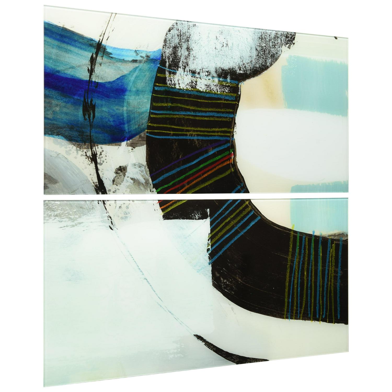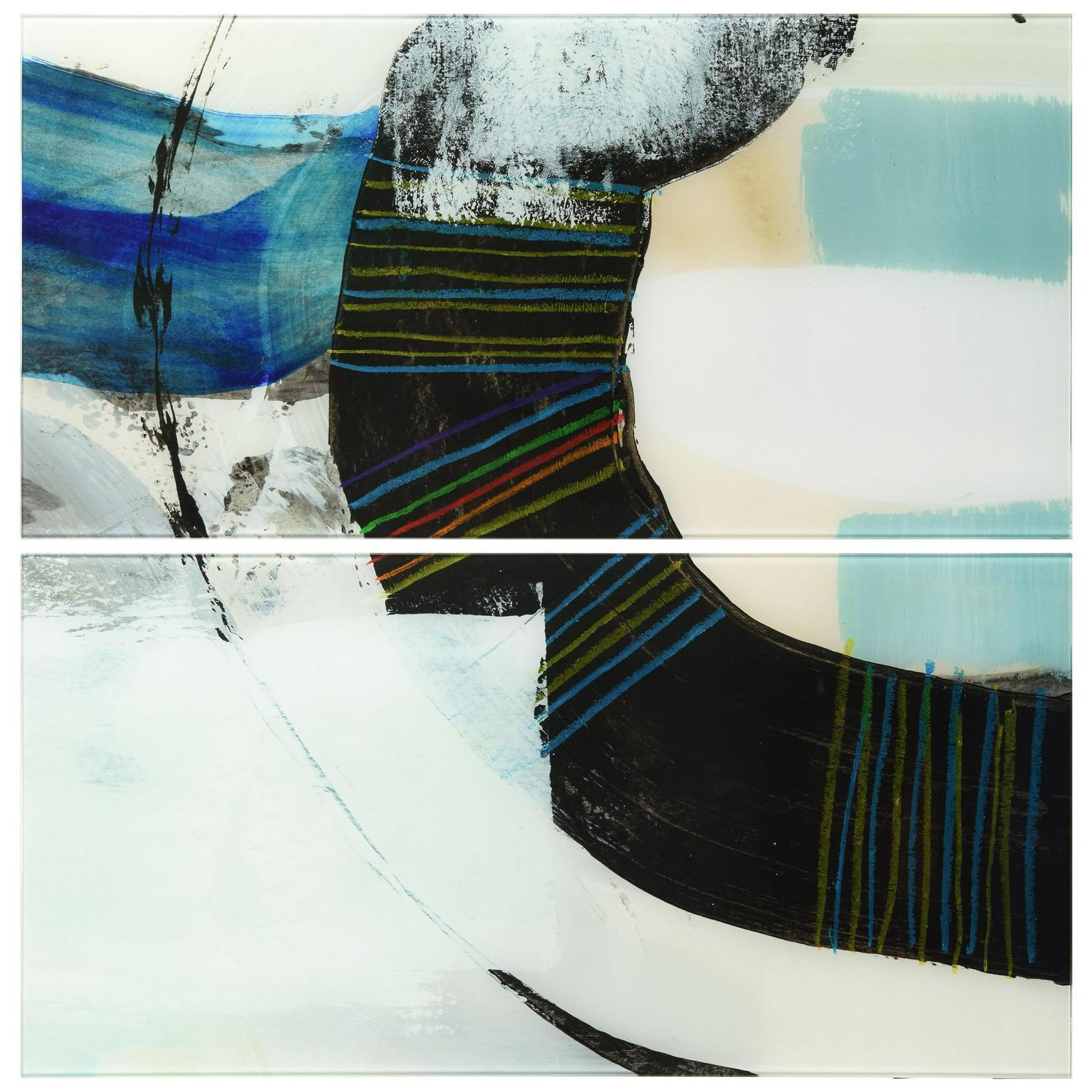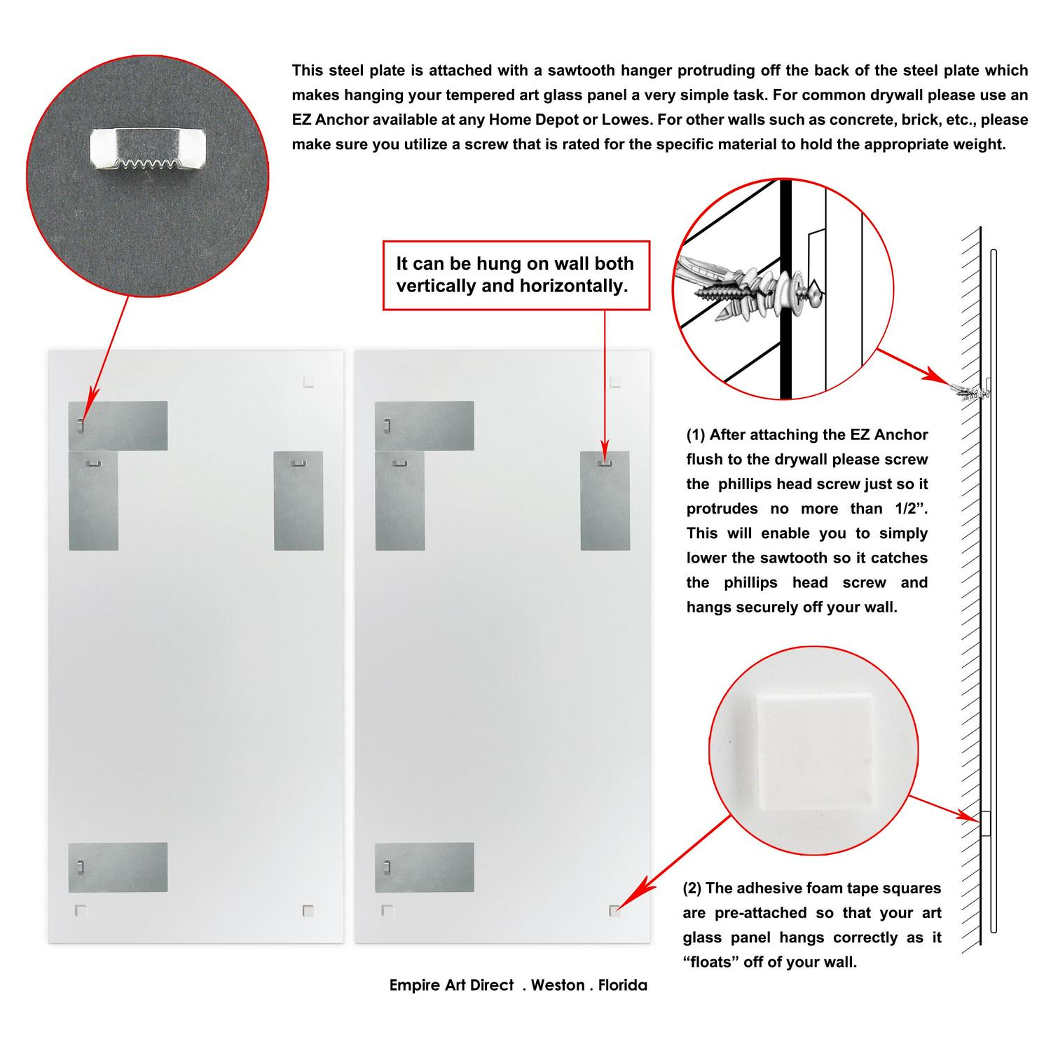 Diptych Set – 72″ x 36″ x 0.2″ each. Empire Art Directs collection of printed, frame-less, free floating, tempered glass was inspired by the French technique of Vere Eglomise in which artist’s literally painted the back of clear glass. Because of this when viewed from the front, the painting is brought to life under the depth of the glass. In collaboration with artist Jodi Fuchs, this piece displays a beautiful blue and grey abstract work of art. Strong steel hangers are attached to the back of the piece for a quick and easy horizontal or vertical installation (based on preference). Set of 2.