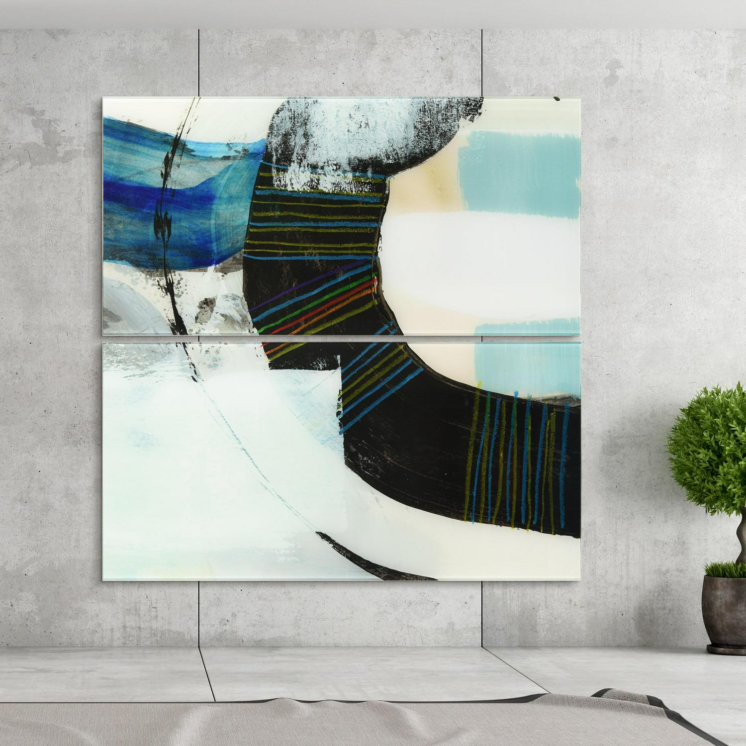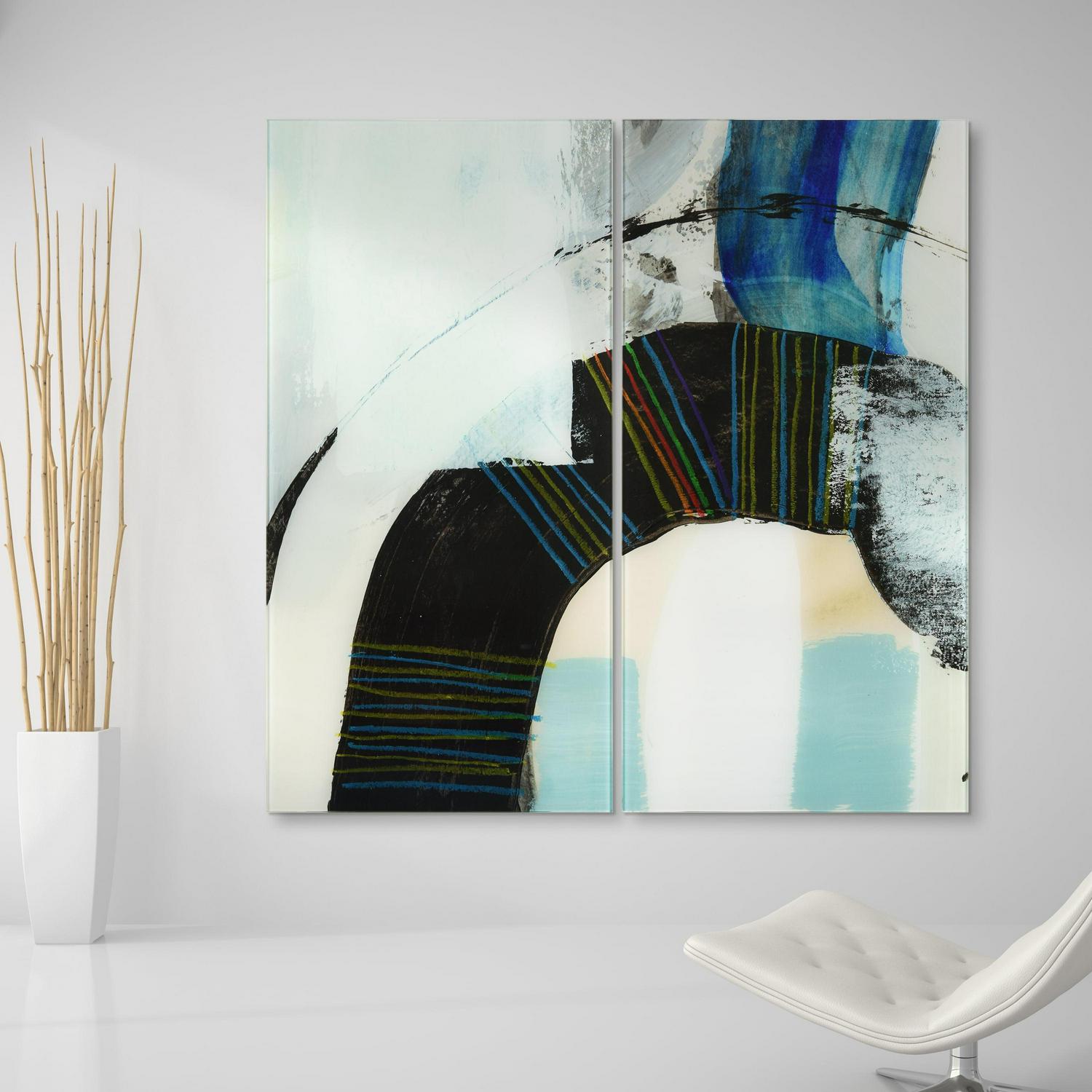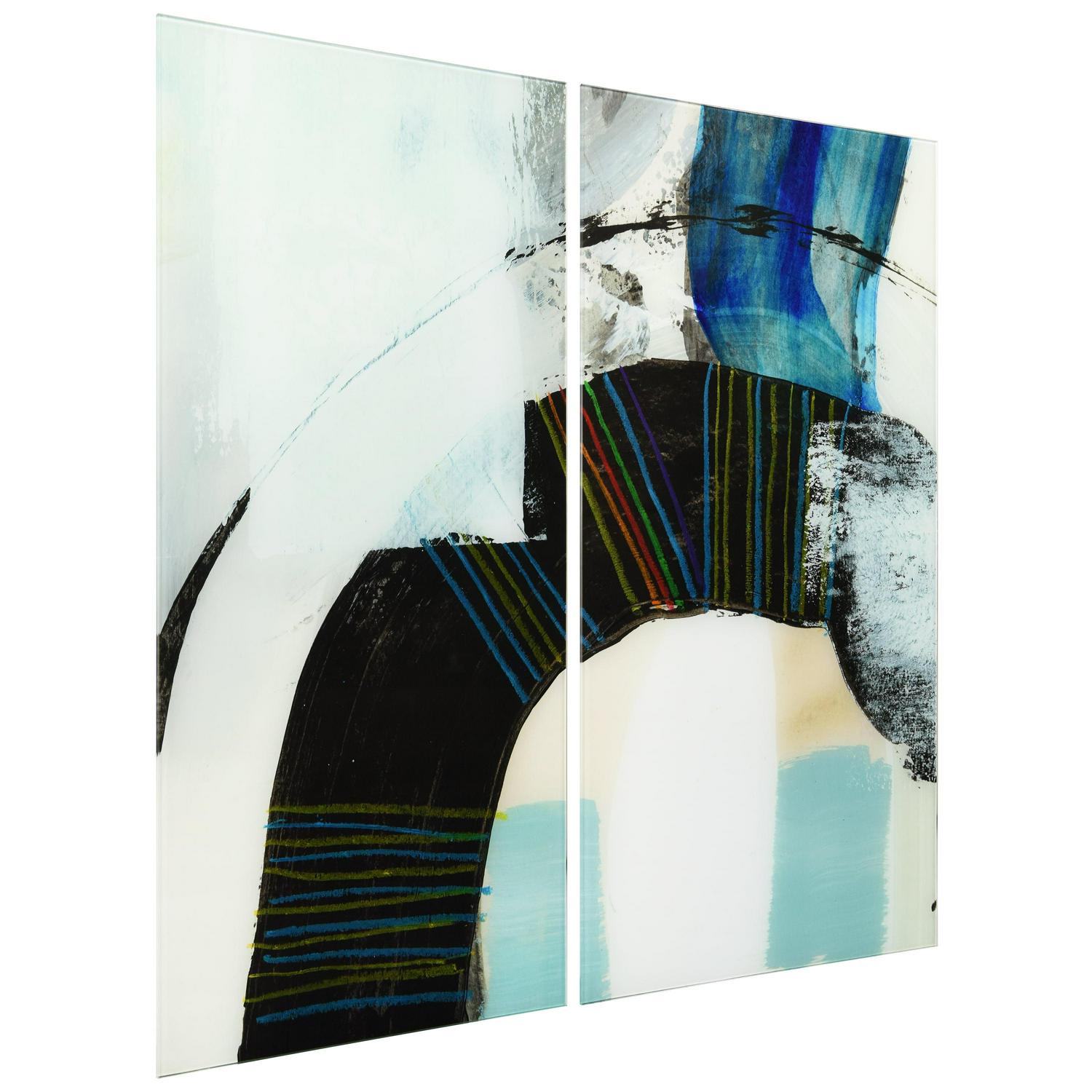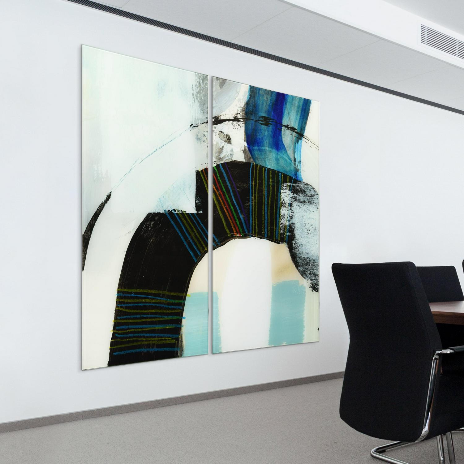 Diptych Set – 72″ x 36″ x 0.2″ each. Empire Art Directs collection of printed, frame-less, free floating, tempered glass was inspired by the French technique of Vere Eglomise in which artist’s literally painted the back of clear glass. Because of this when viewed from the front, the painting is brought to life under the depth of the glass. In collaboration with artist Jodi Fuchs, this piece displays a beautiful blue and grey abstract work of art. Strong steel hangers are attached to the back of the piece for a quick and easy horizontal or vertical installation (based on preference). Set of 2.