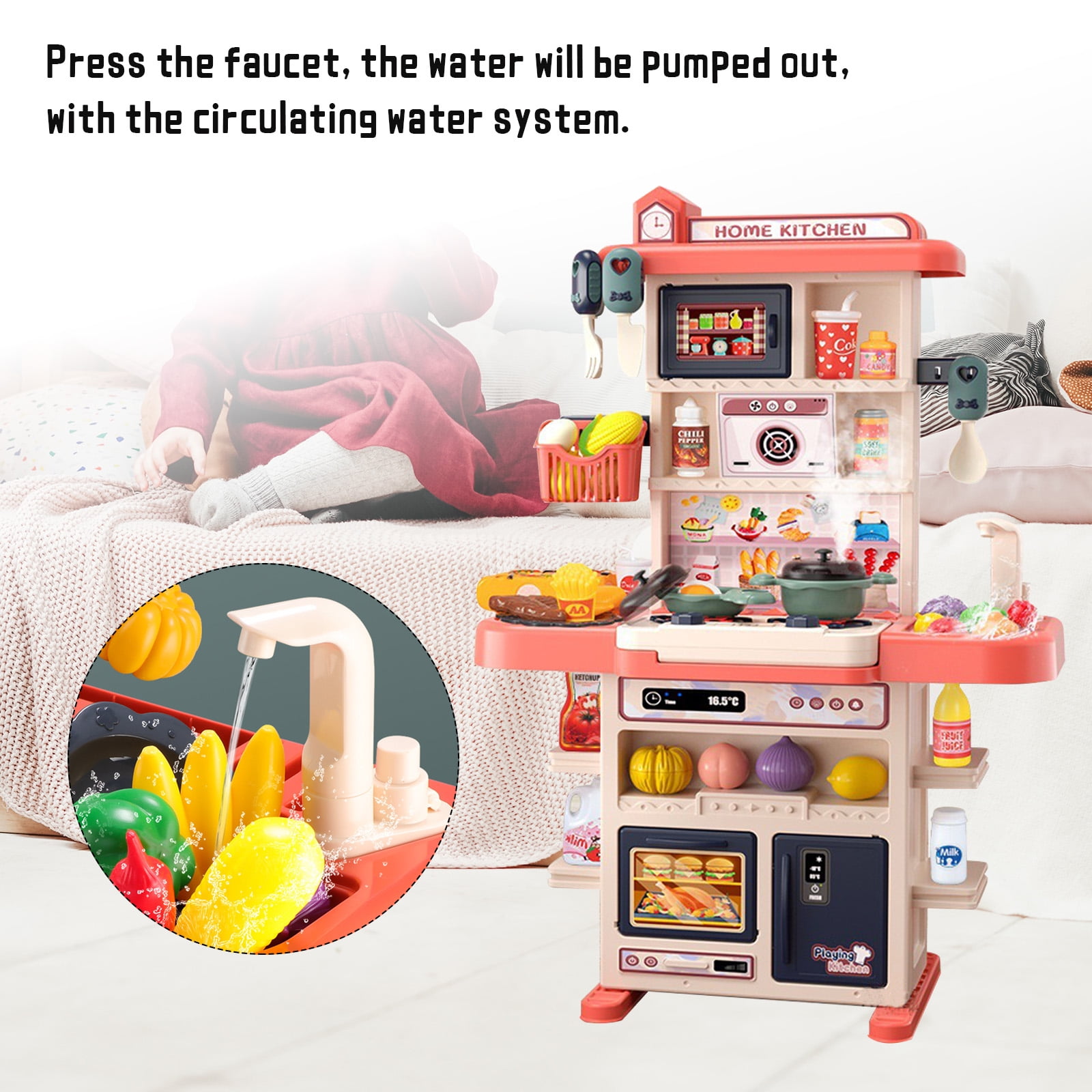 [Toddler Kitchen Playset] 43Pcs play kitchen accessories with different utensils for cooking. Kids have all the tools necessary to enjoy their cooking. Extra birthday cake and egg cooker are provided for more fun. A lot of entertainment are leaving for your kids to develop. [Kitchen Sink with Water Circulation System] The play sink toy allows kids to wash play foods and do the dishes. Push the button behind the water tap and water will come out. With water circulation system, kids’ environmental consciousness can be raised in an early age. [Function Spray & Vivid Lights] Electronic stovetop burner with working fire-inspired lights and sound cooktop adds to the role play fun! When the food is cooked, the lid will have white steam. Ideal toddler toys for age 4-6. There are steps to use the steam cooker in the description. [Premium Quality] Made of high quality ABS eco-friendly plastic, the edges are smooth and burr-free, which is safe for children. Perfect for role play, educational toy, early development for toddlers, kids intelligent learning toys. [Toys Kitchen Set for Kids] This kids kitchen playset comes with stickers and instructions, easy to assemble. Toy kitchen sets provides a whole lot of fun and skill during playtime. Kids can role-play with friends or parents and exercise their language & social skills. A never go wrong as a gift/toys which is perfect for birthday party, Christmas, holiday, festival, daily life, and cute nursery.