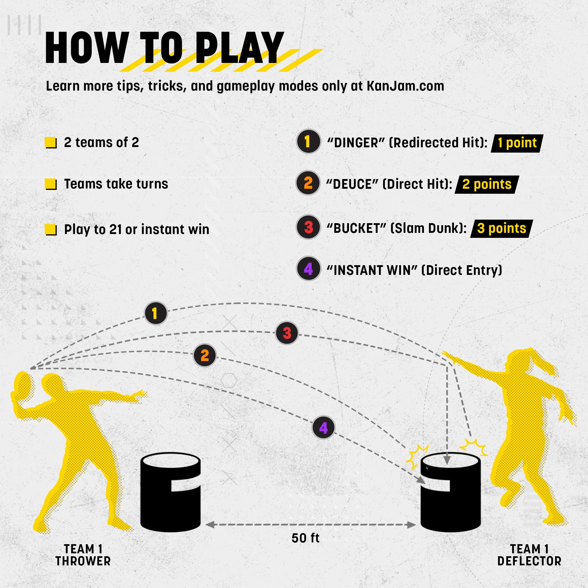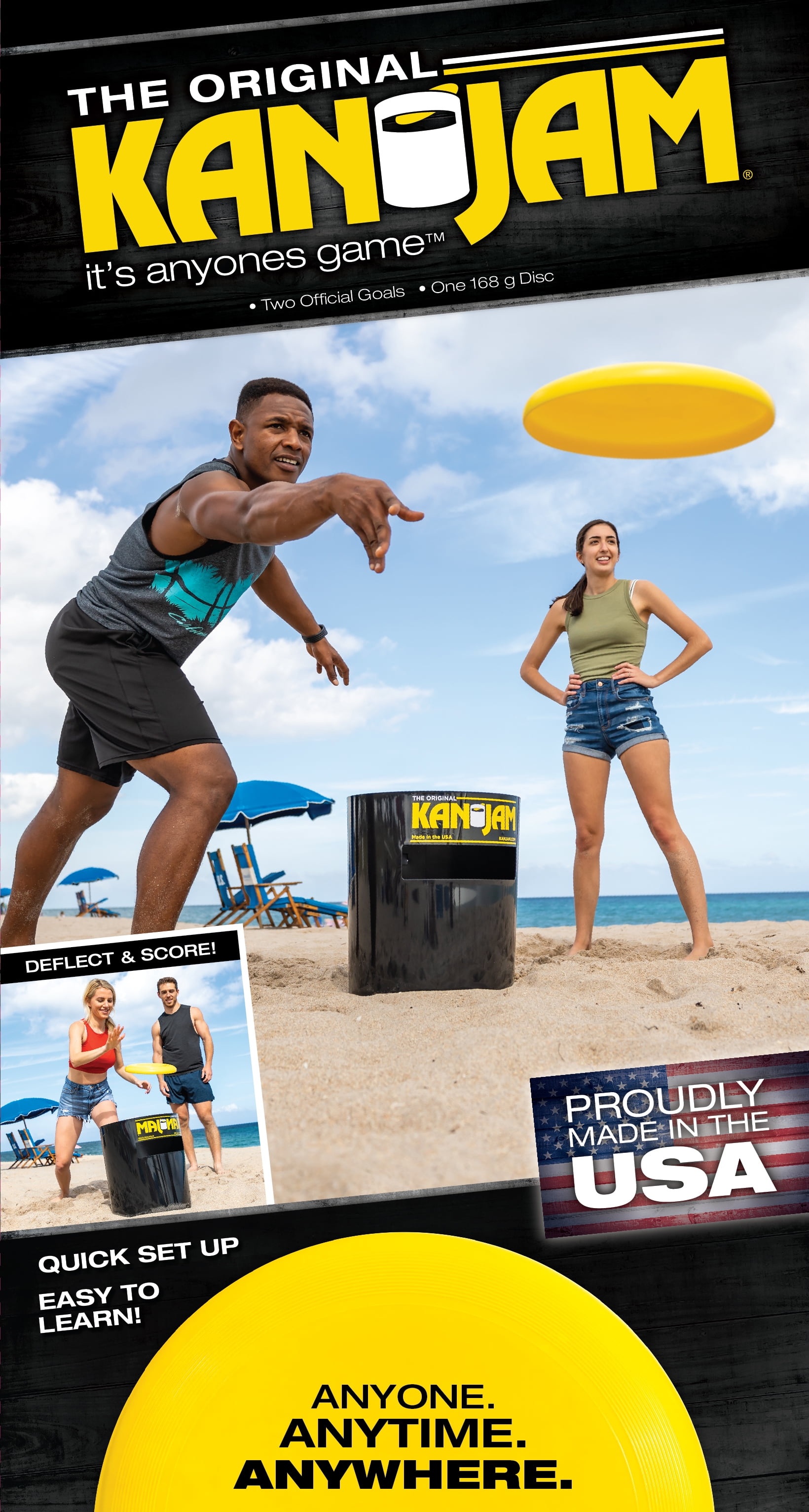 2 Great Games in 1: Kan Jam Original and Kan Jam Mini Disc Toss Game #1 OUTDOORS GAME: The No. 1 Outdoor Party Game in America: Kan Jam is tremendously fun and a popular competitive team game similar to cornhole, bean bag toss, washer toss and horseshoes. HOW TO PLAY: Take turns throwing and deflecting the frisbee across the yard, beach, or park at the goal – 21 points wins, or go pro and slot the flying disc for an INSTANT WIN! EASY SET UP: So easy to set up, you can play in seconds! FOUR PLAYER ACTION: Similar to cornhole, there are two teams of two players who stand at opposite goals and work together to score points. SET INCLUDES: (2) Kan Jam Original Goals and (1) Original Flying Disc and (2) Kan Jam Mini Goals and (1) Mini Flying Disc. PLAY ANYWHERE – Kan Jam is perfect for the backyard, the beach, the park, a tailgate, and even your living room. EASY TO STORE: Easy to store Kan Jam in your trunk, closet or garage.