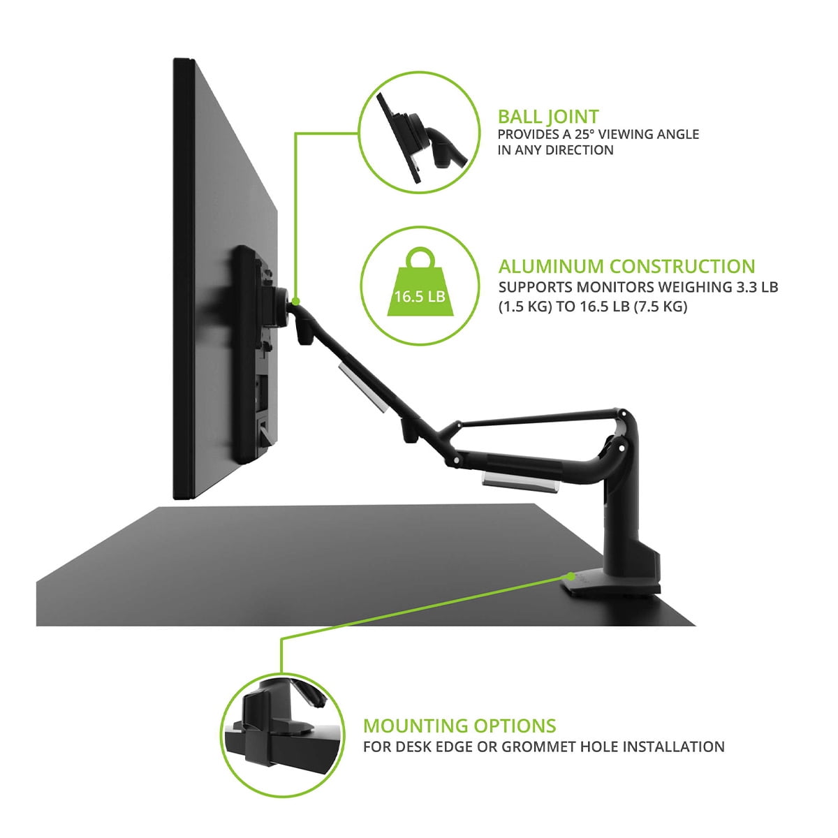 - Single articulating gas-shock arm allows for easy positioning of your monitor.