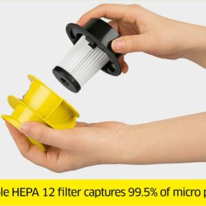 – Washable HEPA 12 filter captures 99.5% of dust, mites and micro particles