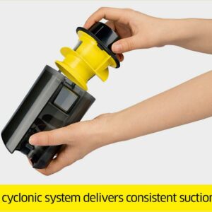 - Bagless cyclonic system delivers consistent suction power to thoroughly clean household surfaces