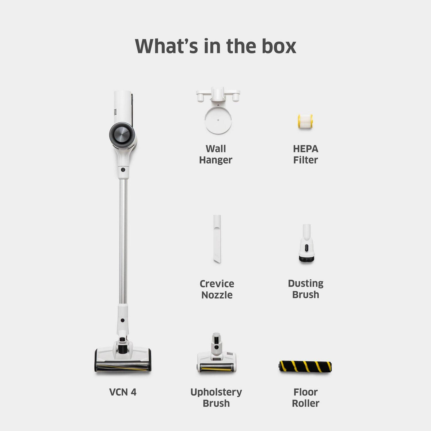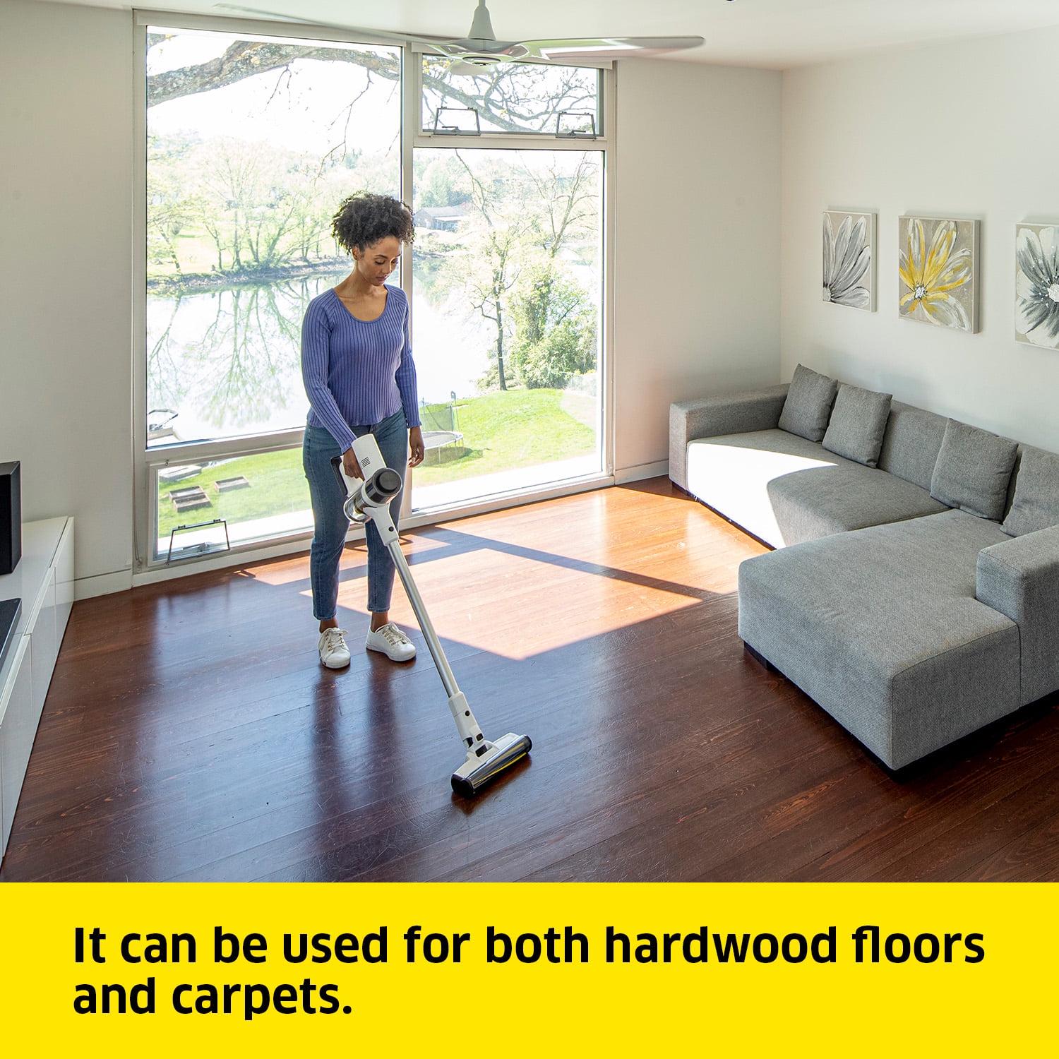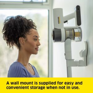 The New Kärcher VCN 4 Cordless vacuum cleaner allows freedom of movement with maximum comfort and minimal effort. Run-time of up to 71 minutes in ECO-mode provides uninterrupted cleaning while features such as boost mode make vacuuming easier. The 450 watt motor, HEPA H13 Filter, and bag-less filter system provide energy efficient use while the LCD screen shows the mode and battery life remaining. With an easy empty dust bin, it is perfect for cleaning jobs around the home. The power trigger removes the need to constantly hold down the power button when in use while the motor allows 3 stages of cleaning power: ECO, MID, TURBO. With a long shaft and lay-flat design, it can easily navigate around furniture as well as reach under the sofa. The VCN 4 Cordless includes a both a universal floor roller to seamlessly transition between carpet and hard-floor applications as well as hard-floor specific roller. Additional accessories include an upholstery roller head, a crevice nozzle, and 2-in-1 dusting brush for cleaning all around the home. A wall mount is also included for easy and convenient storage when not in use. Only 6.3 lbs.