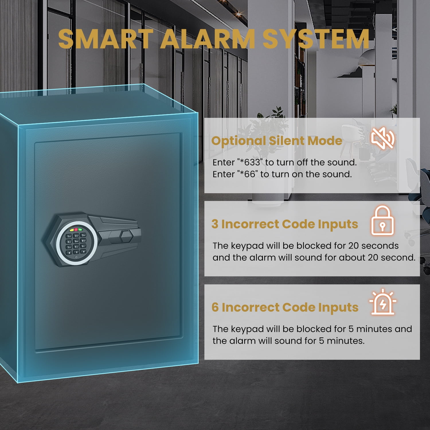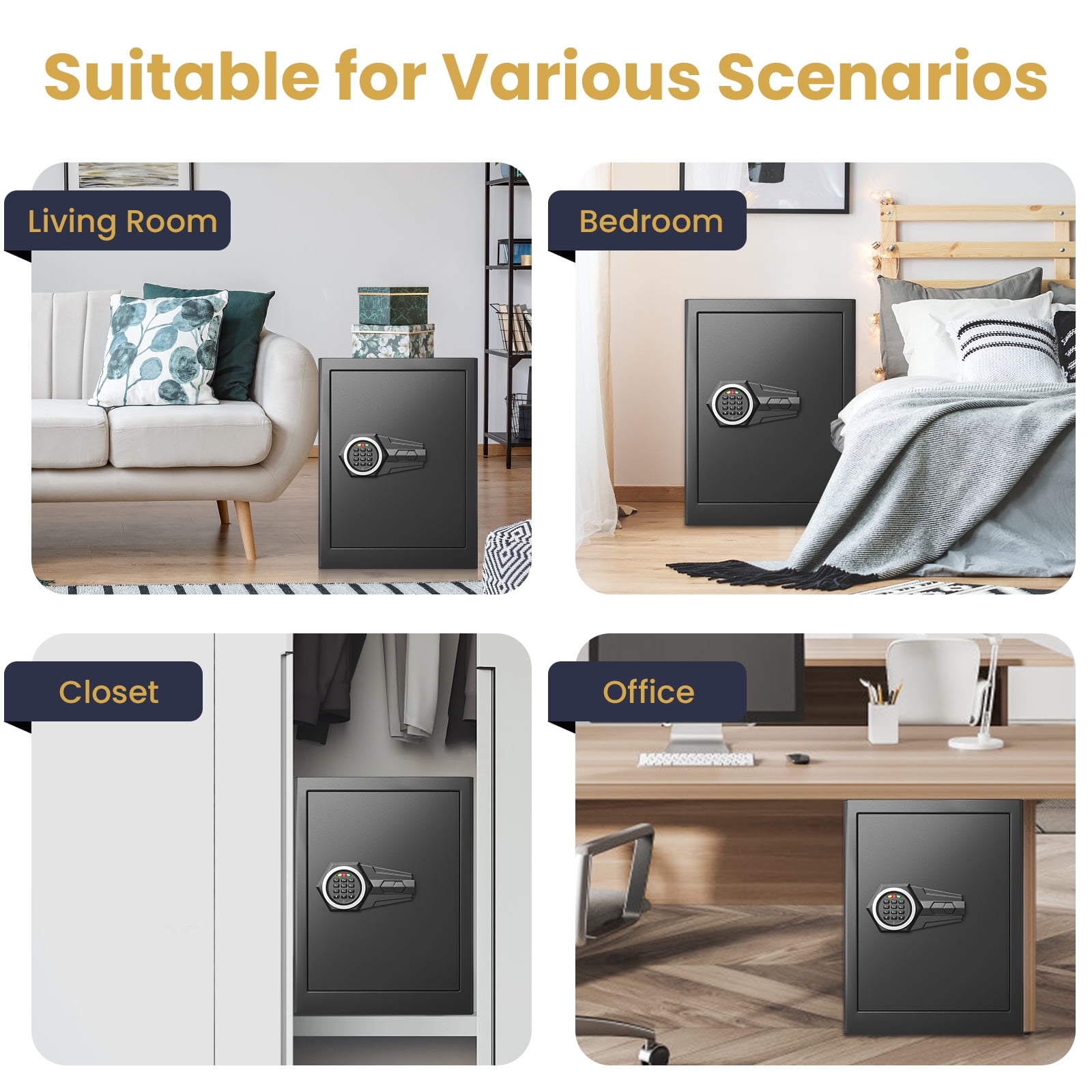 Kavey Safe Box: Kavey safe is made of solid cold rolled steel, which has an excellent anti-drilling, anti-smashing and temperature resistance performance, the scratch & stain resistant powder coat protects the safe box from rust and damage. Equipped 3 x 30mm solid locking bolts to provide more secure protection for your property. This safe can be fixed to the wall or floor using the included expansion screws for added protection against theft. Large Safe Box: Kavey Large safe has a 2.3 cubic feet large capacity. Exterior measures 12.21″D x 14.96″W x 19.68″H; Interior measures 11.61″D x 14.76″W x 19.48″H. Equipped with one removable shelf, you can remove or install it according to your flexible daily storage needs for valuables like money, jewelry, gold, camera, medicine, ID documents, pistol etc. Besides, the leather interior not only can better protect your belongings from scratches, but also adding luxious appearance. Self-locking Keypad: After 3 consecutive incorrect password, the keypad will be automatically locked for 20 S, a dripping alarm will sound at the same time; After 6 consecutive incorrect password, the keypad will be automatically locked for 5 minutes, a dripping alarm will sound at the same time. During this process, any input on the keypad is invalid, which can add extra protection to this digital safe. You can use the emergency key to open the safe and remove the battery to stop the beeping. UPGRADE MUTE FUNCTION: This safe box can mute the sound, if you don’t want the safe to make a sound, just press (*+633) to turn on the mute function. When you encounter danger and need to open the safe, the safe will not make any sound, will not disturb your family. REMOVABLE SHELF & LED LIGHT: The 2.3 cubic safe box features one removable shelf, providing flexible storage options for your belongings, you can adjust it according to your own needs. Besides, the internal LED light allows you to quickly find what you need in the dark. COMPLETE ACCESSORIES & 24/7 CUSTOMER SERVICE: What you get: 1*New Kavey 2.3 Cub Large Safe Box, 2*Emergency Keys, 4*Expansion Screws, 1*Emergency Battery Box, 1*User Manual. The safe comes with a lifetime warranty and 24/7 online customer service, as well as a lifetime key matching service. If you have any questions, feel free to reach out to us.