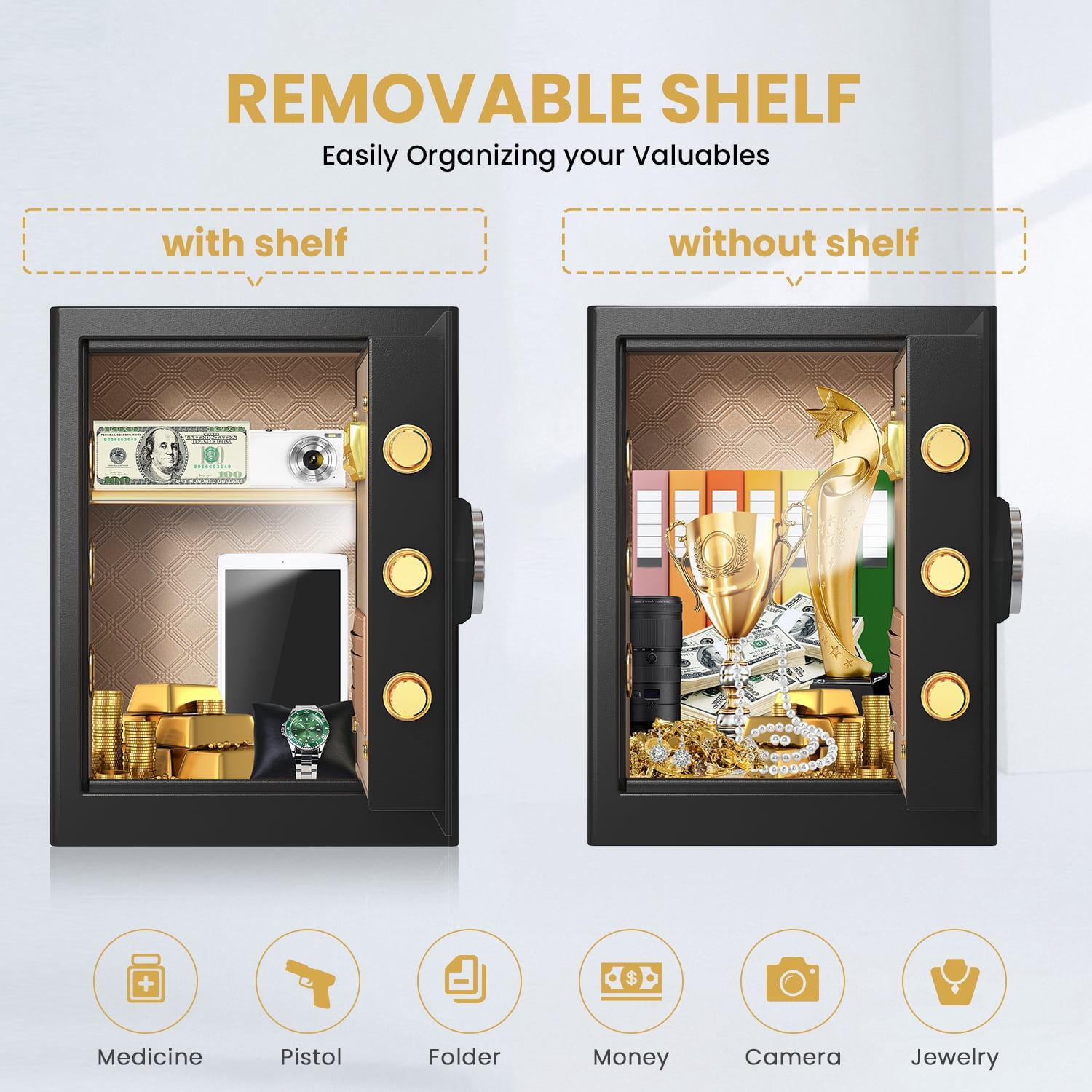 Kavey 2.3 Cub Large Safe Box, Home Safe with LED Light and Removable Shelf, Money Safe with Key Hook & Document Bag, Safe for Money Jewelry Document Valuable