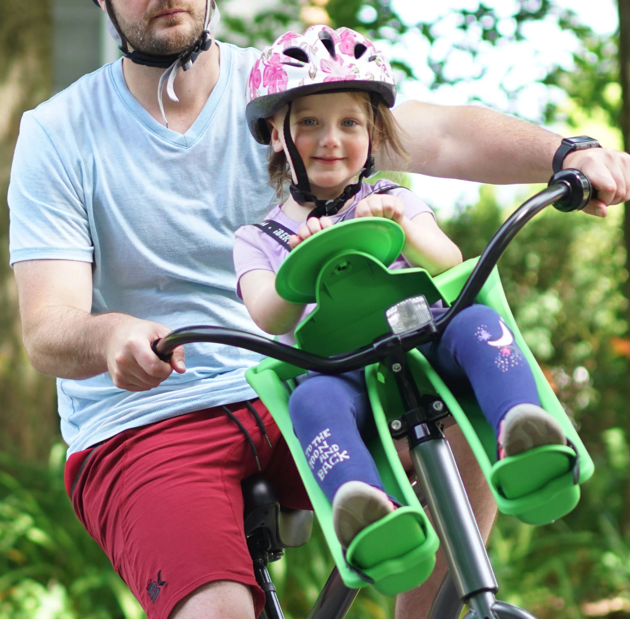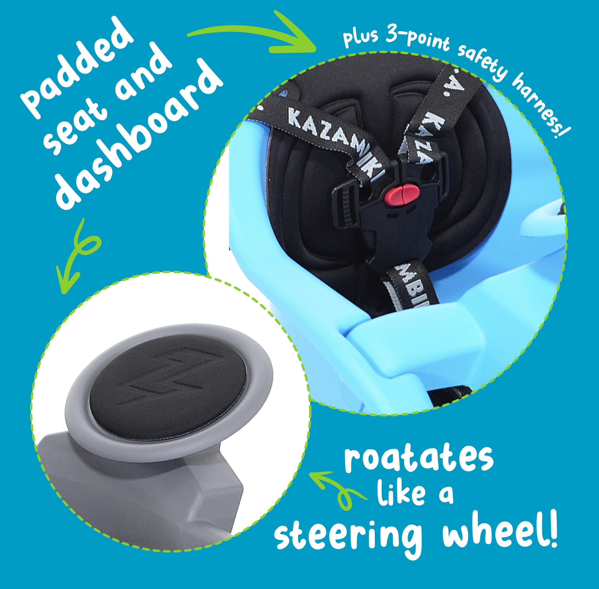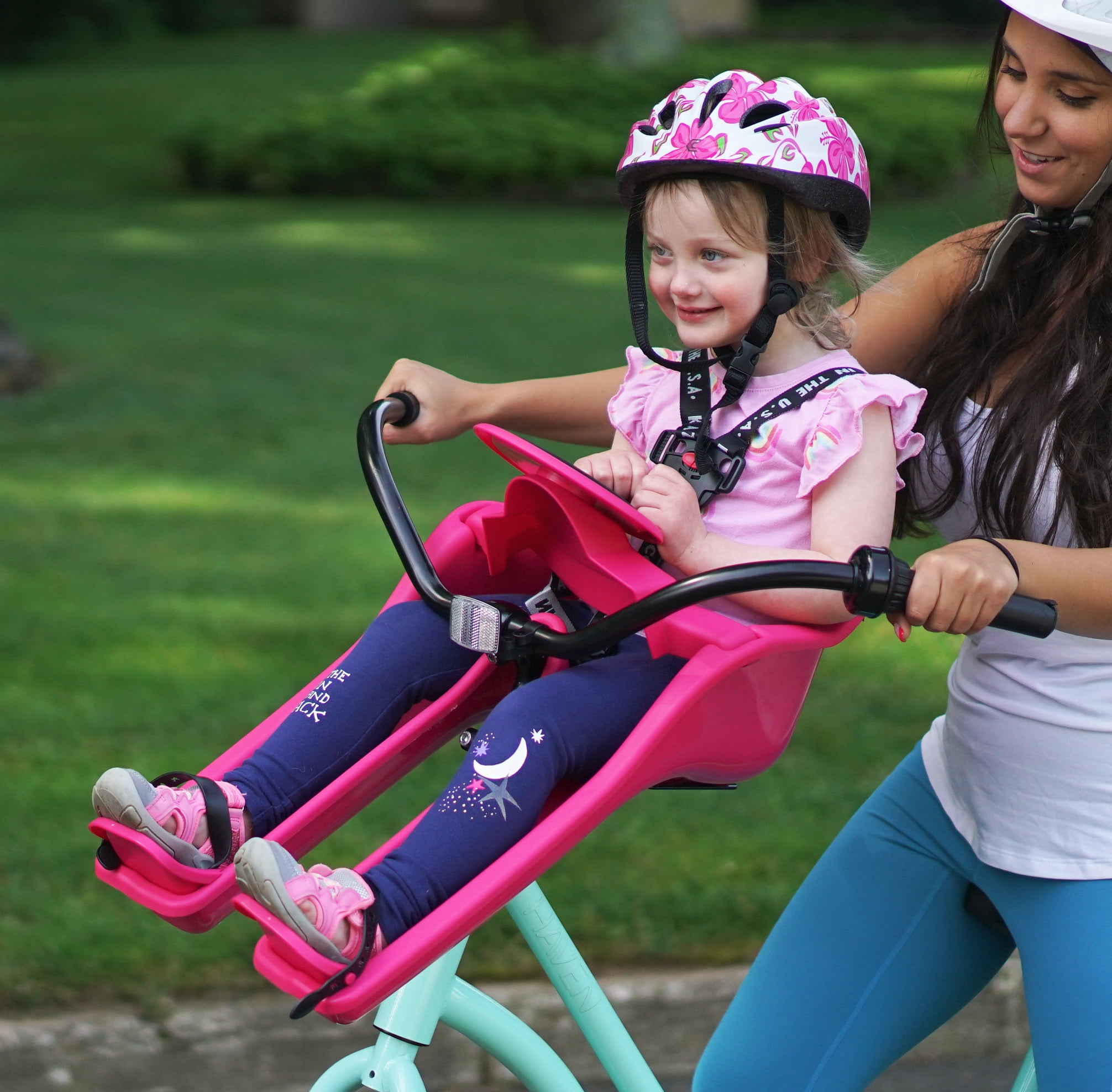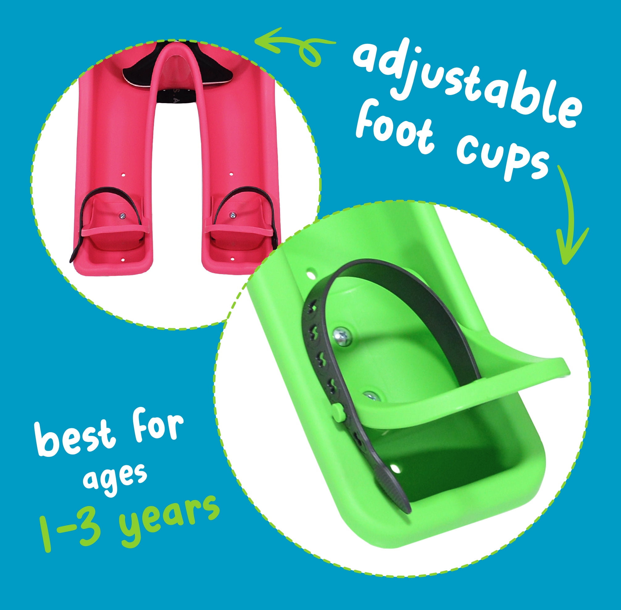Durable and Weather/UV Resistant Plastic Shell Front Mounting System Attaches to the Stem of Nearly Any Bike 3 Point Safety Harness Adjustable Foot Cups and Straps Deluxe, Waterproof & Removable Padded Dashboard and Seat No Assembly Required Recommended Age: 8 mo – 3 years Max Rider Weight: 38lbs