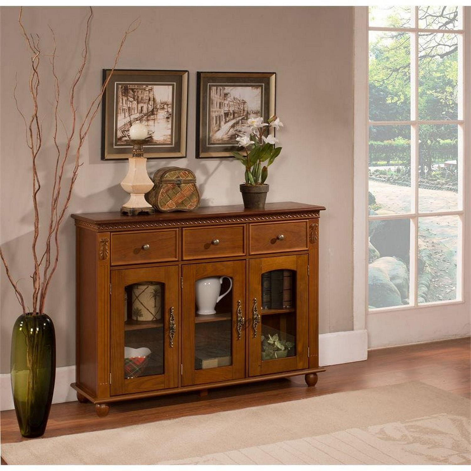 Use this lovely K&B Furniture C1243 Console Table in the entryway, living room, or hallway for a bit of style and storage. It has three glass doors each with two shelves inside that let you display books or decorative items. Three spacious drawers offer even more storage space to help you keep clutter hidden.