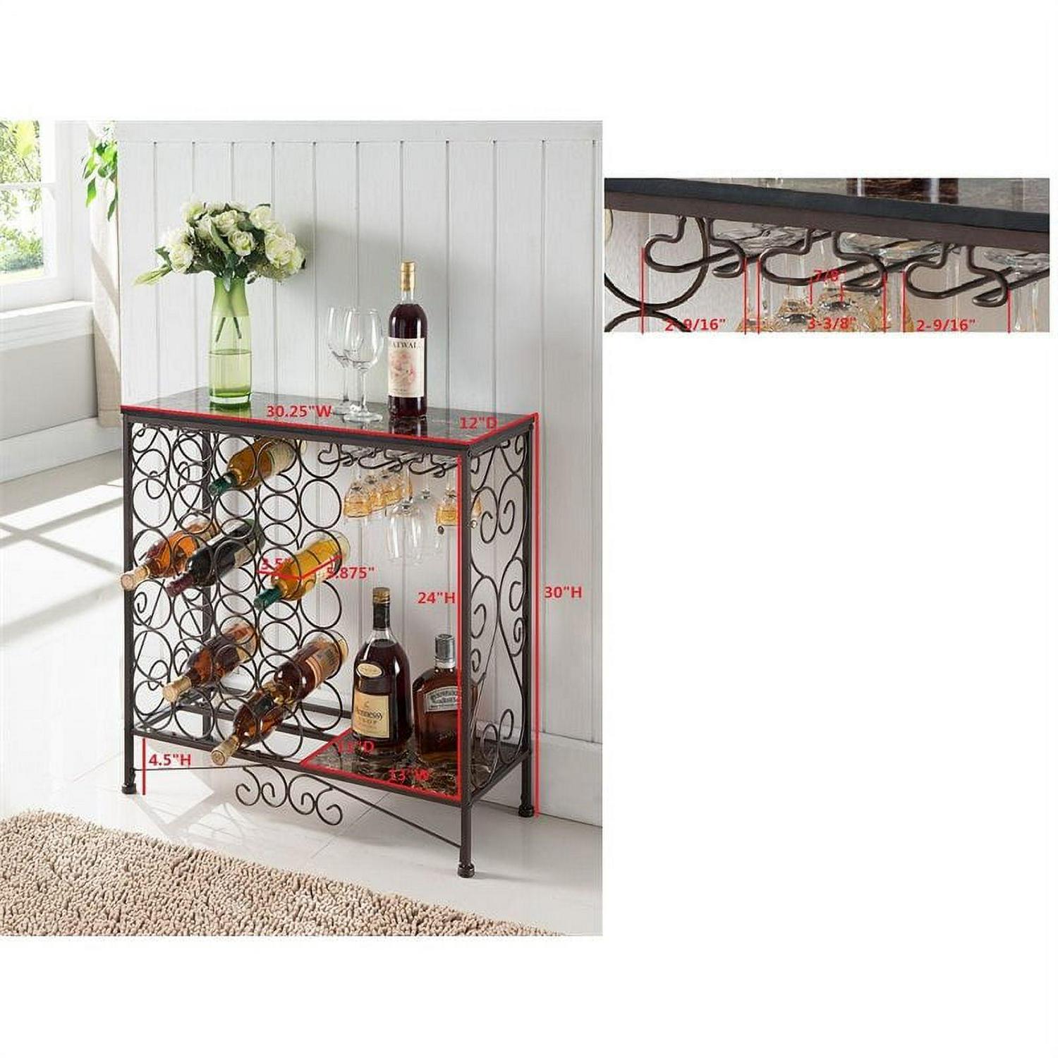 The K&B Furniture Bronze Metal Wine Rack is a winning combination of function and elegance. It boasts durable metal and wood construction, and can hold up to 24 bottles of your favorite reds and white. This wine rack is equipped with three racks to hold plenty of wine glasses. The smooth faux marble top is the perfect spot to pour and serve.
