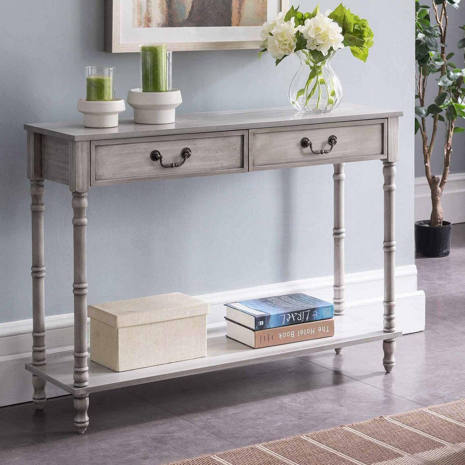 Spindle legs and ornate hardware lend the K&B Furniture Rustic 2 Drawer Console Table an elegant traditional look. This wood-crafted console table is finished in a refined, yet rustic shade of oak gray. Two drawers and a lower shelf provide versatile storage.