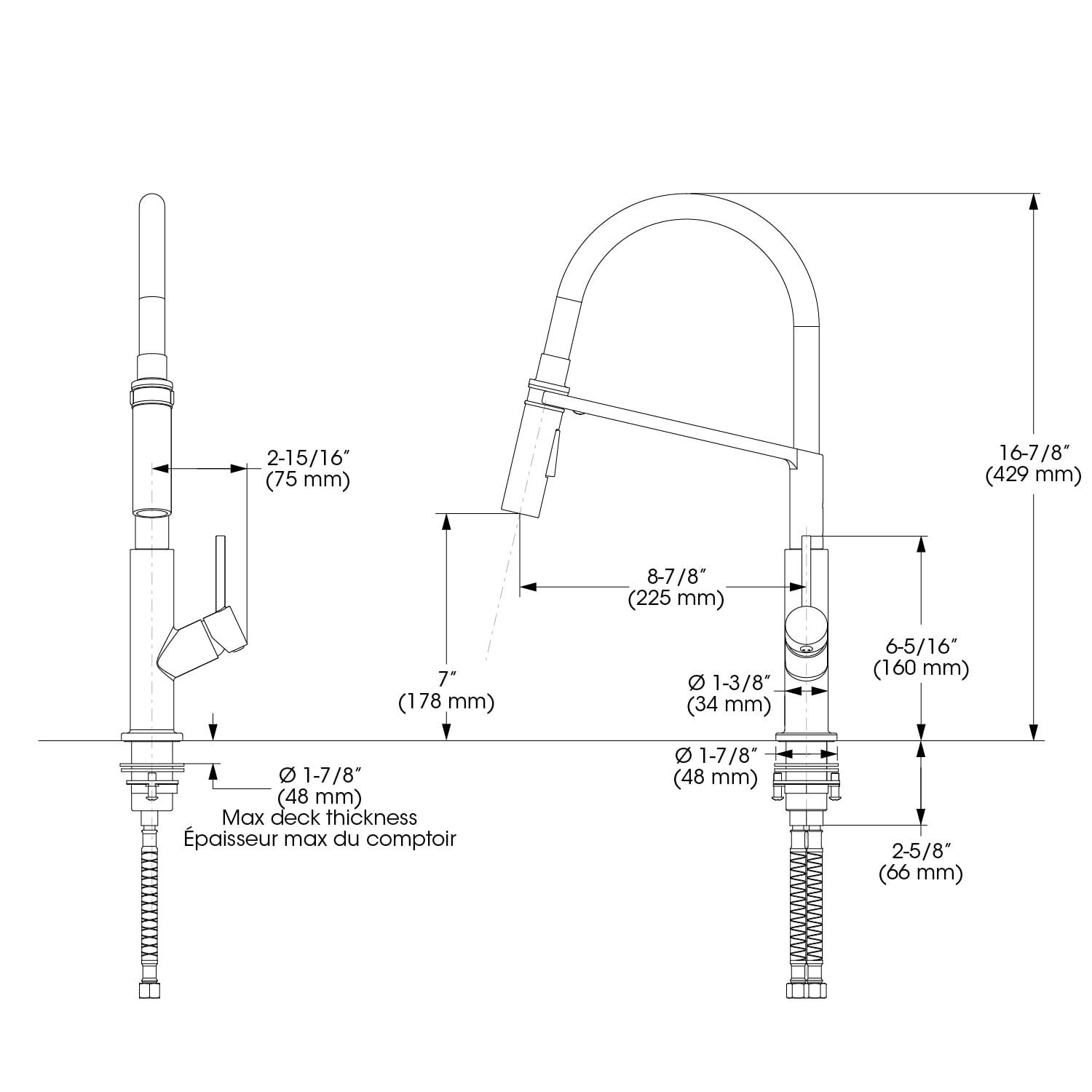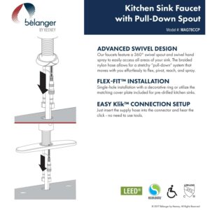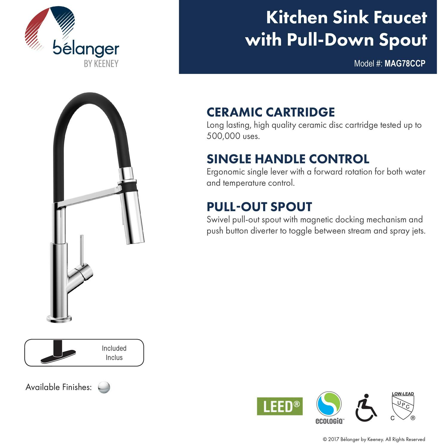 Belanger faucets are beautifully designed to improve your home as part of our designer collection. With a name inspired by its magnetic docking mechanism, this Magno facuet also possesses a high arc pull-out spout and a simple aesthetic that complements both minimalist and contemporary decor. It features a push-button diverter so you can toggle between stream or spray jet selection as well as a cover plate for single or 3-hole installation. Its cylindrical design assures a comfortable in-hand fit and an easy cleaning job with a high-quality ceramic disc cartridge for maintenance-free use. You can install with confidence knowing Belanger products are backed with a Limited Lifetime Warranty.