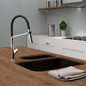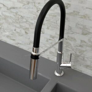 – Swivel pull-down spout with push-button diverter for 2 functions: stream and spray jets