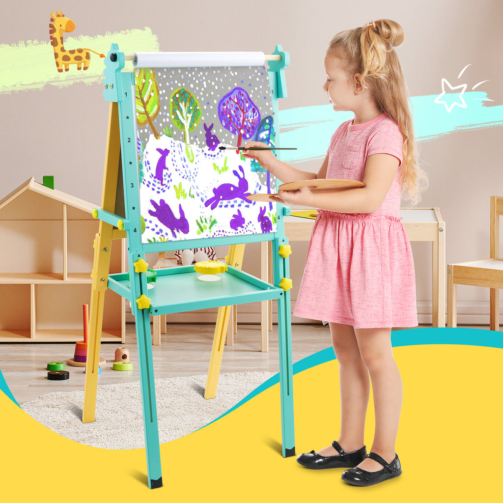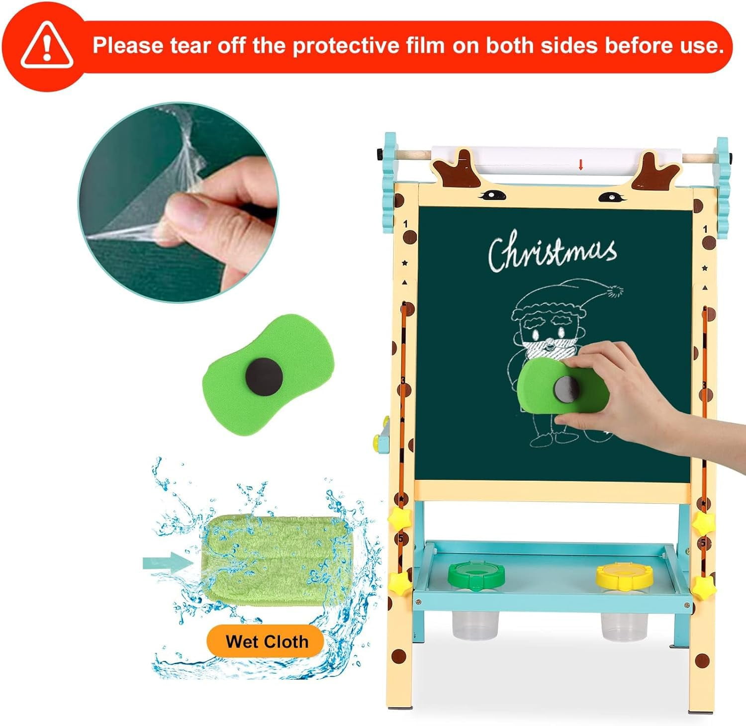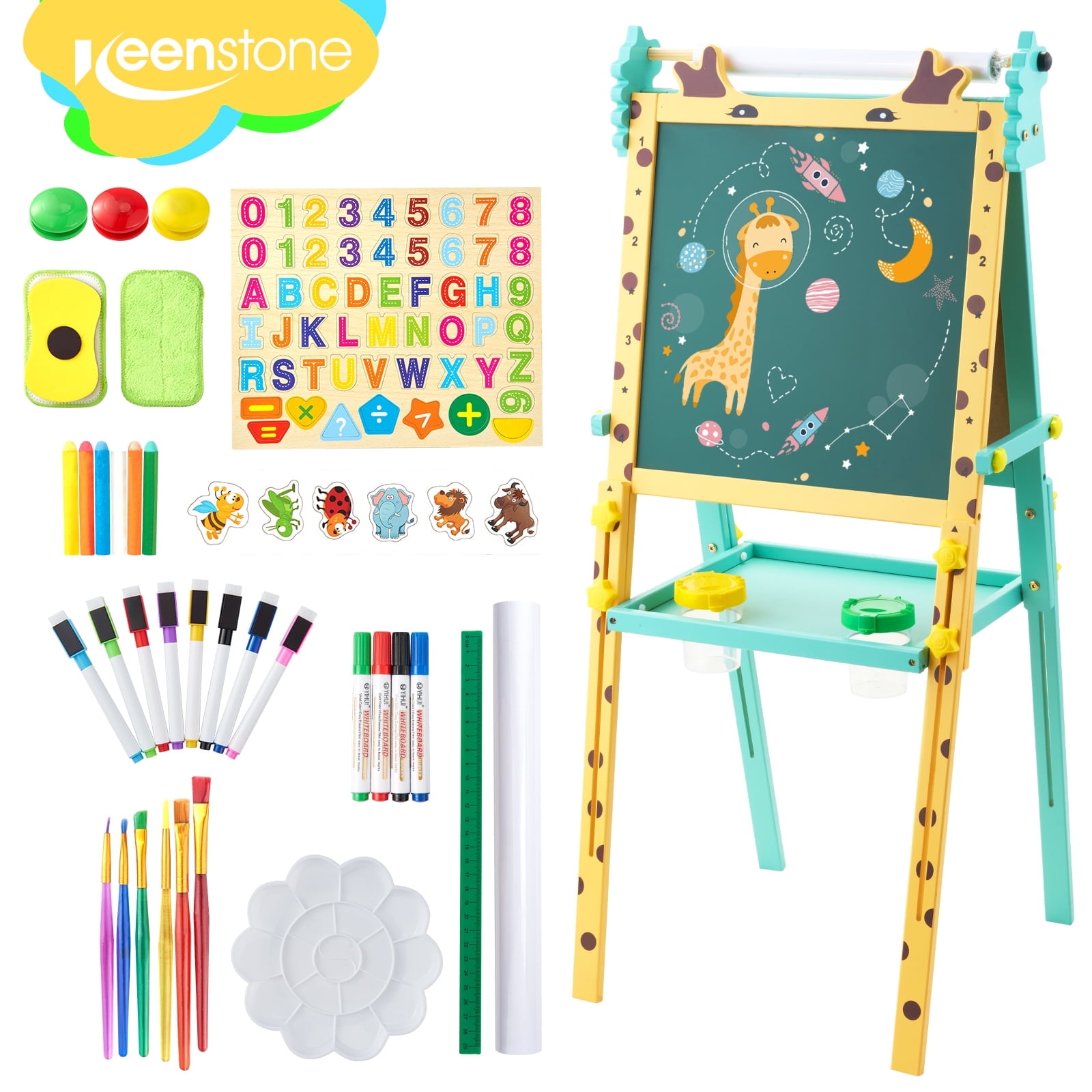 🦌【Deer 𝟯-𝗜𝗡-𝟭 Art Easel】 The Keenstone kids painting easel set features a magnetic chalkboard easel for kids on one side, a kid’s magnetic white board on the other side, & a refillable paper roll for painting & drawing.The high-end 3-in-1 kid’s easel is made of natural pine wood. With an 17-inch paper roll attached at the top. 🧲【MAGNETIC EASEL】 Both sides of the easel are magnetic, adding yet another fun way to play! The tray beneath the drawing board is specially designed for convenient storage & rigidity. 💏【CHILD-FRIENDLY DESIGN】 Child’s easel features a sturdy wooden frame, is easy to assemble. It is more stable with non-slip foot rubber cover and triangular vertical easel design. The edges of the easel were all polished and the inverted corners were also rounded to avoid abrasion and bumps, caring with the growth of children. 💭【ADJUSTABLE HEIGHT 】 The legs are easily height adjustable, from 32″ to 52″, making it the perfect standing easel for children of all ages, from a toddler easel to a 13-year-olds easel. ✏️【Versatile and Multi-Purpose】 This children’s art easel can be used for various activities like drawing, painting, and practicing handwriting, making it a perfect tool for creative play and educational development. It’s also a magnetic drawing board for kids, which provides endless fun and educational opportunities. Whether in the classroom or at home, our easel is perfect for a range of activities that your child will love! 🎁【BEST CHOICE EASEL SET】 The chalkboard easel suitable for homeschooling, school enlightenment, training class, parent-child activity. A perfect art toys gift for Birthday, Christmas, Children’s day gift. 💥【ACCESSORIES BUNDLE】 This kids art easel includes a huge 𝟭𝟬𝟬+ pcs: Apron, Paints & Pots, Brushes, Chalk, Markers, Eraser & Cloth, Ruler, Paper Roll, & Magnetic Nos., Letters & Animals.
