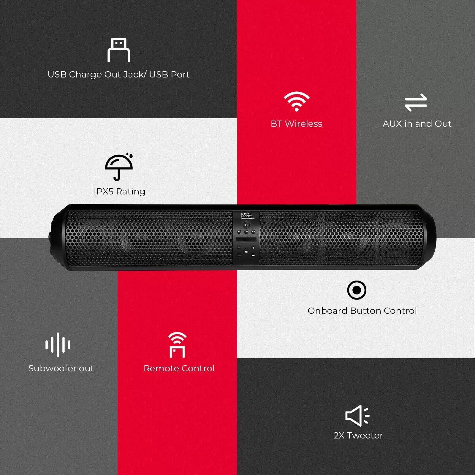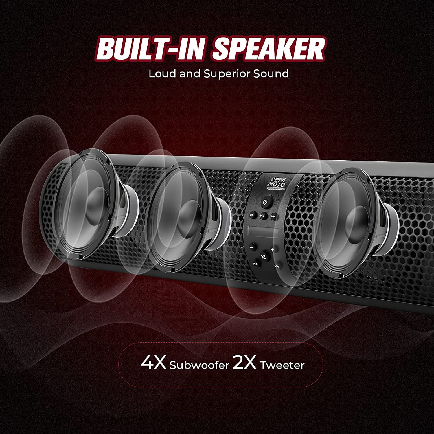 1. Many Connection Options: The Kemimoto utv sound bars audio system provides an easy setup for users with its wireless built-in Bluetooth connection, 3.5mm aux input, and USB charging port. 2. Universal sxs speakers allows both iOS and Android systems to connect easily. If you wanna enjoy clearer music during a ride., you can use 3.5mm aux input on your soundbar for connection to headphones. 3. 2X Tweeter and 4X Subwoofer 4. Wireless Bluetooth and Remote Control 5.Condition: New