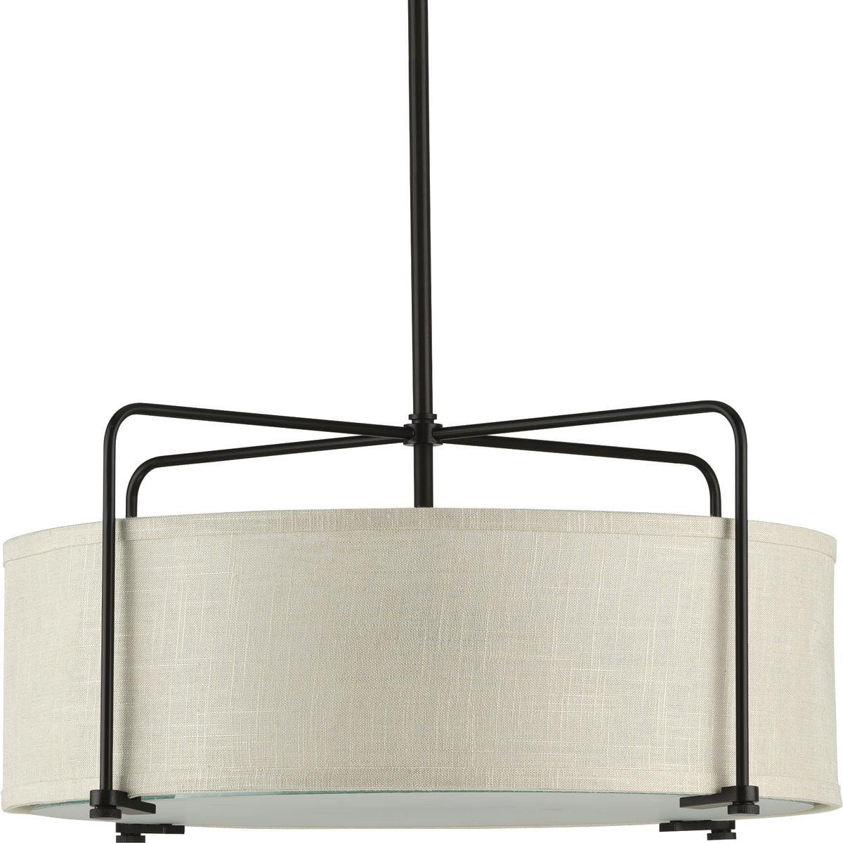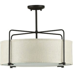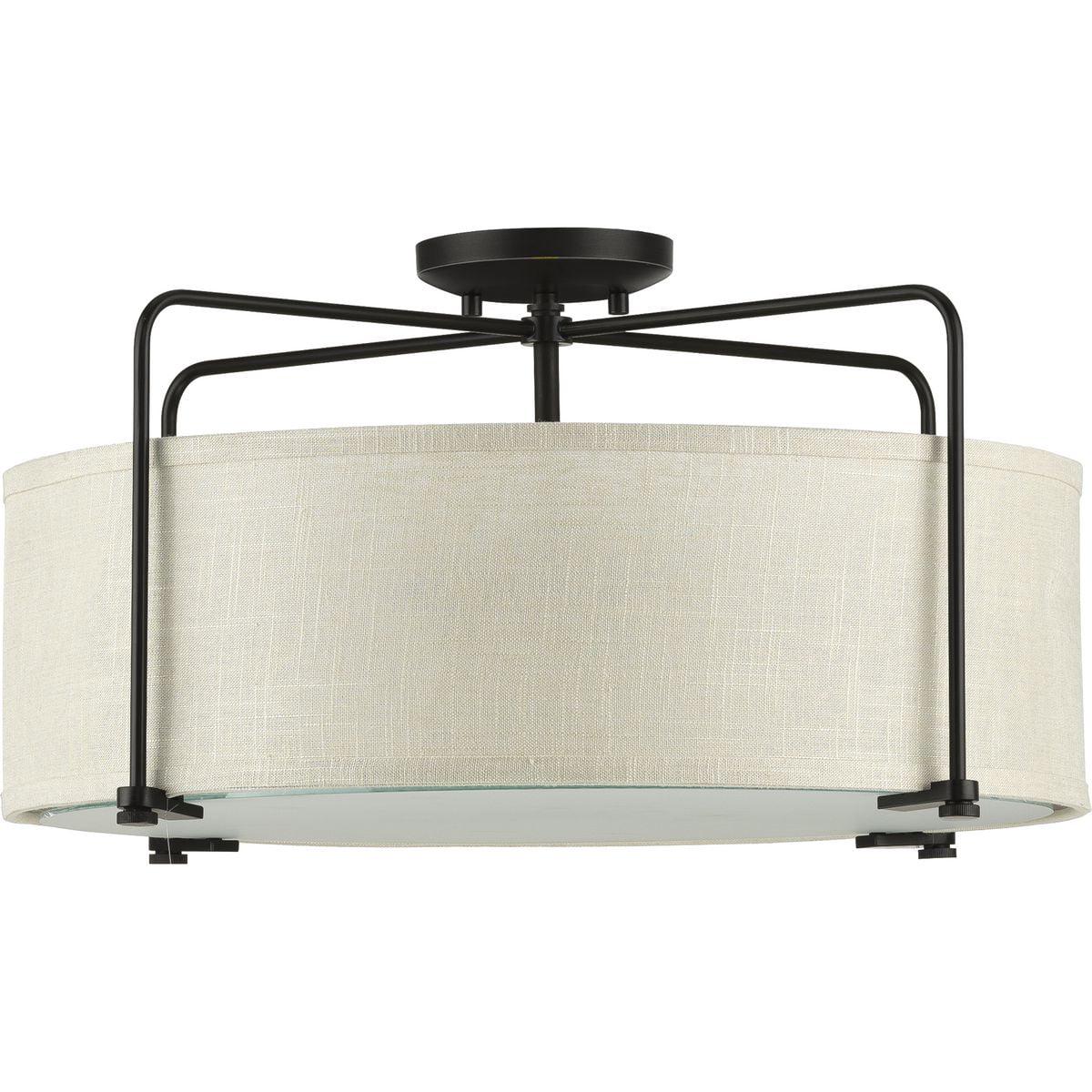 – Three-light, semi-flush convertible with a curved-corner metal frame capturing the textured linen shade within its arms
