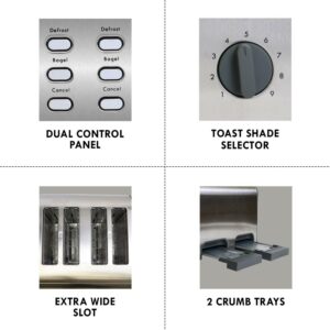 – DUAL CONTROLS Toast or defrost bread and bagels at the same time, customize two different shades, or prepare only two slices without using unnecessary energy with separate controls for each half of the toaster