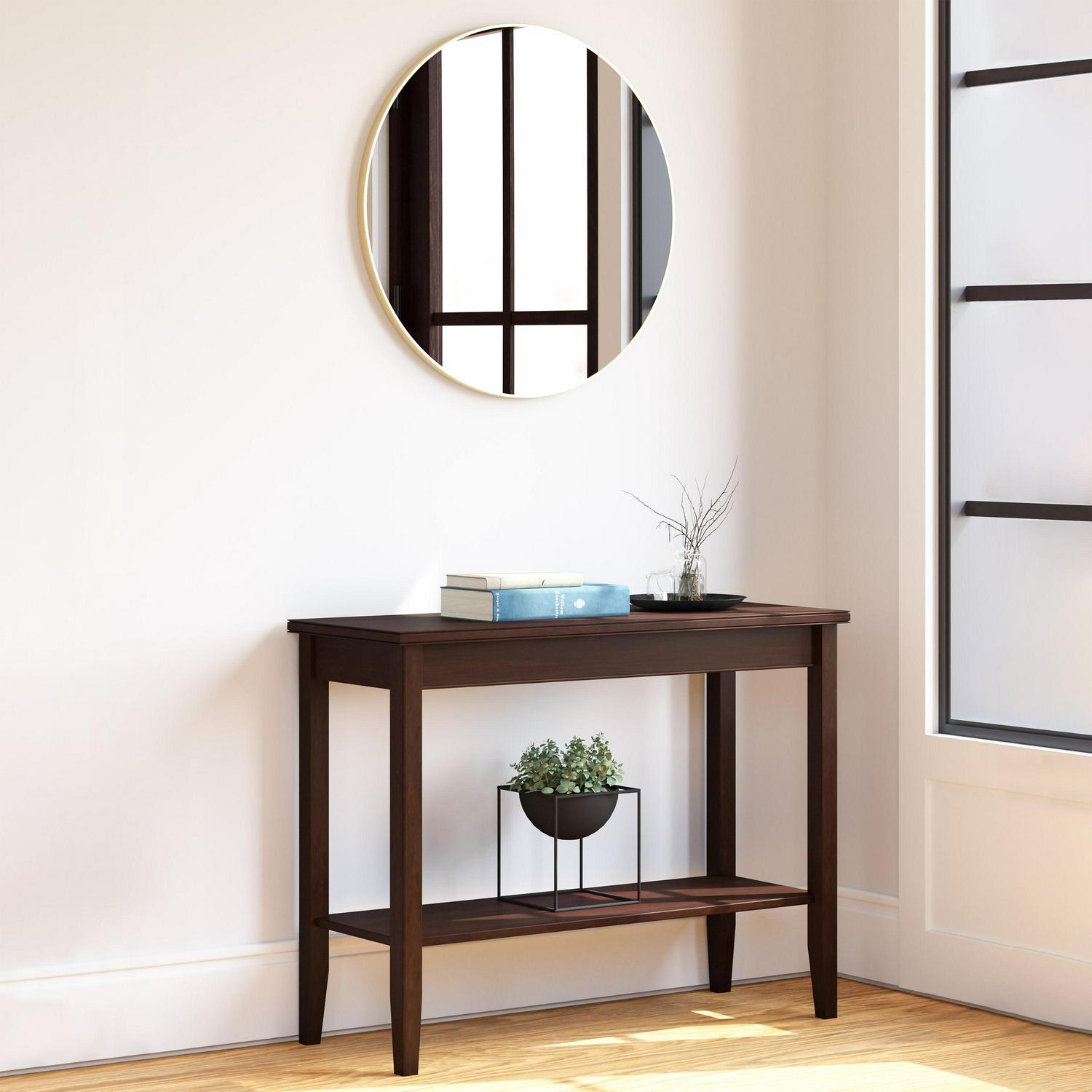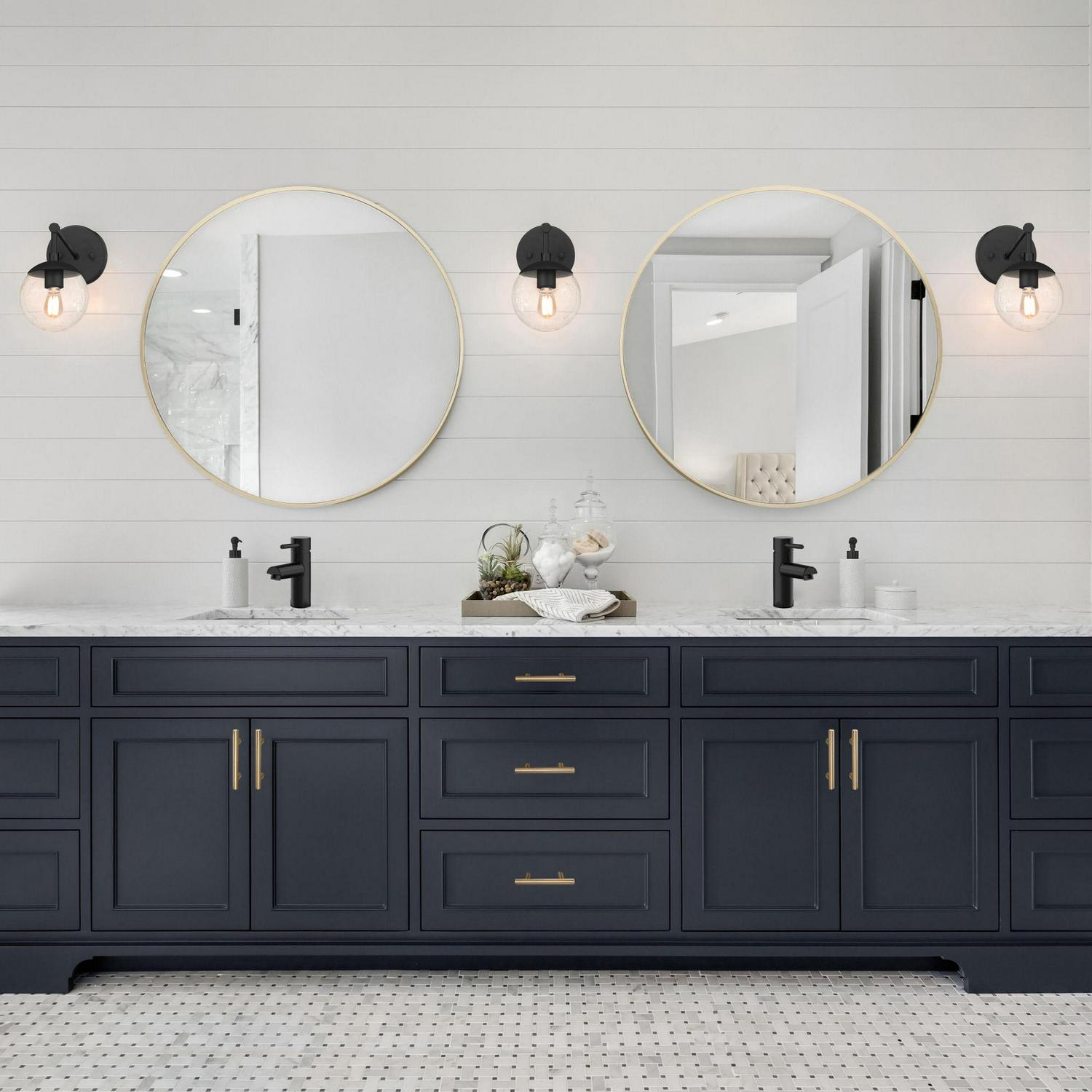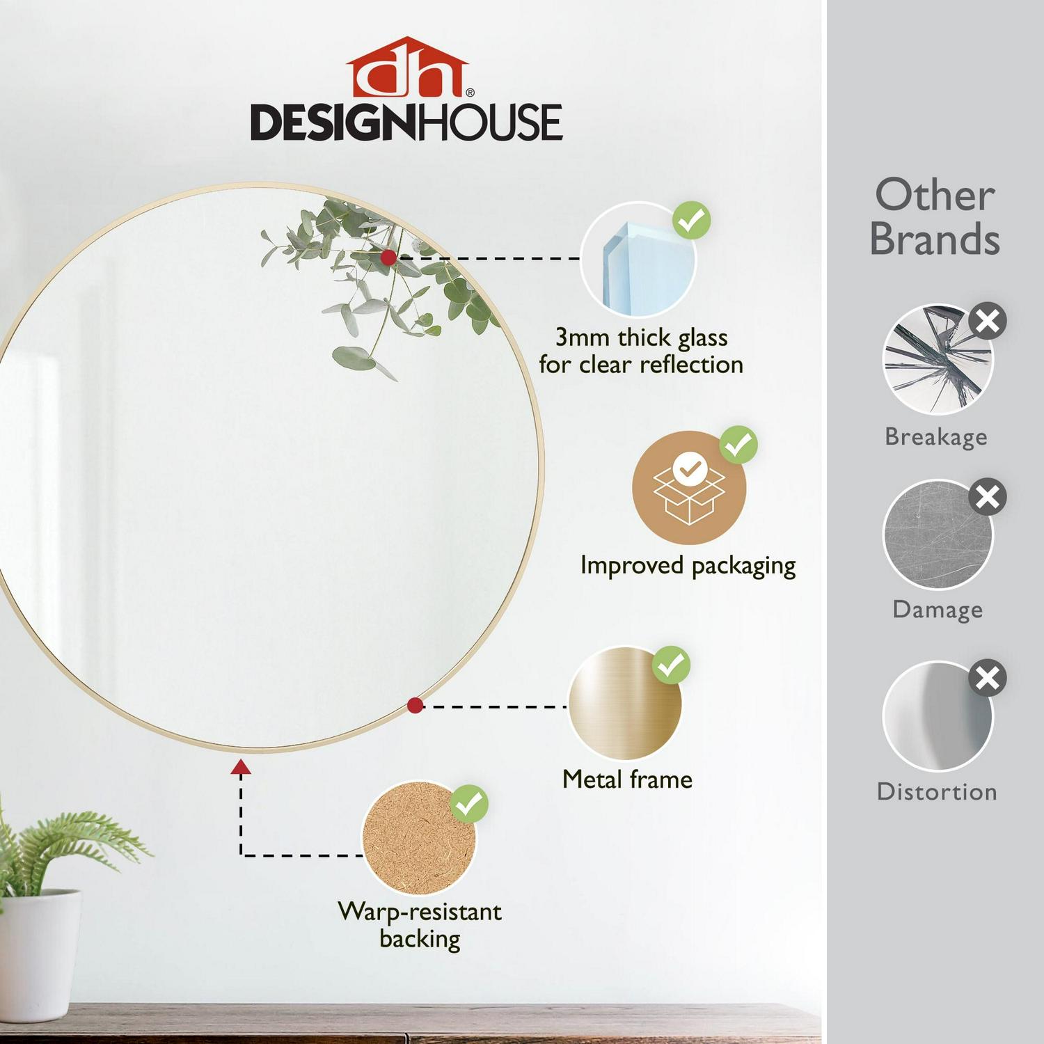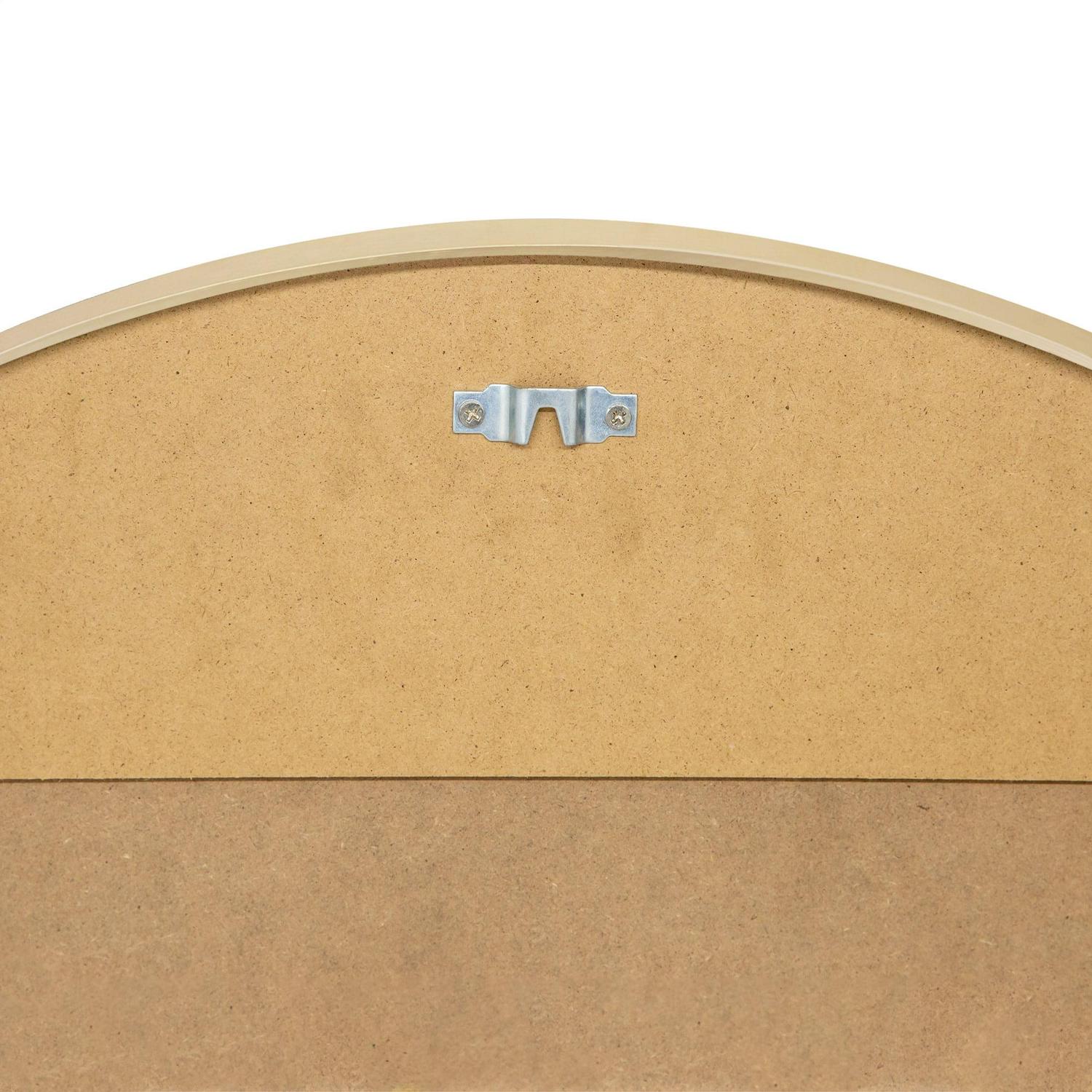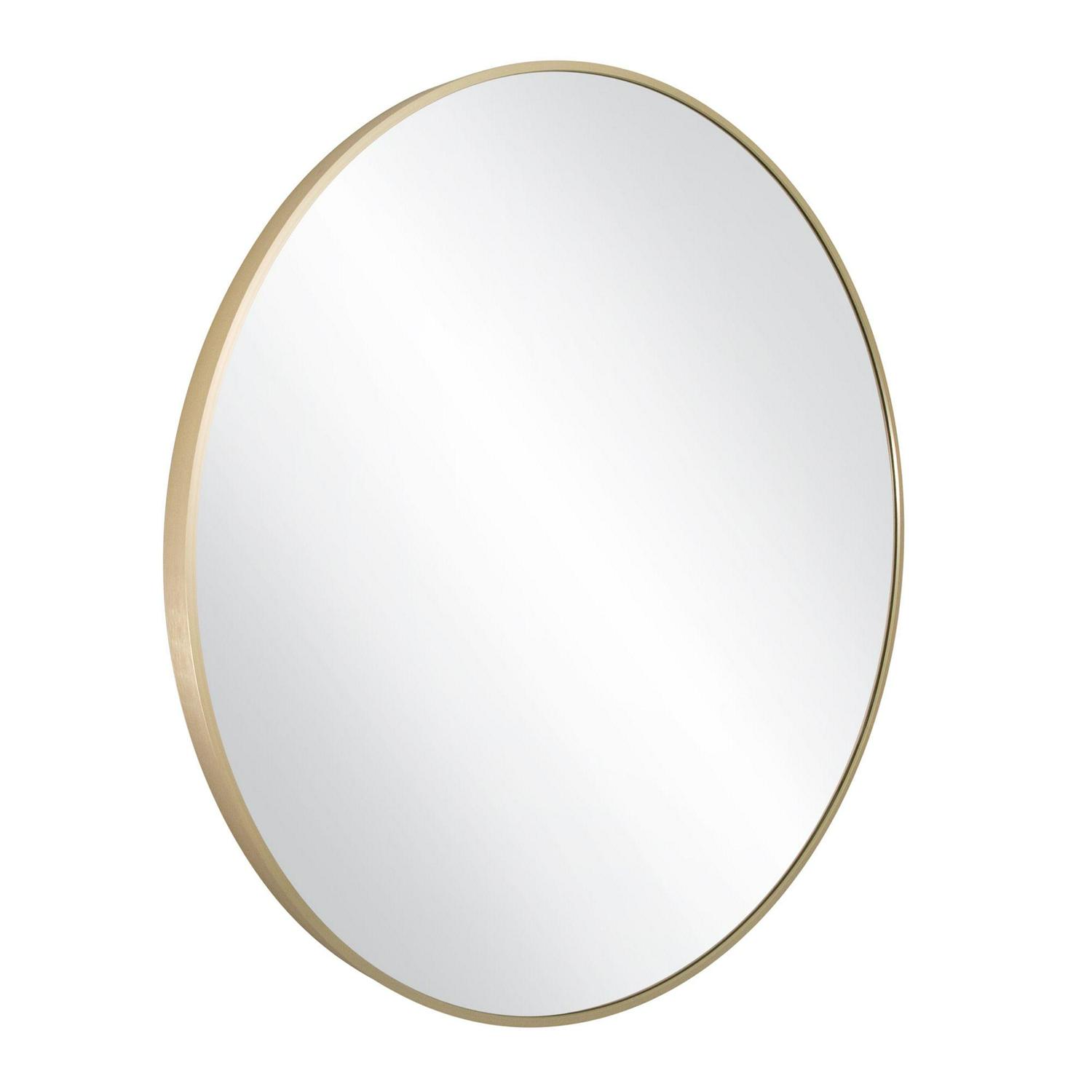 The Design House Kenna 28-Inch Round Gold Decorative Wall Mirror brings a blend of modernity and elegance to your walls. Its sleek gold metal frame not only adds style but also creates depth and dimension within your space. With its substantial size and minimalist design, this wall mirror is perfect for amplifying both natural and artificial light, thus illuminating various areas like bedrooms, bathrooms, hallways, entryways, living rooms, and offices. The mirror is inset within the frame, enhancing the overall sense of depth and dimension in your surroundings. It arrives at your doorstep with enhanced packaging, ensuring a safe delivery without damage. Crafted with a medium density fiberboard backing, this mirror reduces the likelihood of warping that can be associated with solid wood backings. This choice of material also enhances stability, offering a reassuring durability. For your convenience, this mirror, despite its size, is impressively lightweight. It arrives ready to adorn your wall straight out of the box, complete with the necessary mounting hardware. Designed and manufactured by Design House, the trusted source for quality lighting, hardware, plumbing, kitchen, and bath products for every taste and budget.This product comes with a 1-year limited warranty