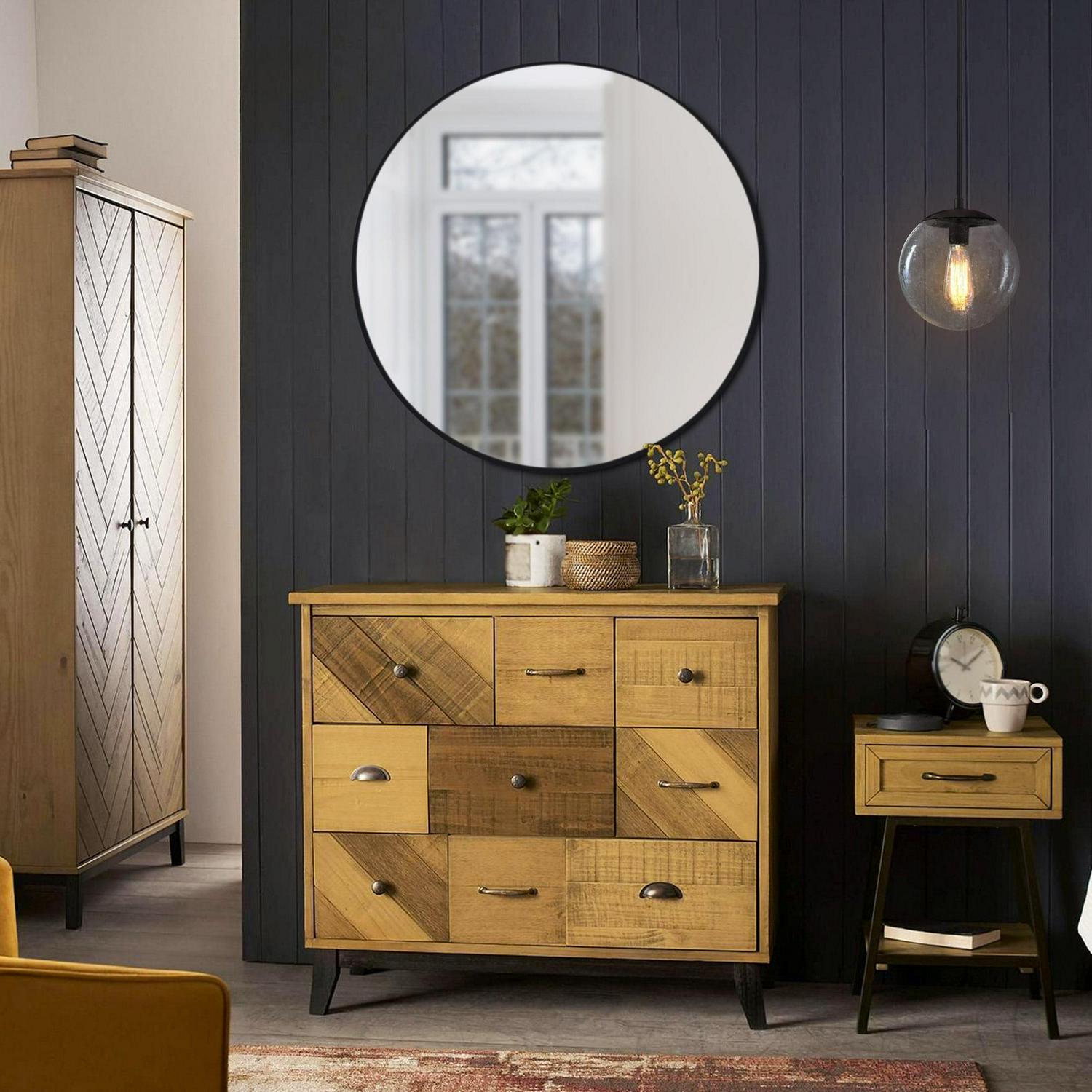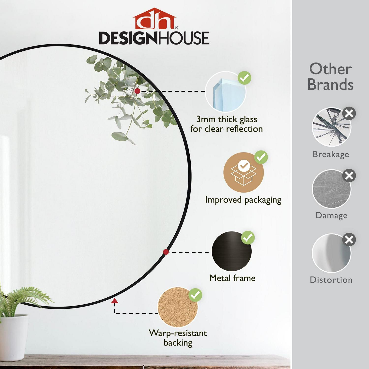 The Design House Kenna 36-Inch Round Black Decorative Wall Mirror brings a blend of modernity and elegance to your walls. Its sleek black metal frame not only adds style but also creates depth and dimension within your space. With its substantial size and minimalist design, this wall mirror is perfect for amplifying both natural and artificial light, thus illuminating various areas like bedrooms, bathrooms, hallways, entryways, living rooms, and offices. The mirror is inset within the frame, enhancing the overall sense of depth and dimension in your surroundings. It arrives at your doorstep with enhanced packaging, ensuring a safe delivery without damage. Crafted with a medium density fiberboard backing, this mirror reduces the likelihood of warping that can be associated with solid wood backings. This choice of material also enhances stability, offering a reassuring durability. For your convenience, this mirror, despite its size, is impressively lightweight. It arrives ready to adorn your wall straight out of the box, complete with the necessary mounting hardware. Designed and manufactured by Design House, the trusted source for quality lighting, hardware, plumbing, kitchen, and bath products for every taste and budget.This product comes with a 1-year limited warranty