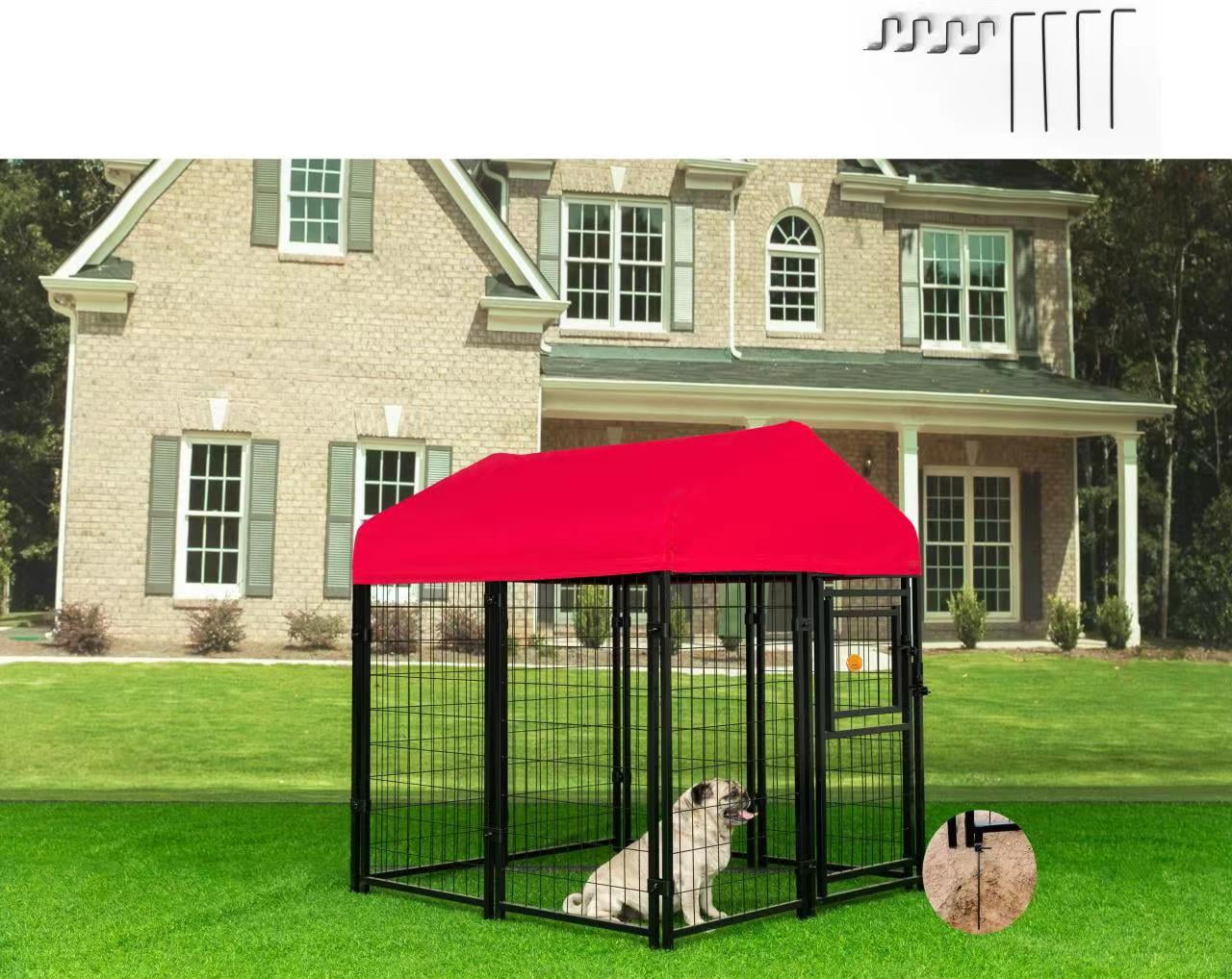 Easy 1-person assembly – no tools needed. Hammertone powder coating resists rusting, eliminates sharp points, and has an attractive, textured finish Gate-in-gate design permits placement of food and other items without allowing pets to escape Red Waterproof cover provides shade from direct sunlight and shelter from rain. The included cover color may Slightly Vary Due to Photographic Lighting. Suitable for use indoors and outdoors. Ideal for dogs, cats, and other small animals.