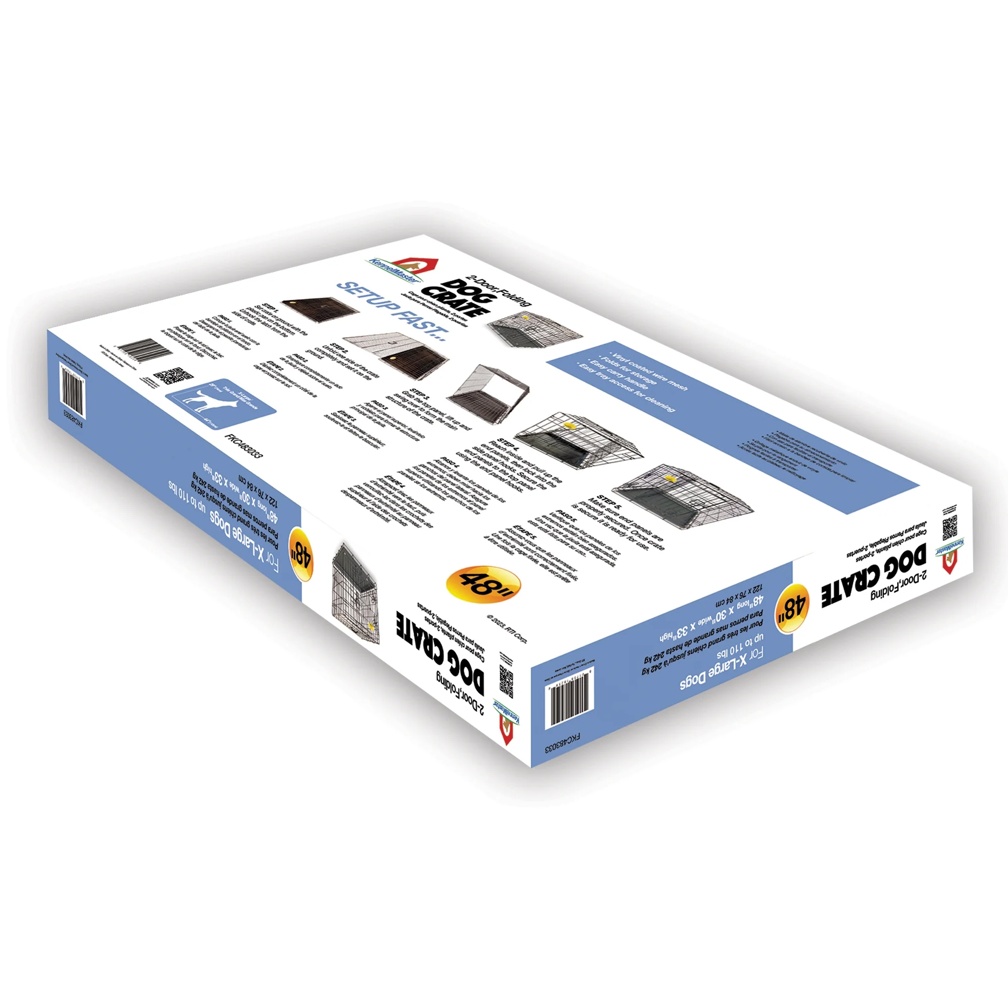 The KennelMaster 48 in. wide XL wire dog crate is developed specifically for puppies or dogs up to 110 lbs. Whether you are traveling with your pet or providing training, this crate will keep your dog comfortable and secure. No tools or assembly are required – Simply pull the panels into place and your crate is ready! Adjust the crate’s size for your growing puppy’s needs with the included divider panel. Front and side access doors are each equipped with two safety latches to keep your pet inside. Cleaning up after your dog is simple with the provided removable plastic tray. Constructed of vinyl coated steel wire mesh, KennelMaster crates are sturdy, durable, and resistant to rust. The steel mesh will hold up to your four-legged friend’s rambunctious nature, while the vinyl coating makes cleaning up his or her messes a breeze. This crate is approved and recommended for training purposes and is not intended for long-term crating. This crate measures 48” L x 30” W x 33” H and is designed to hold dogs up to 110 lbs. Smaller sizes are also available for smaller dogs.