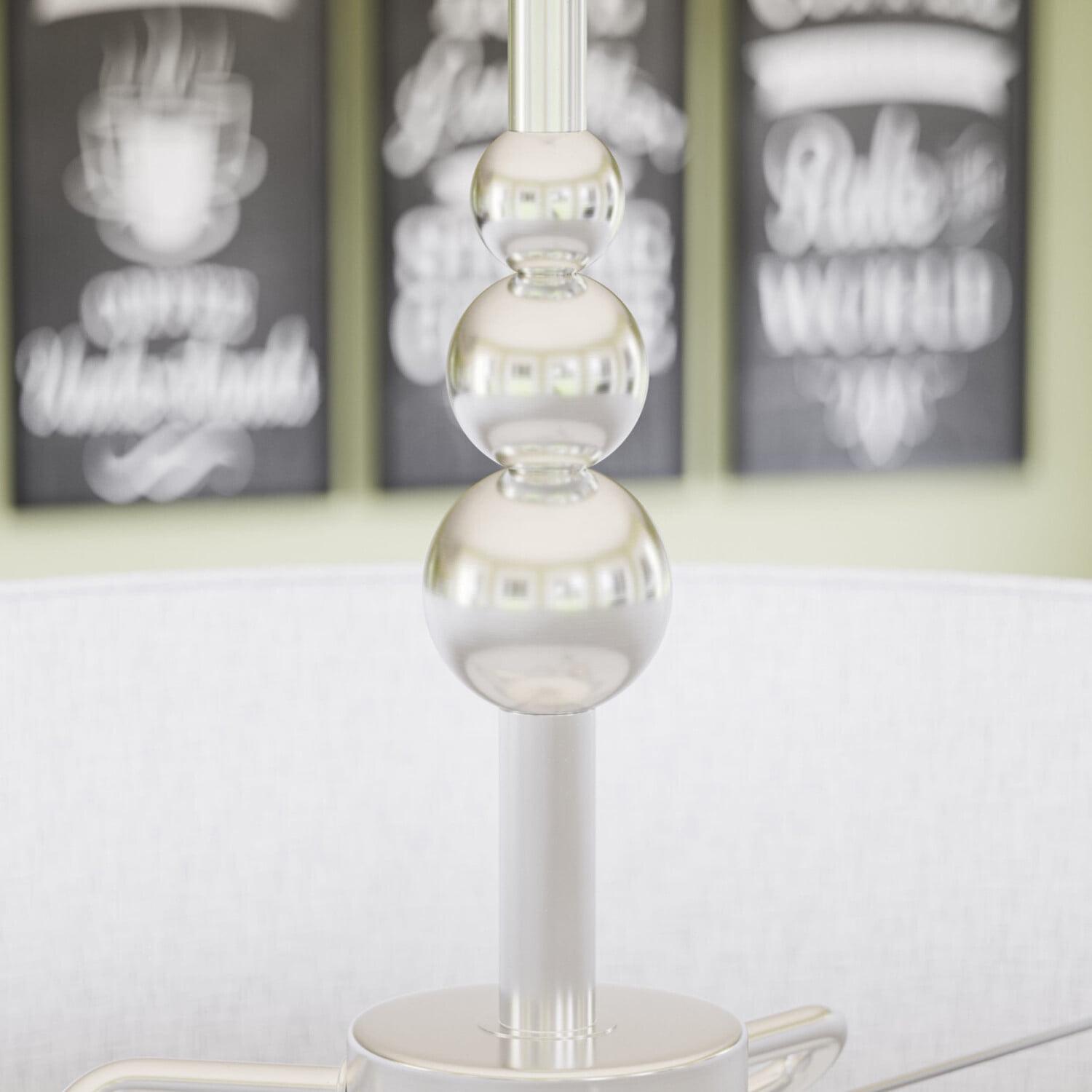 - Brushed steel finish with 22-inch silver fabric shade