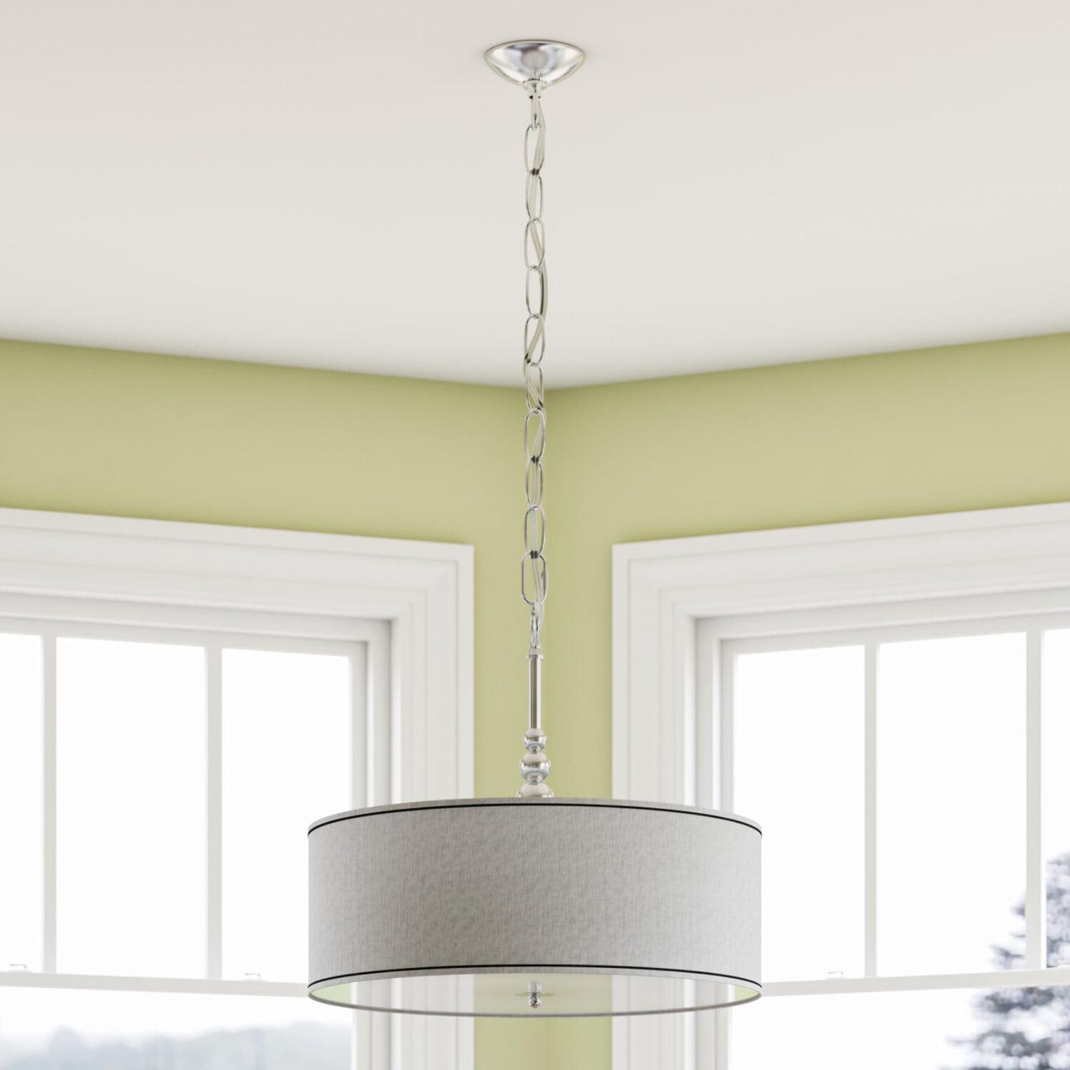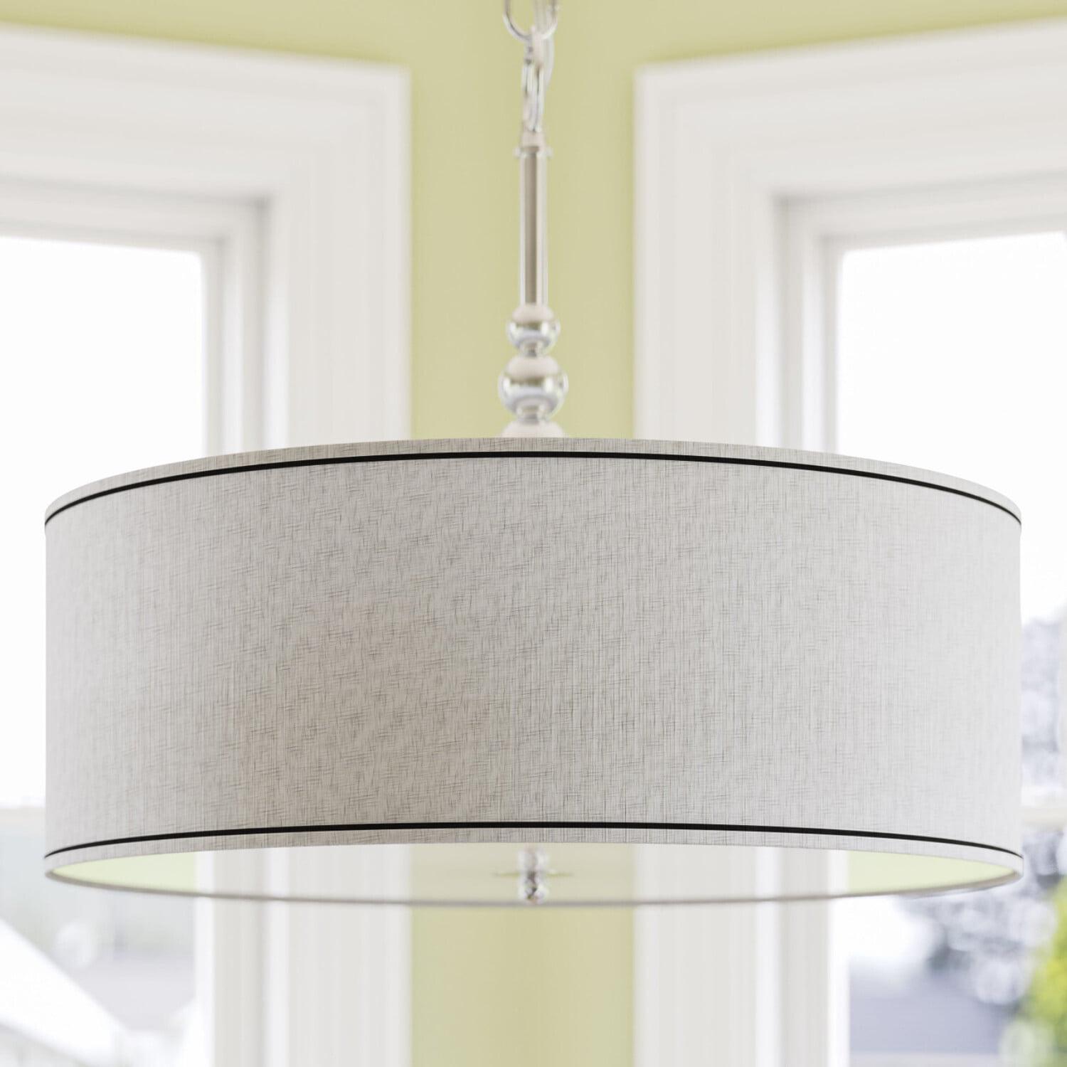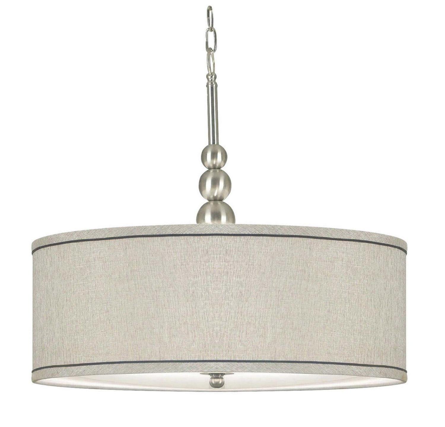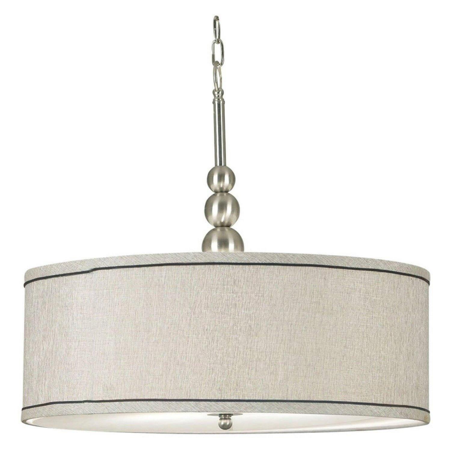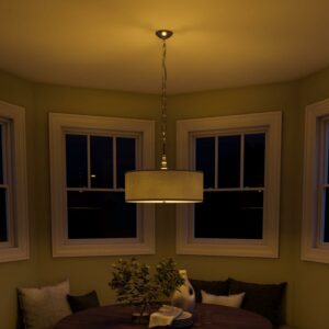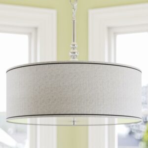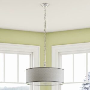 Simply hang a lampshade from the ceiling and you get the Kenroy Home 91640BS Margot 3-Light Pendant – 22W in. Silver Finish, which uses a retro vibe to establish serious modern style in your home. Three 100-watt bulbs (not included) cast a soft glow from behind the 22-inch diameter silver metallic fabric drum shade. Neutral yet glamorous, this elegant chandelier is ideal for a casual, contemporary dining area.