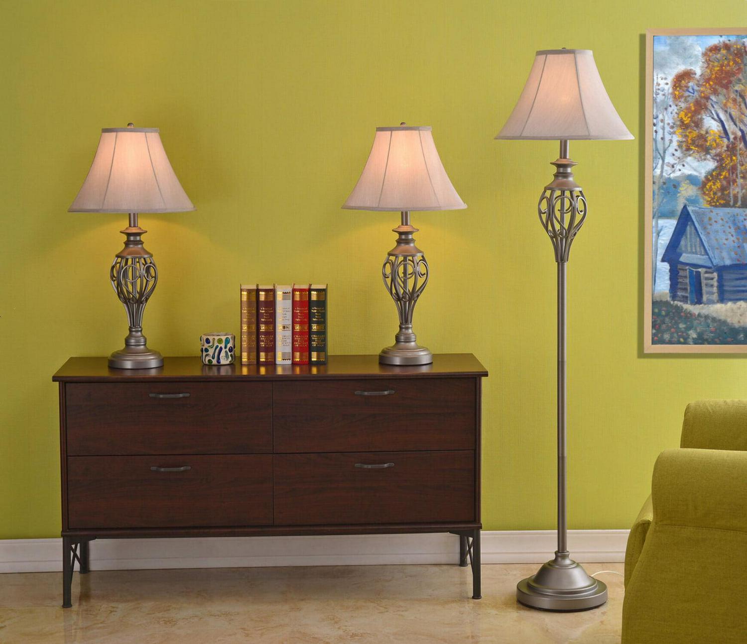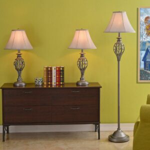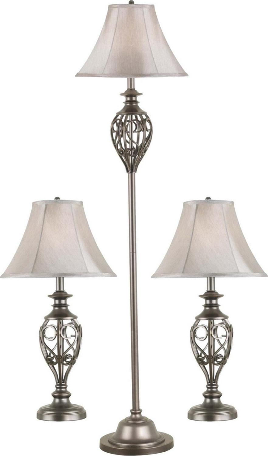– DIMENSIONS: Floor lamp: 59.75 Inch Height, 15 Inch Width; Table lamps: 26.75 Inch Height, 14 Inch Width; Requires 3-100 Watt Maximum Bulbs or LED Equivalent