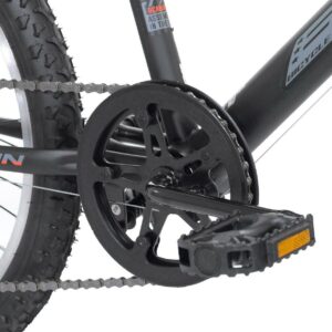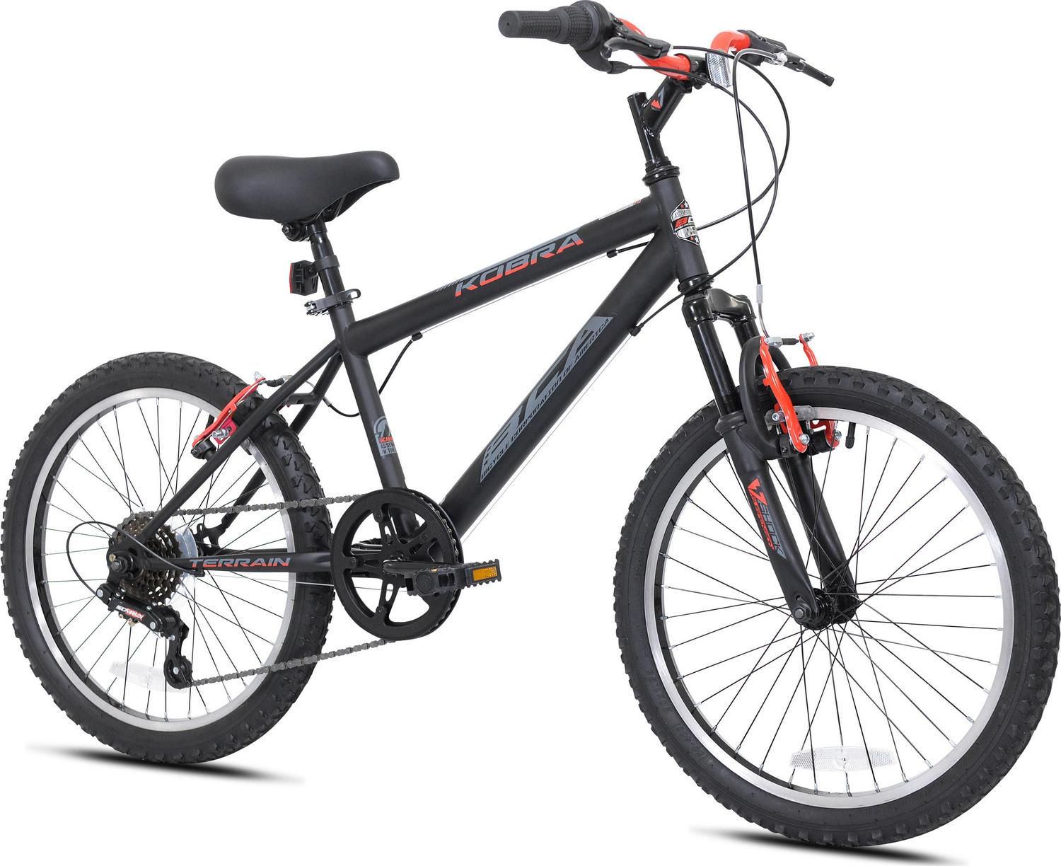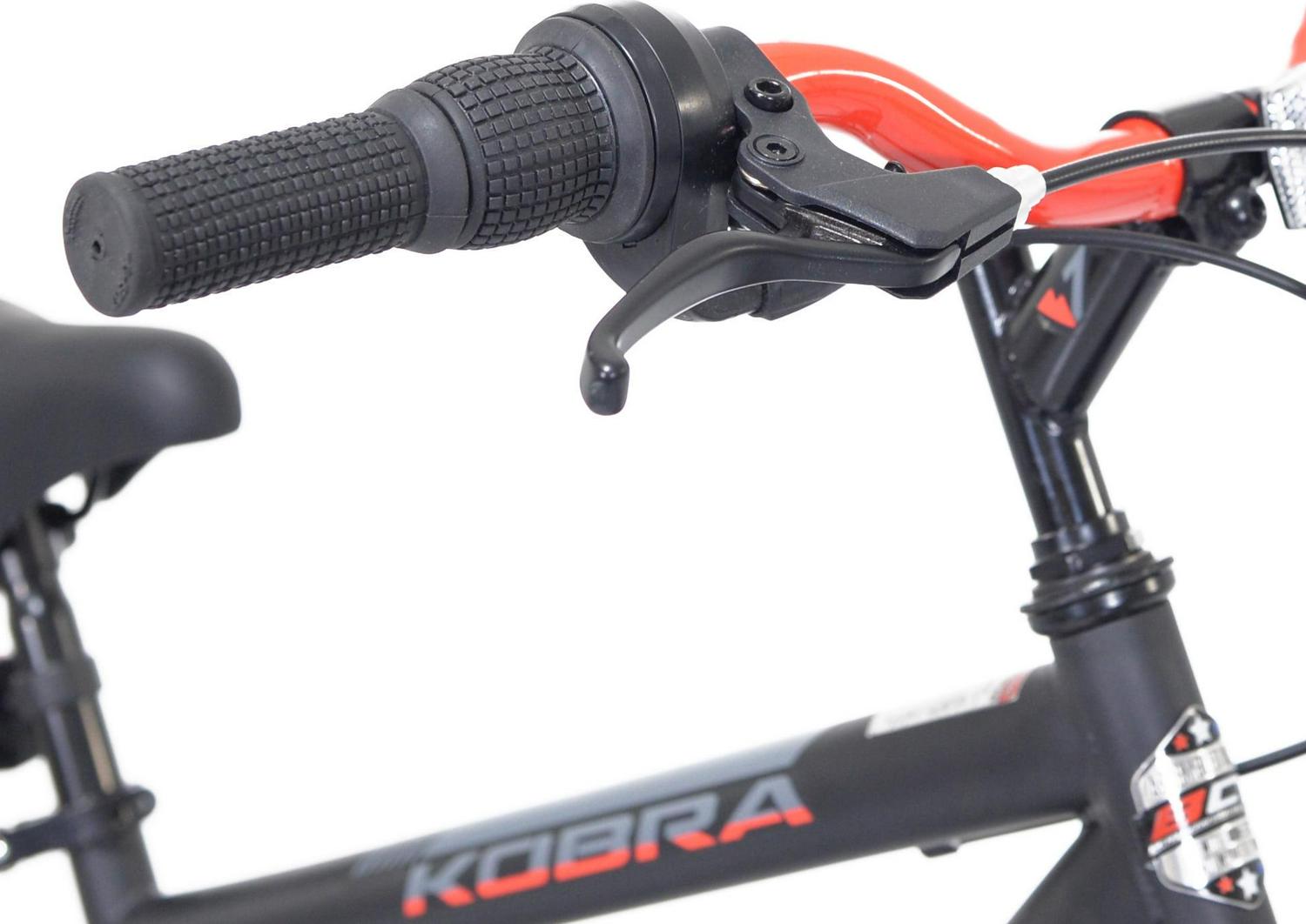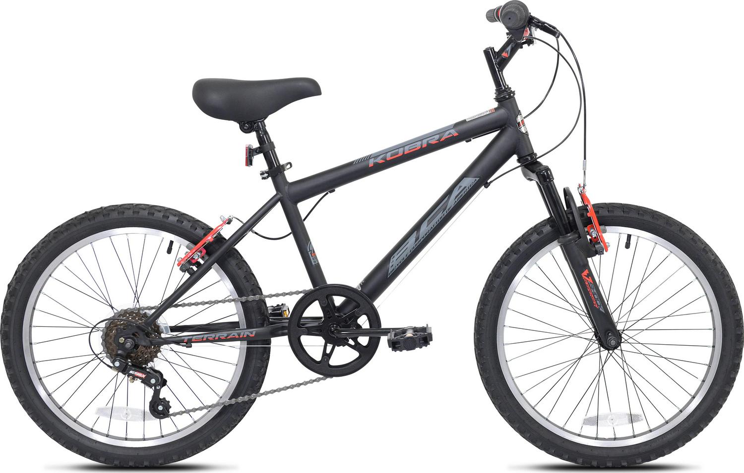 Kent presents the 20″ boys Kobra mountain bike with features found on big brother’s bike as well as dad’s. Tuned travel front shock absorbs the bumps and the sturdy steel frame keeps the bike tracking straight. Shifting is handled with a six-speed drivetrain featuring twist shifters and lugged knobby tires get all that kid power to the ground and provide great traction. Front and rear linear-pull brakes keep speed in check. The supple padded seat is easily adjusted with no tools thanks to a quick-release lever clamp. With the Kobra, the fun doesn’t stop when the street ends. Age Group: Child, Gender: Male