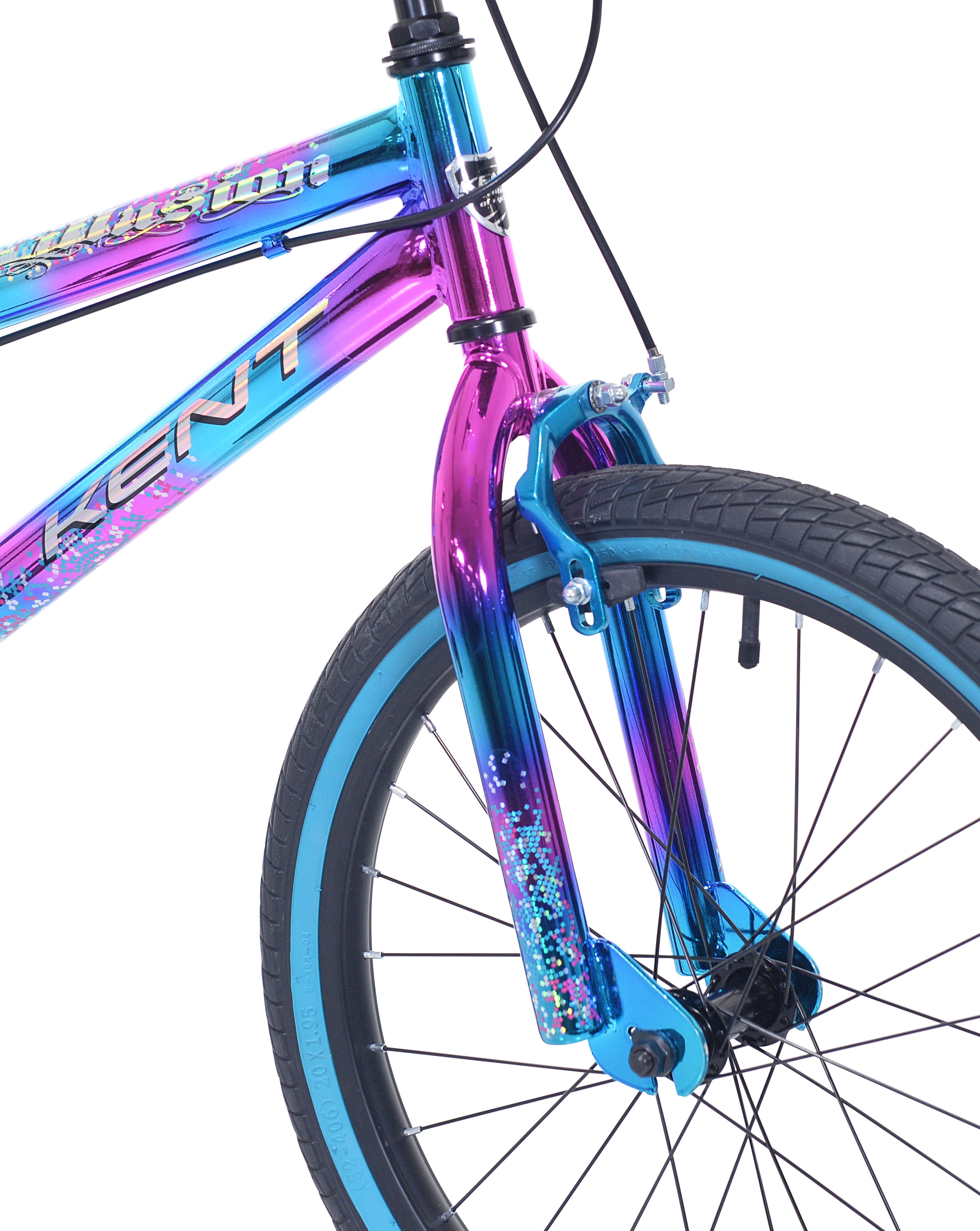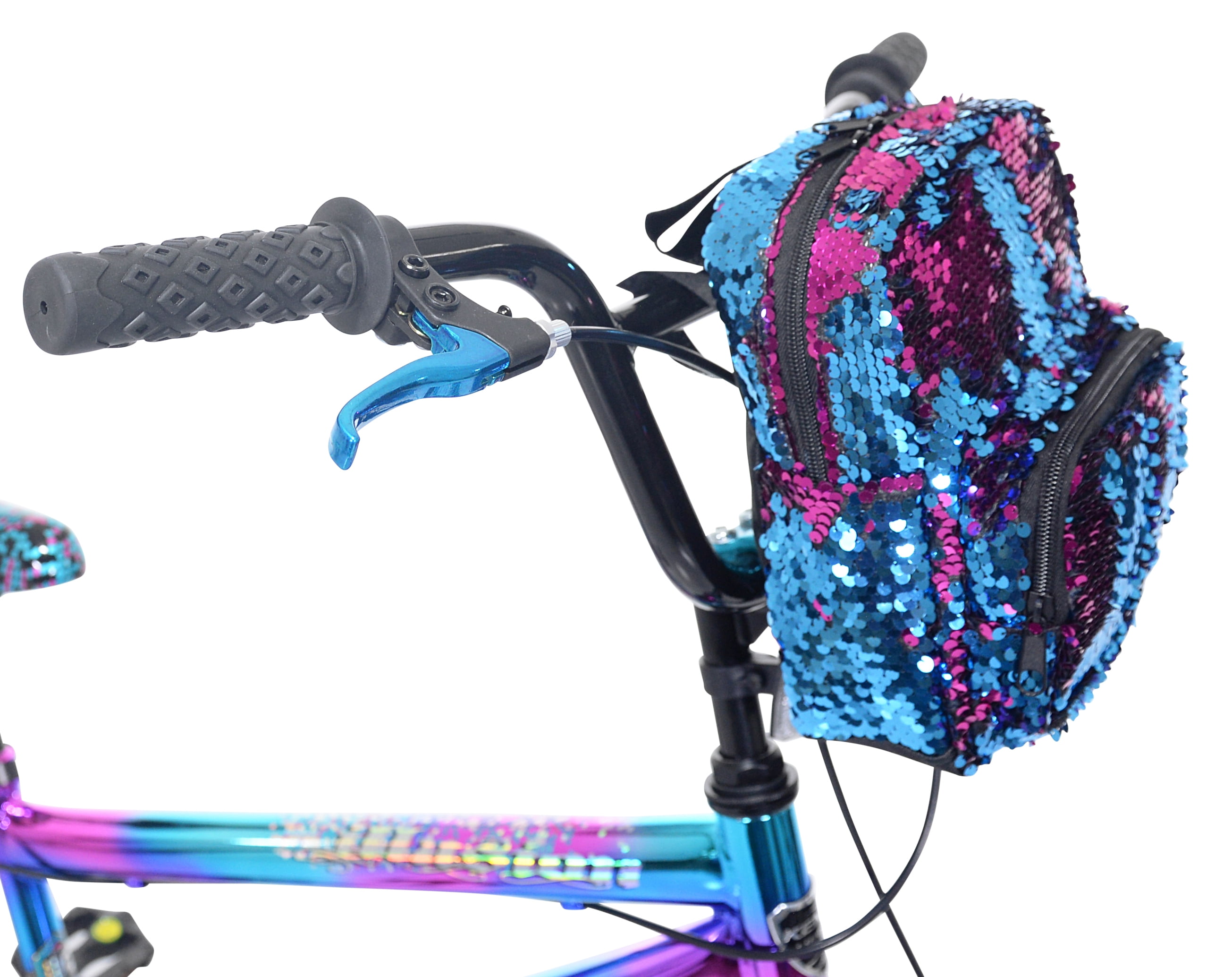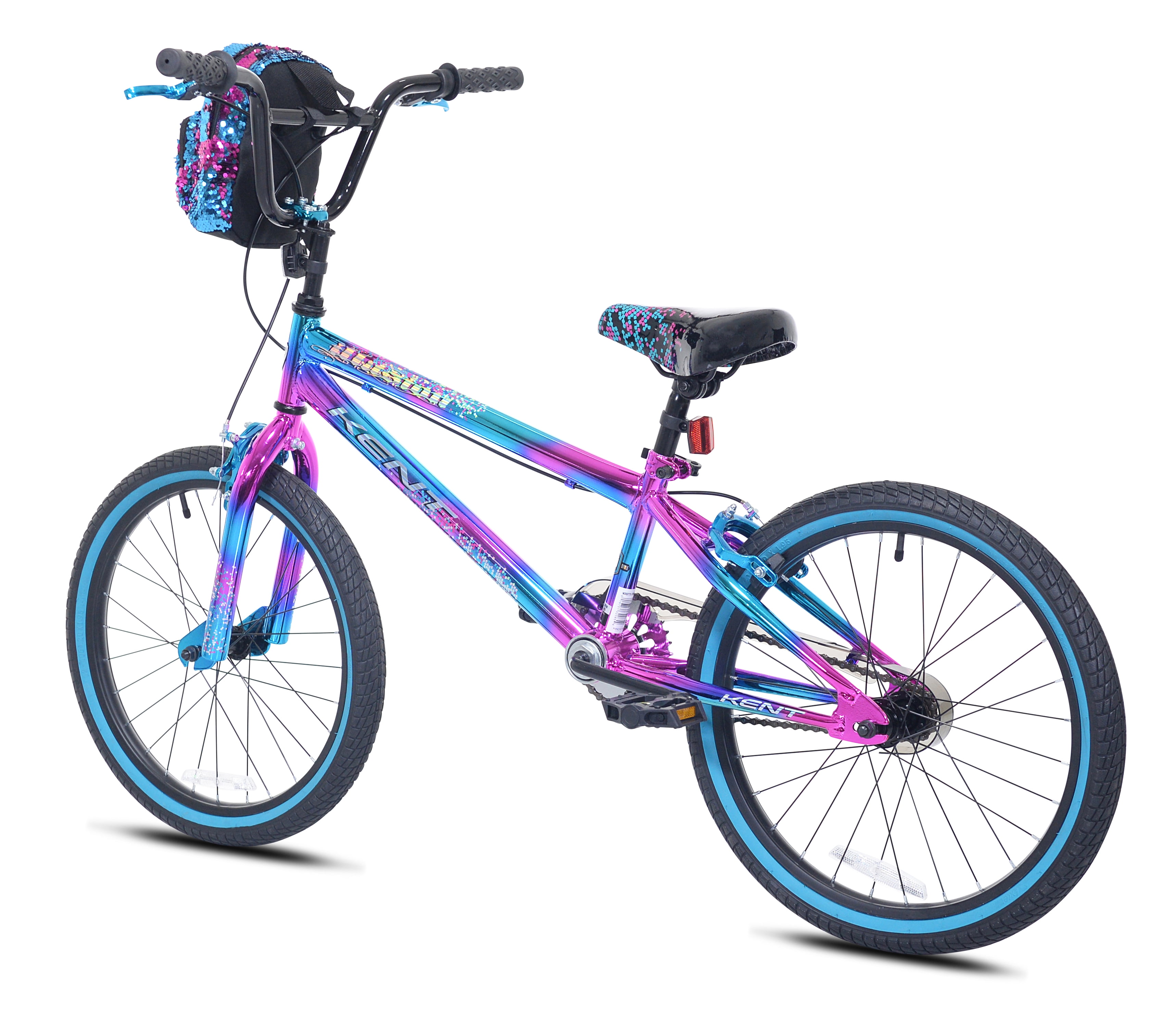 The Kent Illusion bike is the perfect bike for your child. With beautiful blue, purple and hot pink colors, your child will stand out while they are riding their cool illusion-style bike. There is also a sequin bag mounted on the handlebars to carry snacks, a water bottle, and whatever else you may need to bring with you. This single-speed bike features blue sidewalls, BMX style handlebars, hand brakes, a smoke color chain guard, and an adjustable color-matched seat. This is a 20″ bike designed for heights from 4’2″ and up. Cruise around in style in your neighborhood or on any paved bike path with this super cool mixed metallic color BMX style bike from Genesis. Ideal for female children.