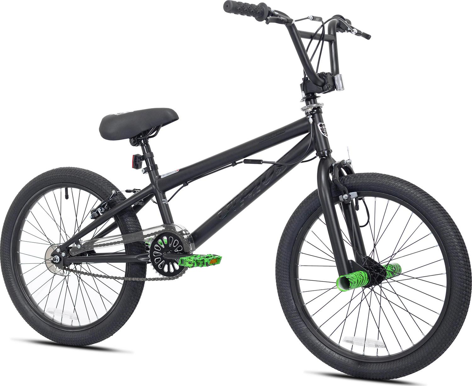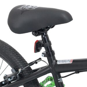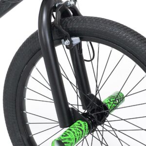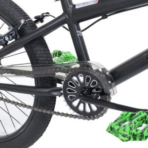 The Kent 20″ chaos boy’s BMX bike comes in a matte black color with cool green and black hydro dipped pedals and pegs. This single-speed 20-inch Kent chaos boy’s freestyle bike is a tricked-out ride that is made for action. It is an ideal bike for improving your freestyle chops and short cruises around the neighborhood. This bike is equipped with a reinforced high-tensile steel frame, 20-inch by 2.1-inch freestyle tires, and front steel pegs. This 20-inch freestyle bike also has sturdy alloy rims, dual-caliper hand brakes in a matching green color, and a smoke color PVC chain cover. It is designed for riders from 8 to 12 years of age. Gender: Male; Age Group: Child