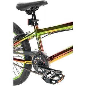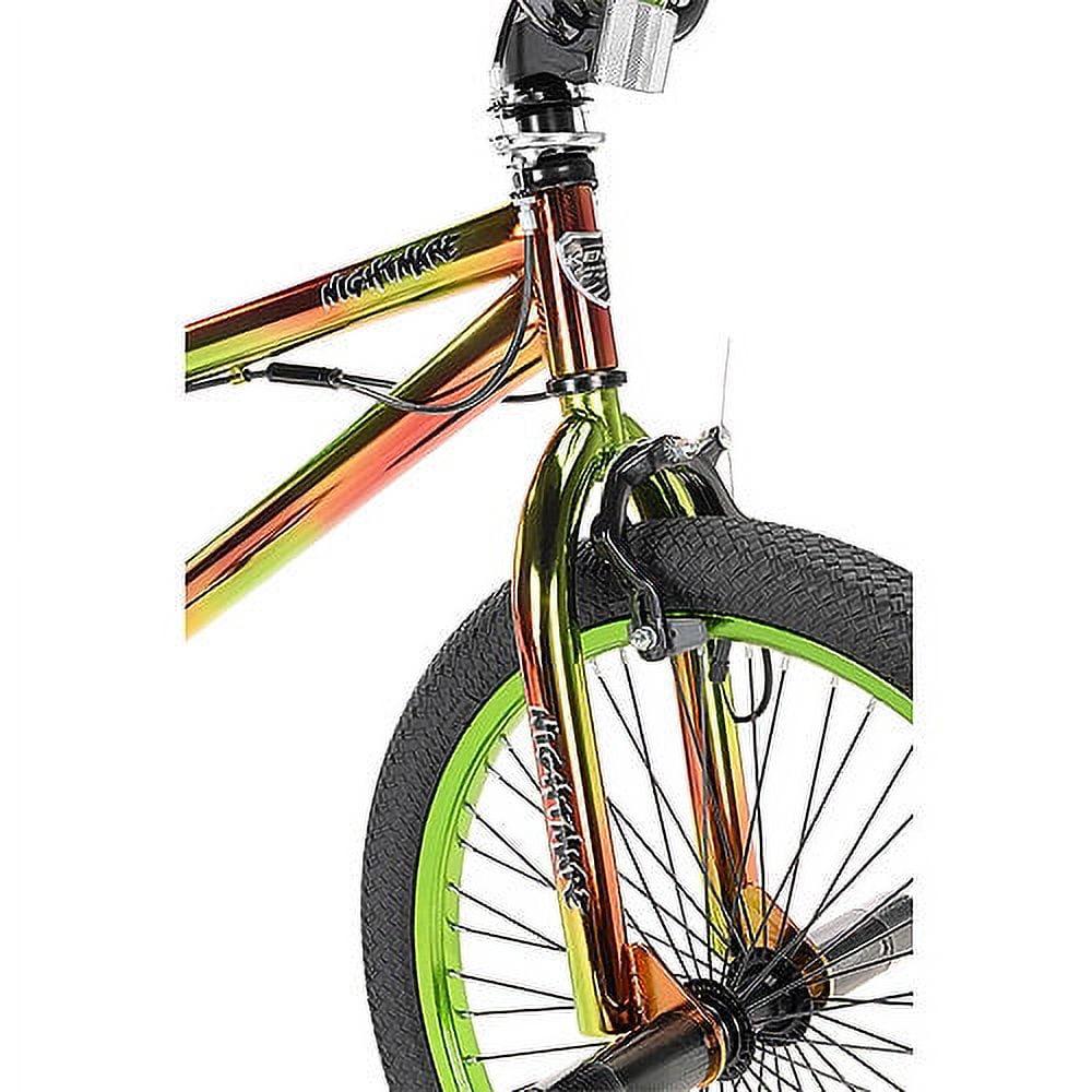 The nightmare by Kent Bicycles is a feature packed freestyle bike that just so happens to have a drop-Dead gorgeous paint job too! sturdy steel frame and fork construction with wild paint over a silver undercoat. Matching high-Rise BMX handlebars are held in place by a stout four-Bolt stem. Reach adjustable alloy handbrake levers control front side-Pull caliper alloy brakes and rear linear pull alloy brakes. Cable detanglers keep brakes working and prevents twisted cables while performing all the latest freestyle maneuvers. And the tricks don’t stop there &Mash; front and rear pegs are included for all your grinding and standing needs. The nightmare is real good and real good looking’!.