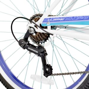 The Kent Bicycles Bayside Bike is ideal for a child or adult 4’6″ & up who is ready to cruise around the block on their own. It is full of features and is also fashionista friendly. This gear cycle for girls features a color-coordinated front basket to carry all those important things, such as a water bottle, a jacket, or even your cell phone. This is a white purple and blue accented bike with an oversized custom step-through frame. This bike comes with a rubber suspension seat, a chain guard, and purple rims with teal spokes.