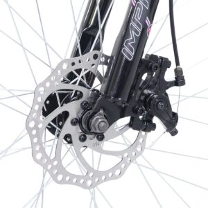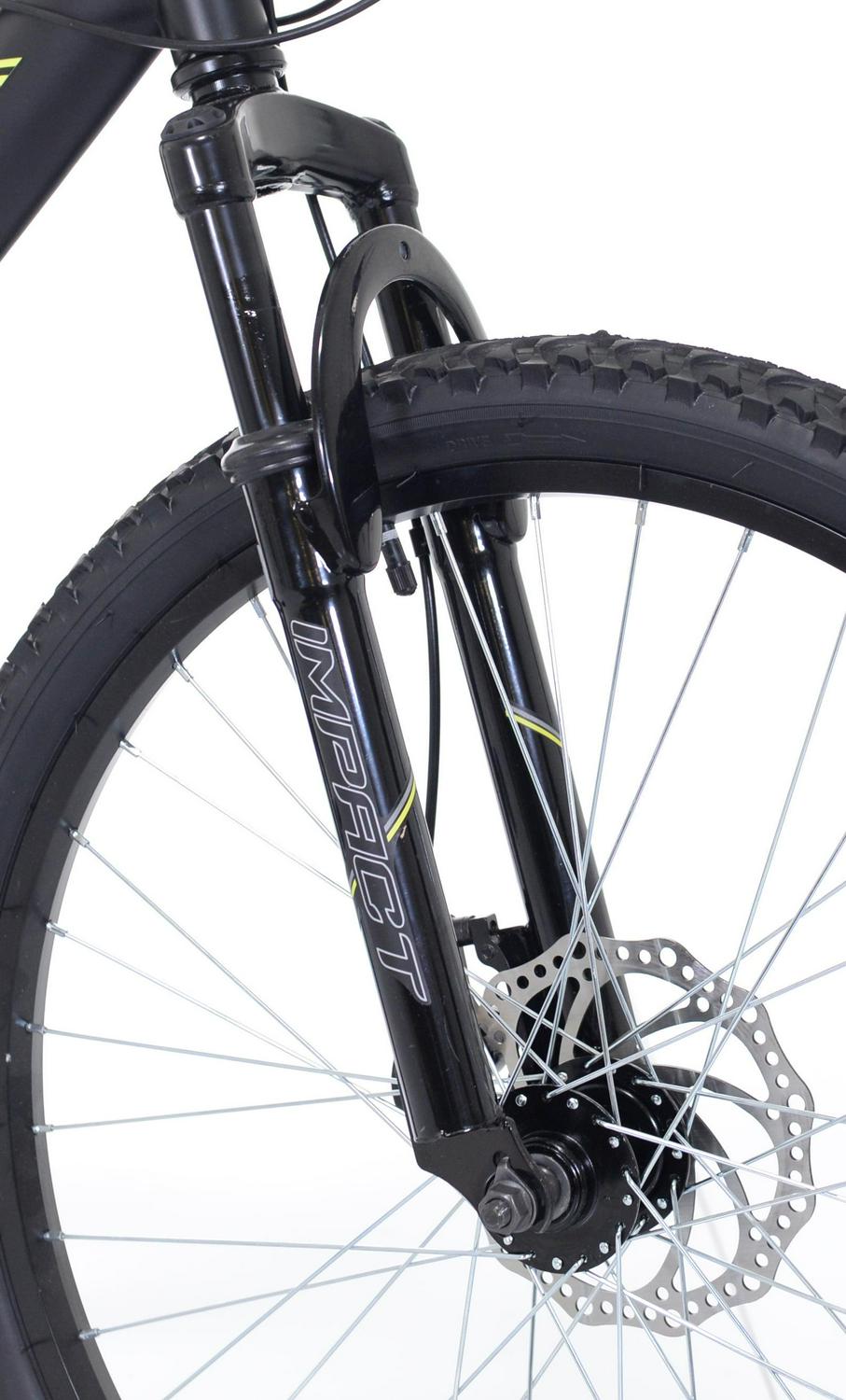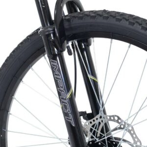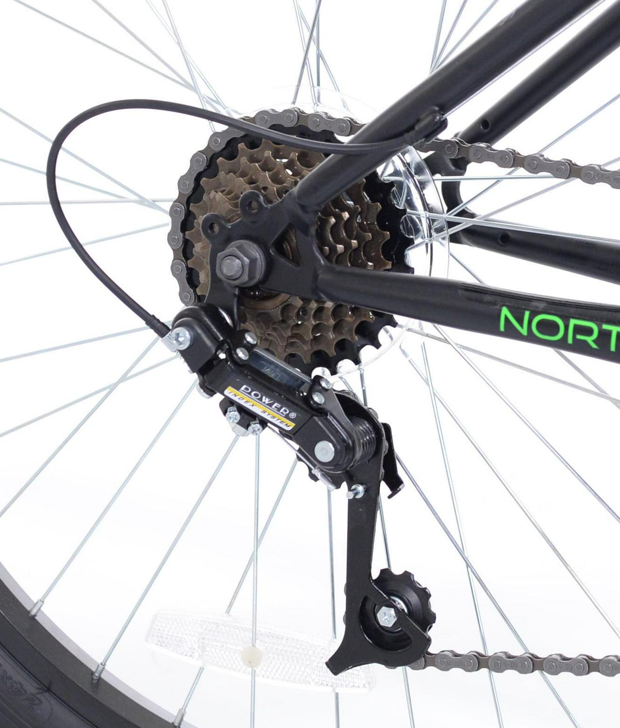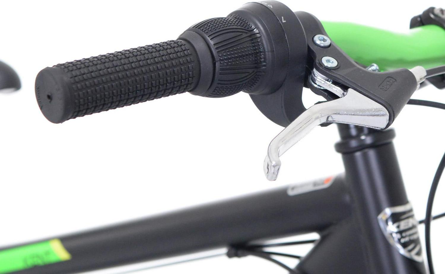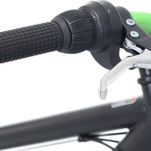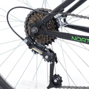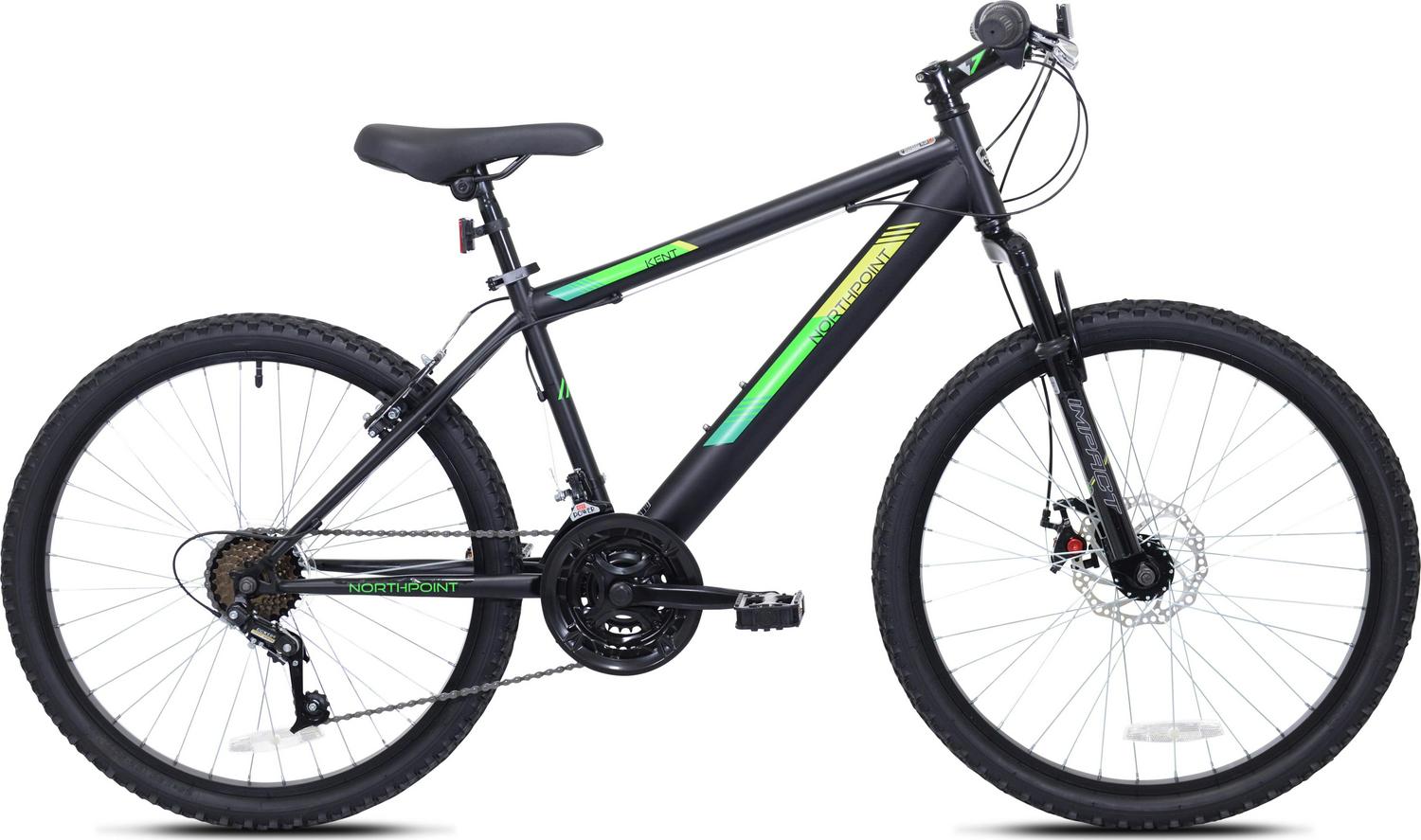 This is a Kent 24″ Northpoint Boy’s Mountain Bike in Black with Green with a hard-tail in the rear and front suspension.This mountain bike also has 21-speed gearing. Some of the other features to call out on this bike is that it has traditional flat pedals, black side wall moderate knobby tires, front disc brakes and rear rim brakes. It also has a quick release seat post for added convenience.This bike has a classic looking paint job that is black with linear accents in green and yellow.