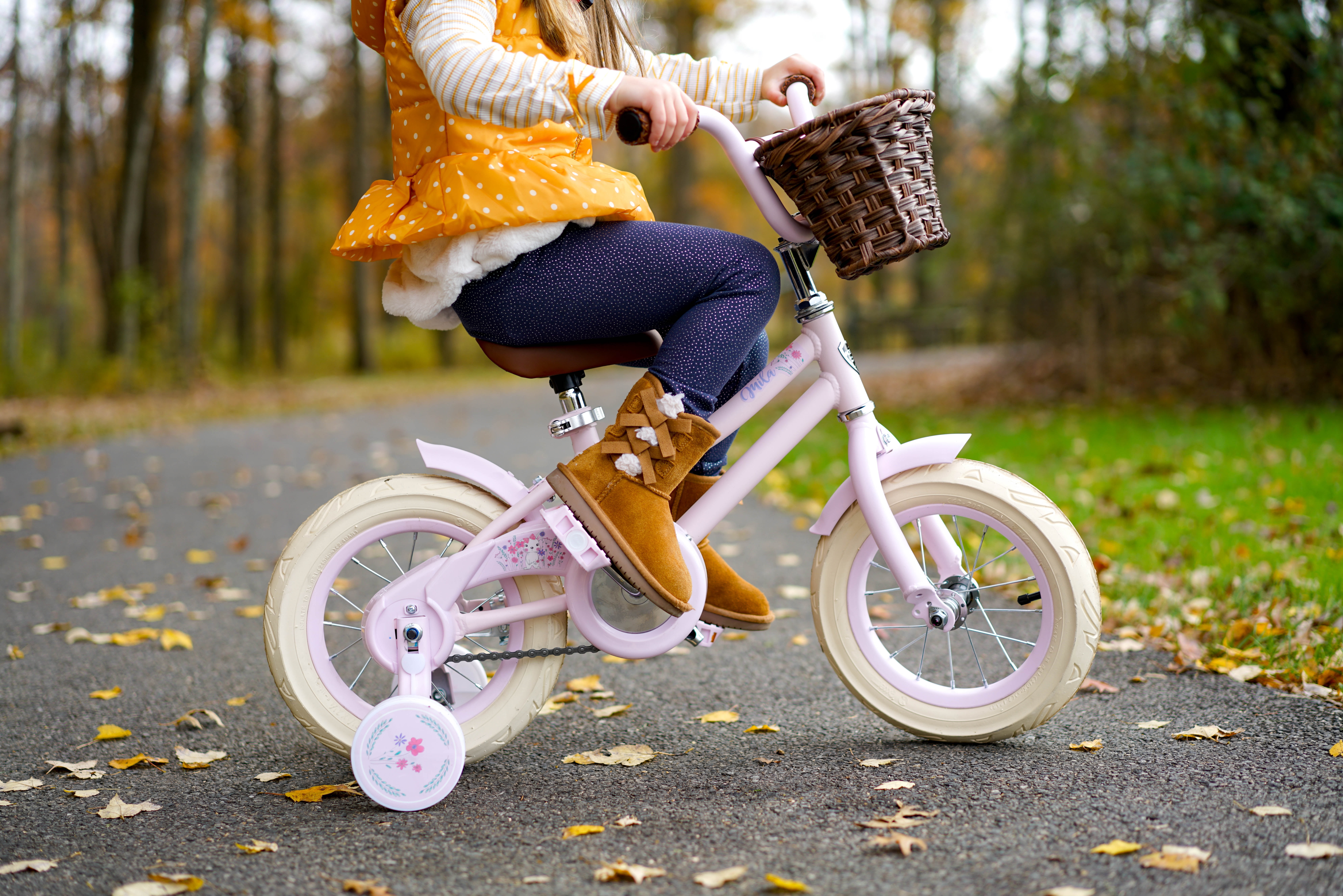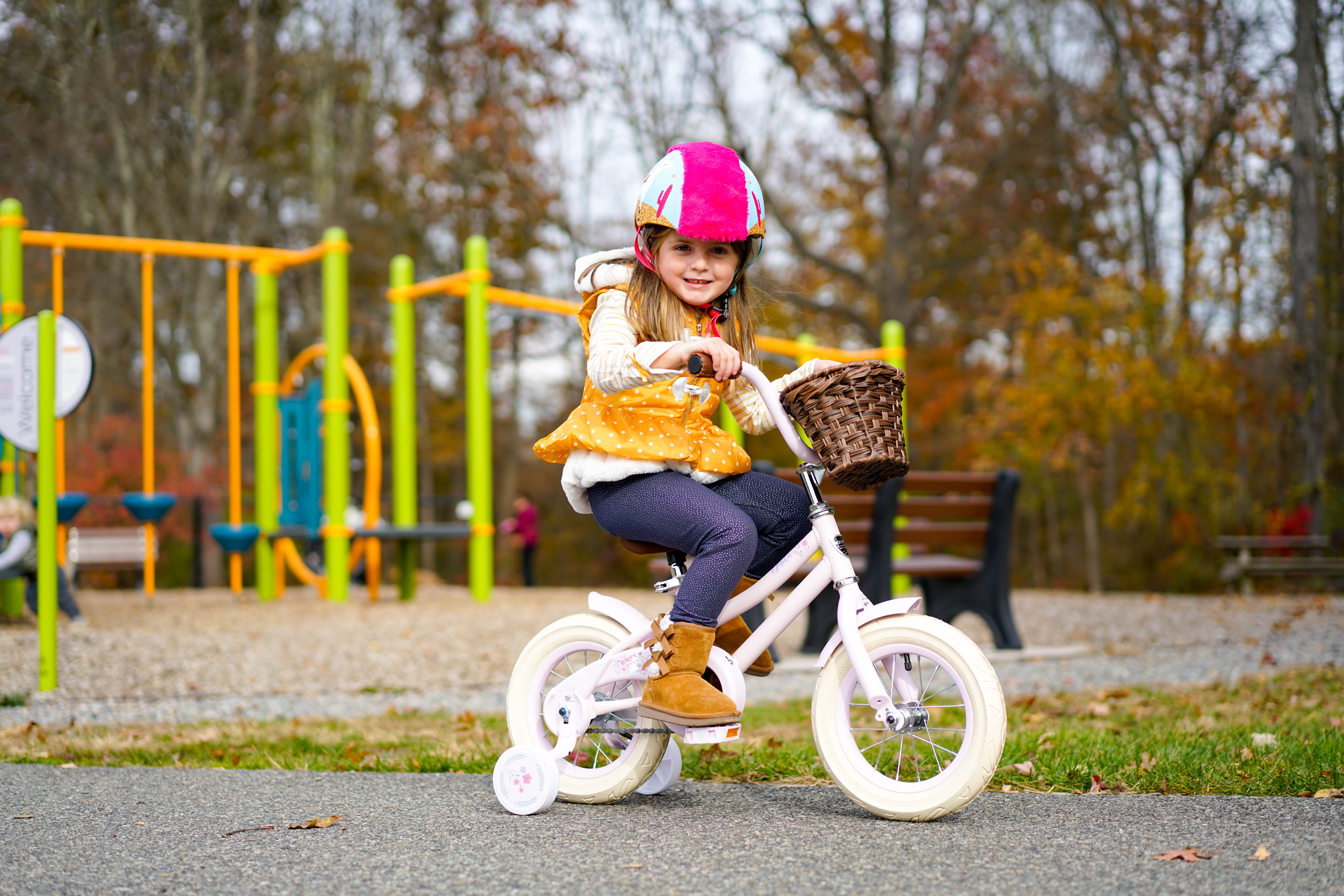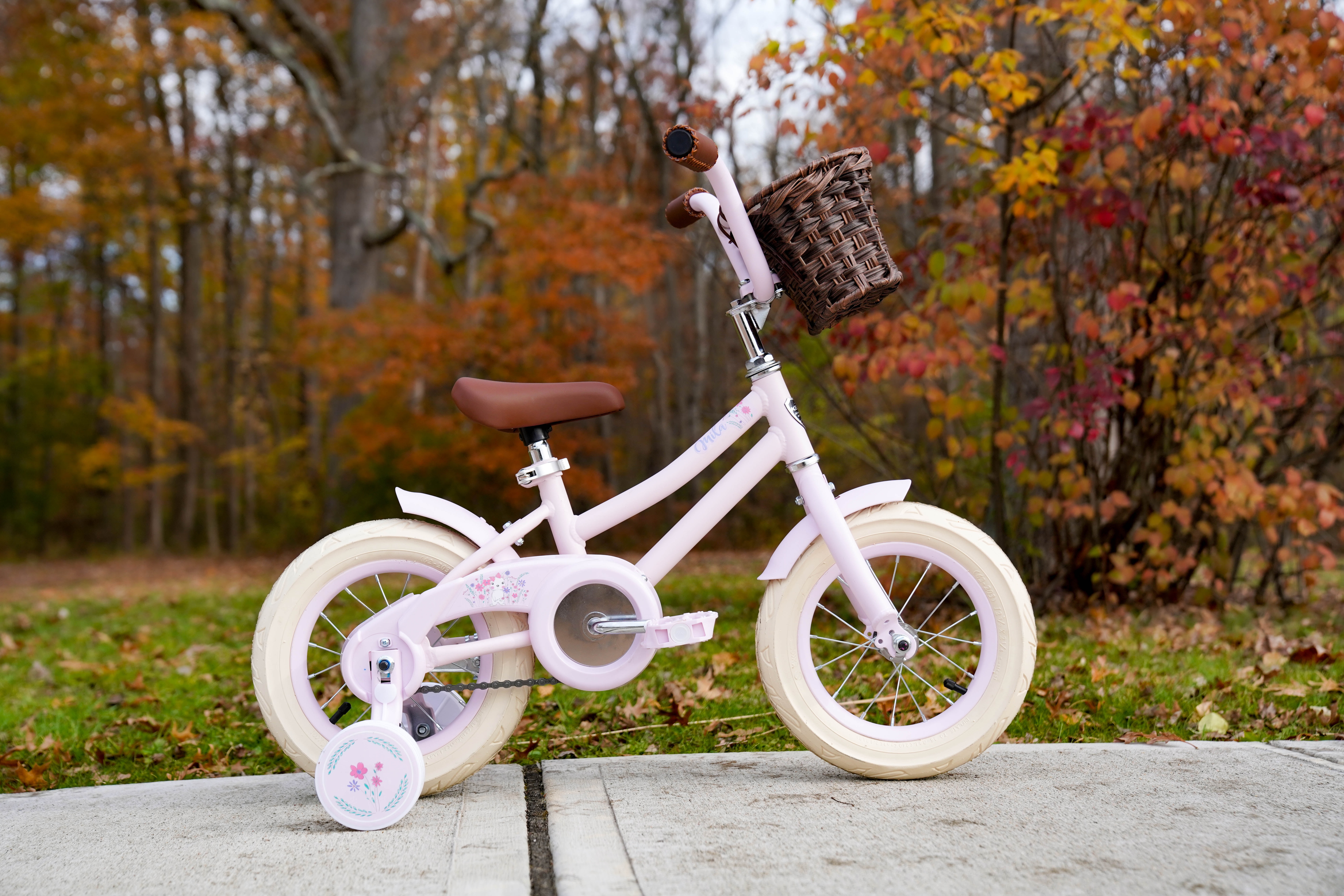 The Kent 12″ Mila girl’s/female bike comes with a basket in the front and is reminiscent of an adult cruiser style bike because of the brown seat, brown grips, traditional brown color basket, and super cute cream color tires. This cute little steel frame bike also has front and rear fenders, color-matched pink wheels, a quick release seat-post, BMX style handlebars, and removable training wheels for added convenience.