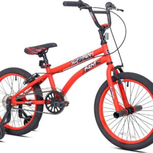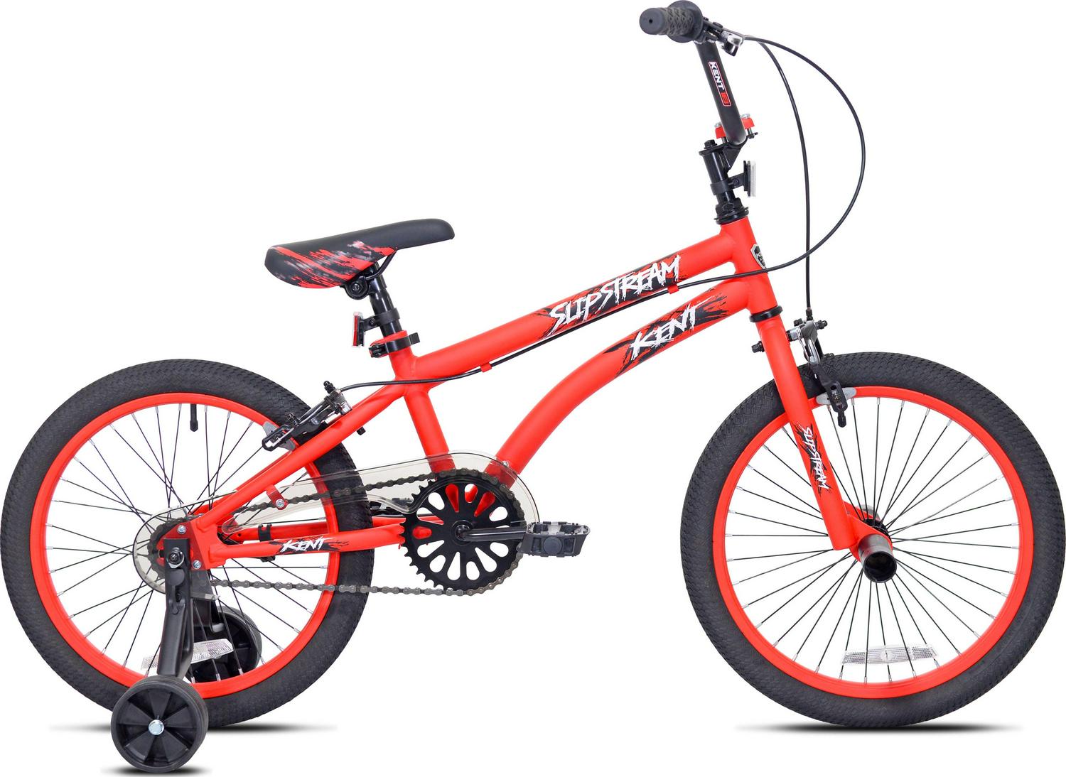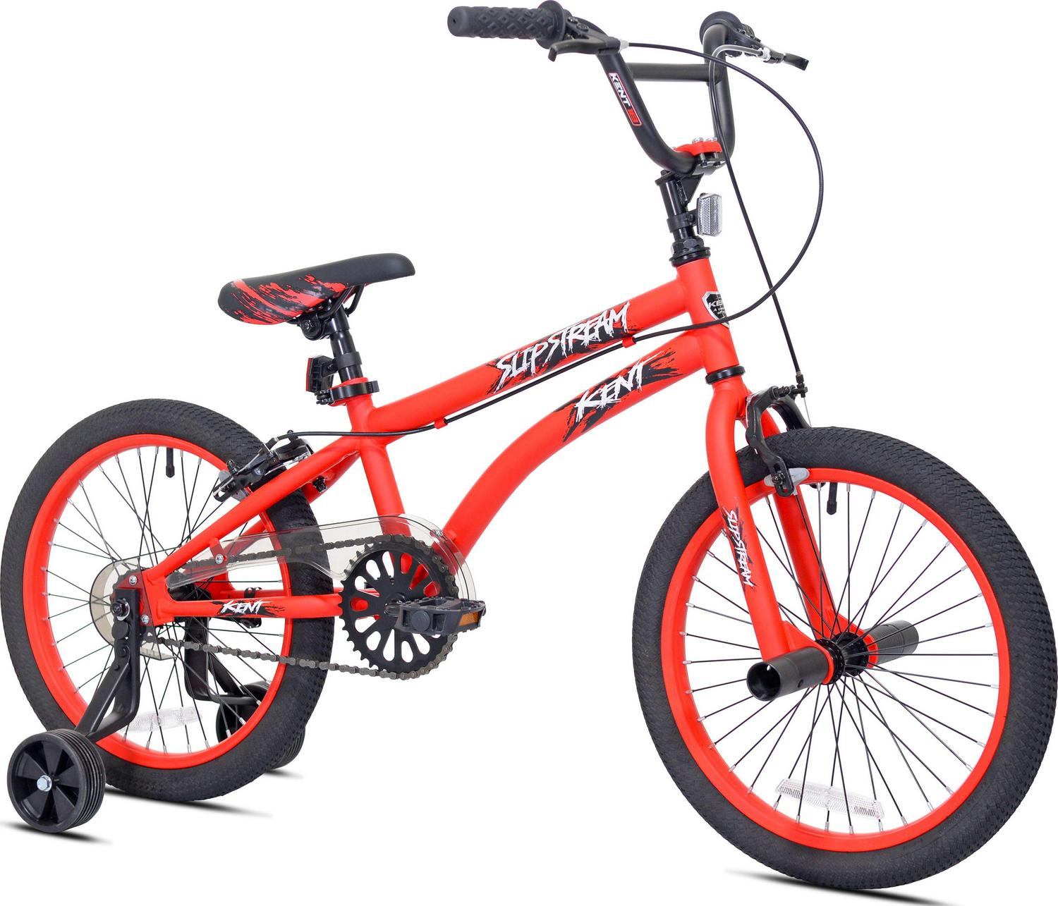The Kent Bicycles 18-inch boy’s slipstream bicycle has a lightweight, sturdy BMX steel frame that’s tricked out and ready for action. It’s sure to make your child feel like a real freestyle rider. This capable BMX bike is equipped with a sturdy matte steel frame and fork. The dual-hand brakes provide more than enough stopping power and the front and rear pegs are essential for any budding BMX. An adjustable saddle makes this bike perfect for a wide range of riders. The BMX style handlebar easily adjusts to provide additional rider comfort. Removable and adjustable training wheels are perfect for learning to ride and are then easily removed by parents when the child is ready to ride on their own.