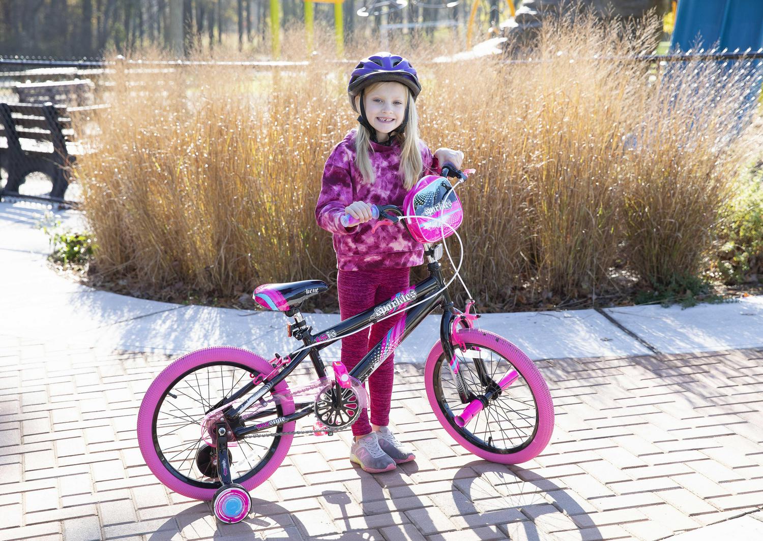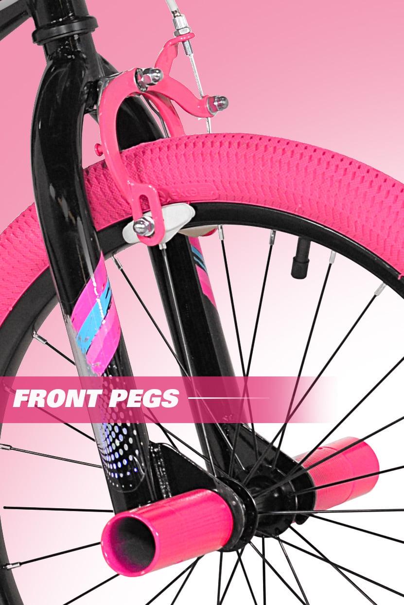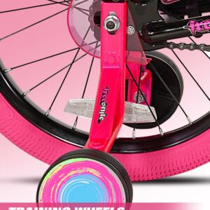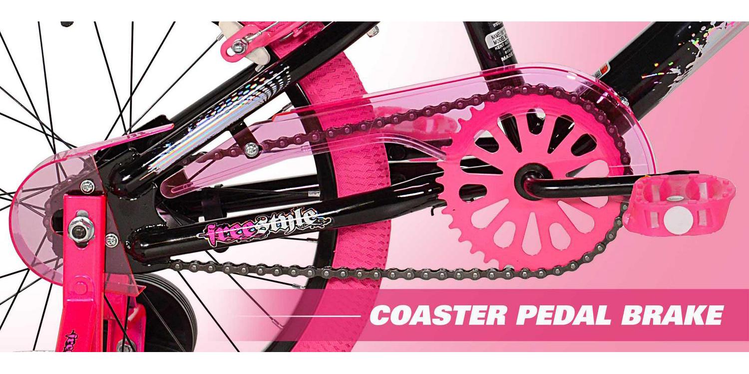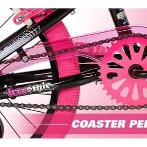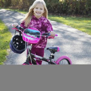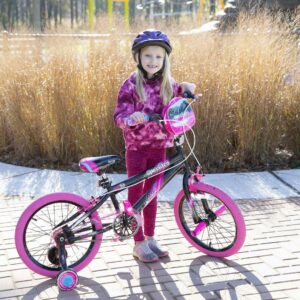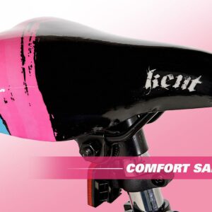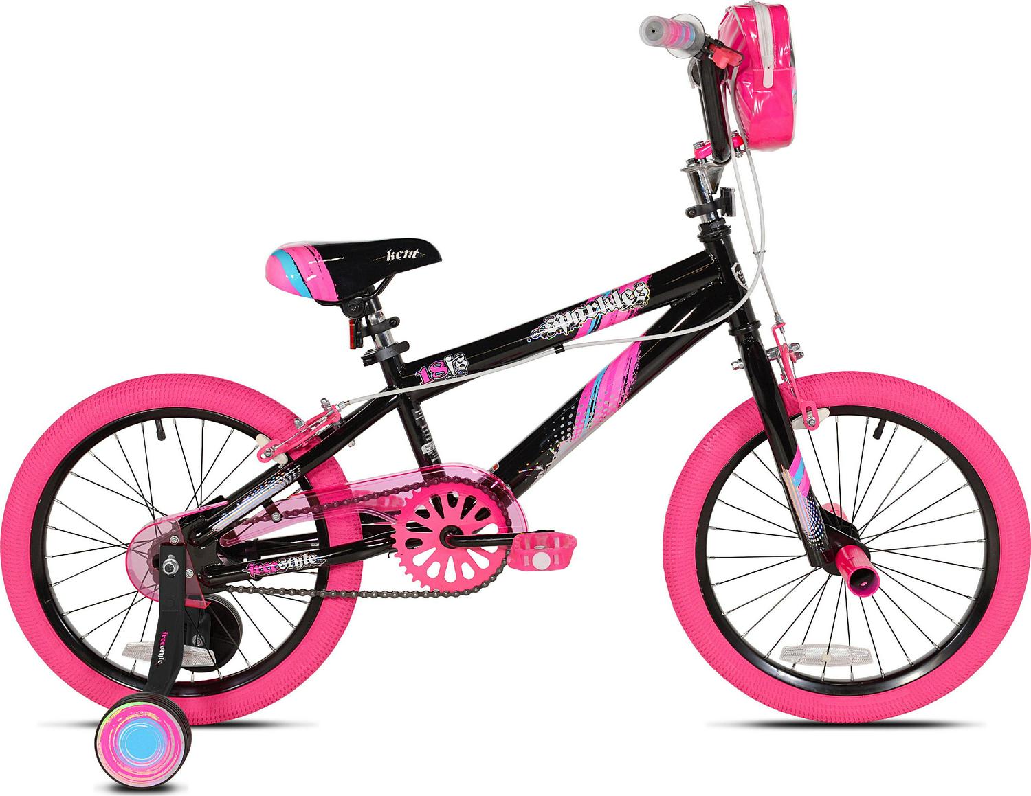 The Kent sparkles 18-inch bicycle is so fun for kids to ride. It is ideal for girls that have just moved onto their first two-wheeler with an oversized steel frame, it provides sturdiness and stability for new riders. It is painted with a stylish black color with hot pink, cool graphics, and pink tires also add a fun accent. This girl’s/female bike comes with matching Training-Wheels that can be used to build confidence while little ones are learning to ride. It also has adjustable high-rise BMX-style handlebars and the seat height can be adjusted easily without the use of tools via the lever-activated quick-release. This bike fits most kids 3’8″ in height and up and it features a rear foot brake plus dual front and rear side-pull handbrakes. They can be used to keep the bike under control for greater safety. Low-profile tread street tires and a padded seat smooth out the ride. This unit features front axle pegs and a matching handlebar-mounted carrying bag to create a unique look.
