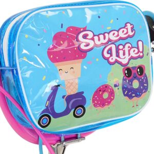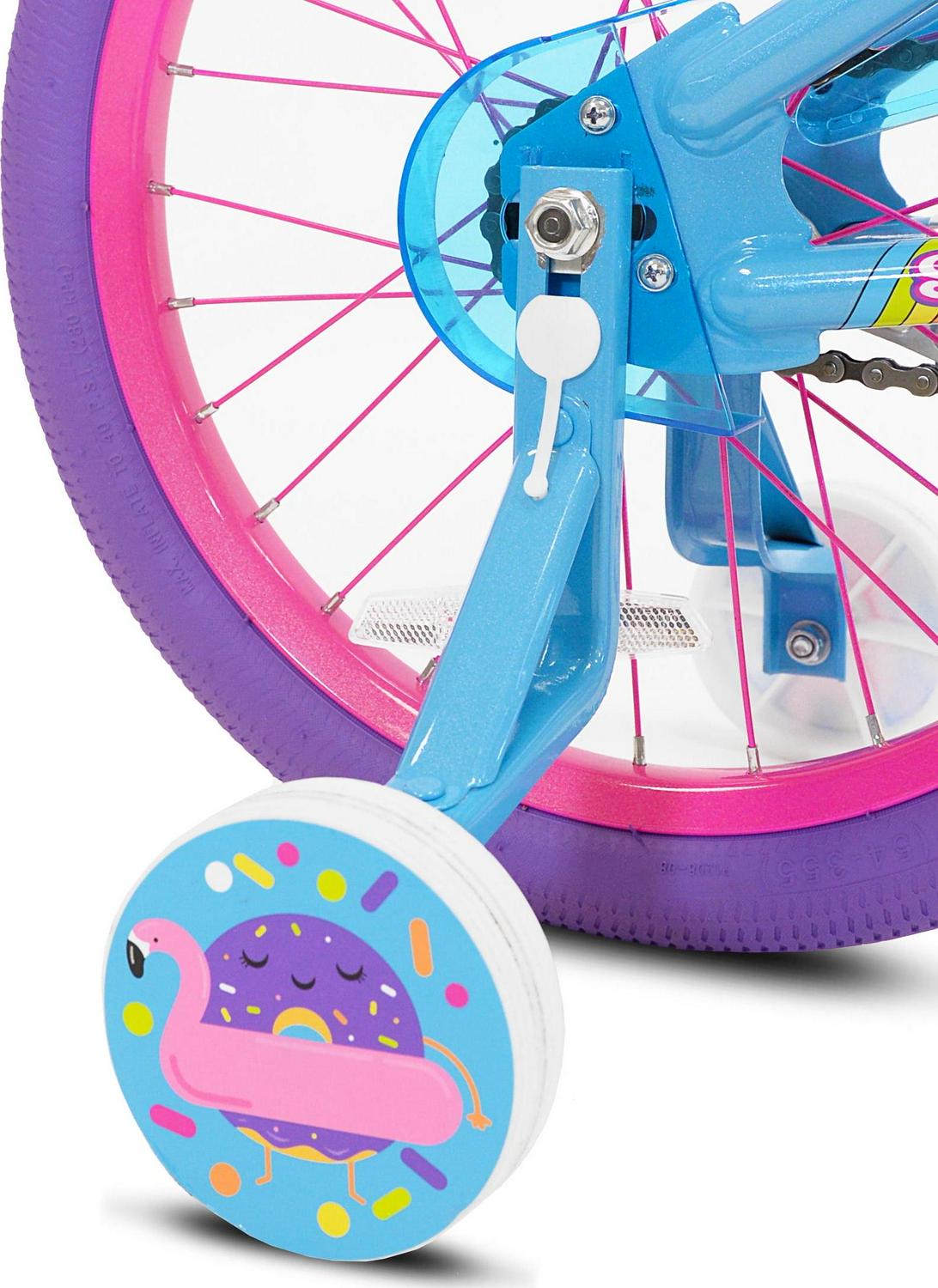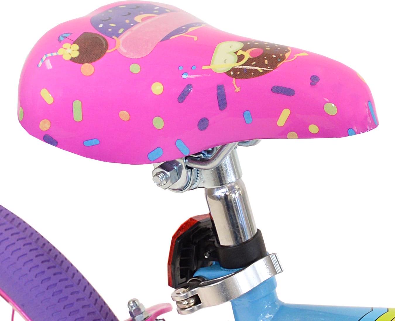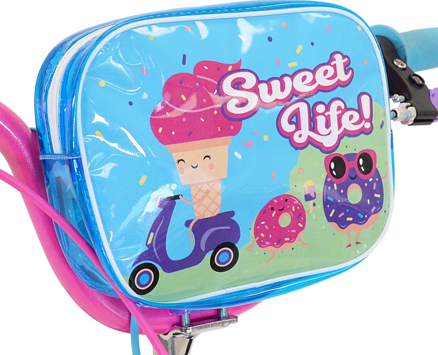 The 18″ female Sweetness child bike is the perfect fit for the hip young lady learning to ride her first two-wheeler. The over-sized steel frame is painted blue and purple with colorful cupcake graphics and one blue and one purple tire. Color-matched training wheels will help her gain confidence until she is riding on her own. It also has adjustable high-rise BMX-style handlebars and the secure four-bolt stem moves as she grows. The seat height is adjusted easily with no tools required via the lever-activated quick-release. This bike has a rear foot brake plus dual front and rear side-pull handbrakes to keep speed under control for the new rider. Low-profile tread street tires and padded seat smooth out the ride. Front axle pegs and a matching handlebar-mounted carry bag round out the package that will make her the envy of the neighborhood.