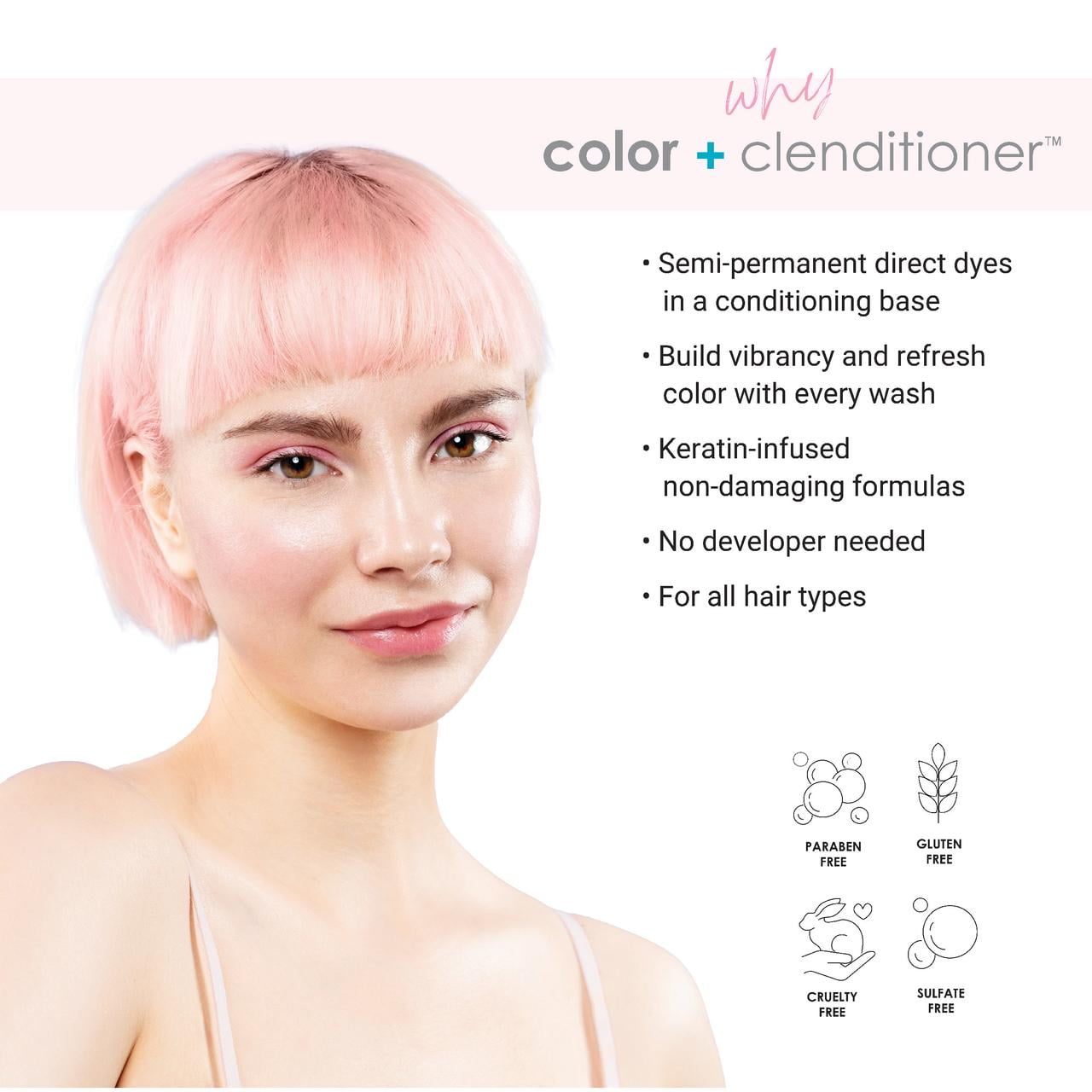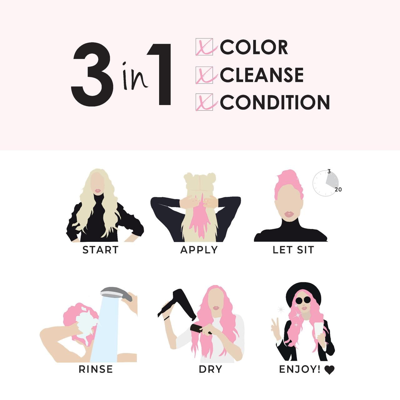 Keracolor Pink Hair Dye – 3-in-1 (Cleanse, Color & Condition) Clenditioner33.8 fl oz – Light Pink How Does It Work: Start with wet or dry hair. Section hair and apply the product generously. You can use a wide-tooth comb for even distribution. Leave on for 320 minutes, depending on the color saturation intensity you desire. Rinse. Style as usual. Is it damaging to my hair? Our Color + Clenditioner is not damaging to your hair, but quite the opposite – it is actually good and kind to your hair. It replenishes your hair with our kind ingredients including our signature Keratin, combined with nourishing and rejuvenating coconut oil, shea butter, rose hip oil, jojoba oil & almond oil that will leave your hair healthier and shinier with each use. How long will my hair color stay? Our Color + Clenditioner product contains semi-permanent direct dye pigments and will gradually fade out from hair. The amount of time the product will last in hair is dependent on the condition and porosity of the hair, and the intensity of the shade. Lighter colors tend to fade out faster, like Light Pink, Rose Gold and Mint. The more stubborn shades are the Blues, Espresso, Onyx, Purples, and Teals which tend to stay in hair the longest. How do I get the color out of my hair? If your hair is damaged and very processed, you may see a much longer fade out process. For the more stubborn shades, a direct dye remover may be needed.