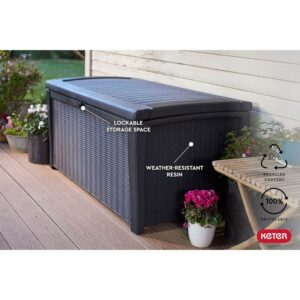 The Borneo Deck Storage Box from Keter is an ideal organization fixture for your backyard patio. Maximize your outdoor spaces and contain your porch accessories, cushions, gardening tools, pool equipment, and more from harsh weather conditions. Constructed of weather-proof resin, this organizer bin will become a staple in your lawn. With this heavy-duty container, rest assured, knowing that your outdoor accessories will remain dry and ventilated. Bring your outdoor decor to the next level and incorporate this elegant resin rattan-style piece of furniture into your layout. Doubling as a bench, you and your partner can store away any extra furniture and sit together. With an easy opening mechanism and a surface that is simple to clean, this storage organizer is convenient and will fit seamlessly into your everyday routine. Prioritize your outdoor furniture and invest in a storage bin to keep your beach towels and patio furniture secure with the Borneo Deck Storage Box from Keter.