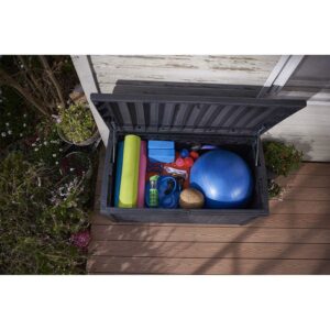 – Large, 110-gallon outdoor storage box is built to store patio accessories, cushions, pool toys, garden tools, and more