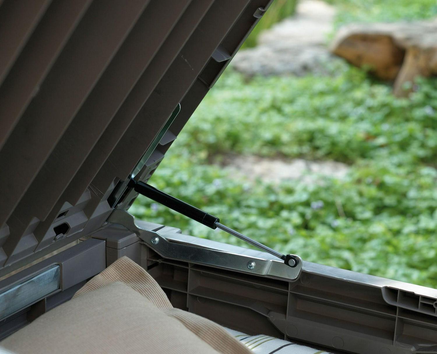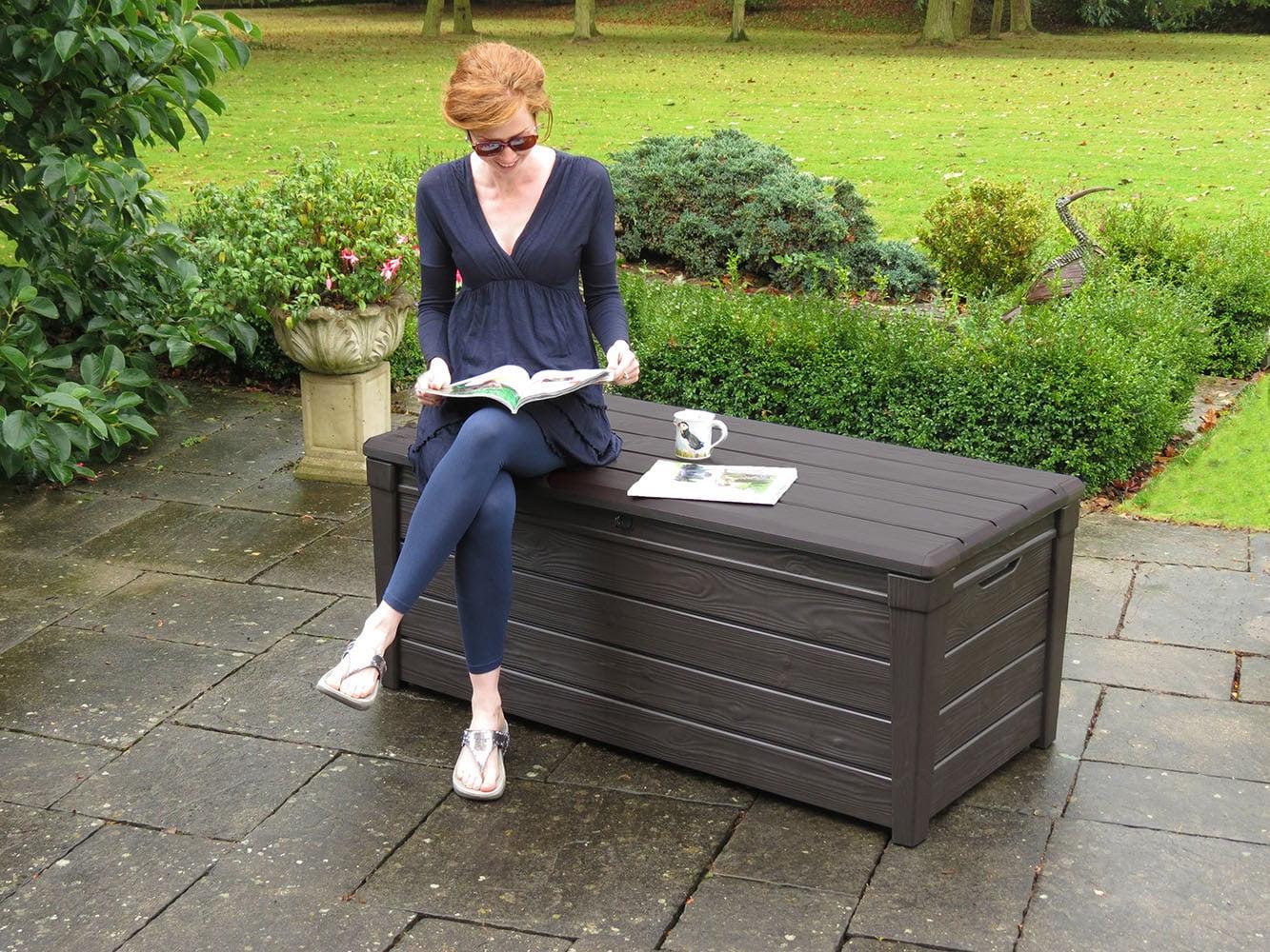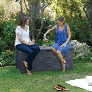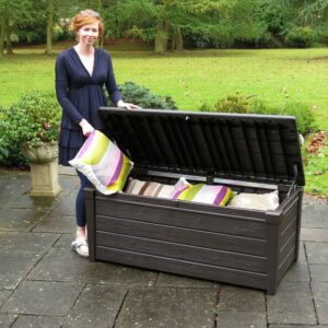 The Keter Bright wood Outdoor Plastic Deck Box All Weather Resin Storage helps you keep your outdoor items and equipment safe and within reach. It features an automatic opening mechanism that makes opening and closing it very easy. The Keter Brightwood storage box makes tidying up your deck or patio simple and convenient. It can even provide extra seating, as it doubles as a bench, accommodating two adults on its sturdy top. This Keter Bright wood Outdoor Plastic Deck Box All-Weather Resin Storage is UV treated and weather resistant. You can store toys, garden equipment, tools, and other items inside it and keep them in there all year long with peace of mind. This Keter garden storage box includes built-in handles for easy lifting and placement. With a 120-Gallon storage capacity, it’s spacious enough to give you one convenient storage solution for all your outdoor needs.