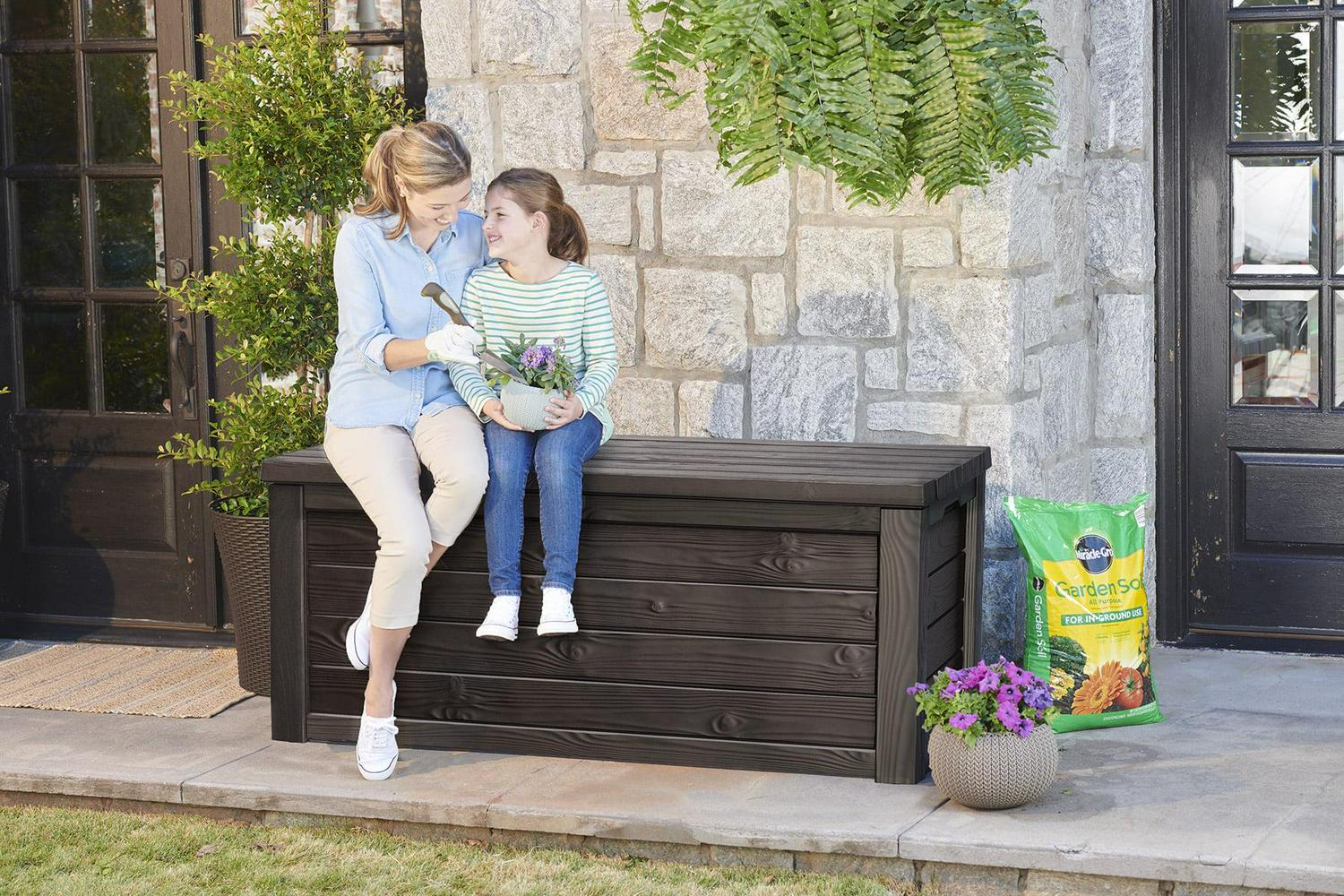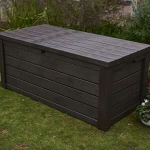 The Eastwood 150-gallon deck box by Keter features a wood-like texture, but it is a durable resin that will never peel, rot, or fade like real wood. It is low to the ground for extra seating, and the resin material is ideal for extra sturdy storage needs. With the UV-protected exterior, you can safely store a variety of materials in this lockable poolside Keter deck box. Vents will keep any plastic or liquid materials from storing musty smells and keep the deck box open to airflow. The vent feature is especially useful when storing toys, or cushions that may be damp. This deck box is an ideal way to have extra seating in a pinch. And hydraulic easy lift pistons allow owners to quickly and easily get inside the container with a minimal amount of effort and ensure no pinch fingers when children are opening and closing. Assembly is also a snap that can be done within a single easy session.