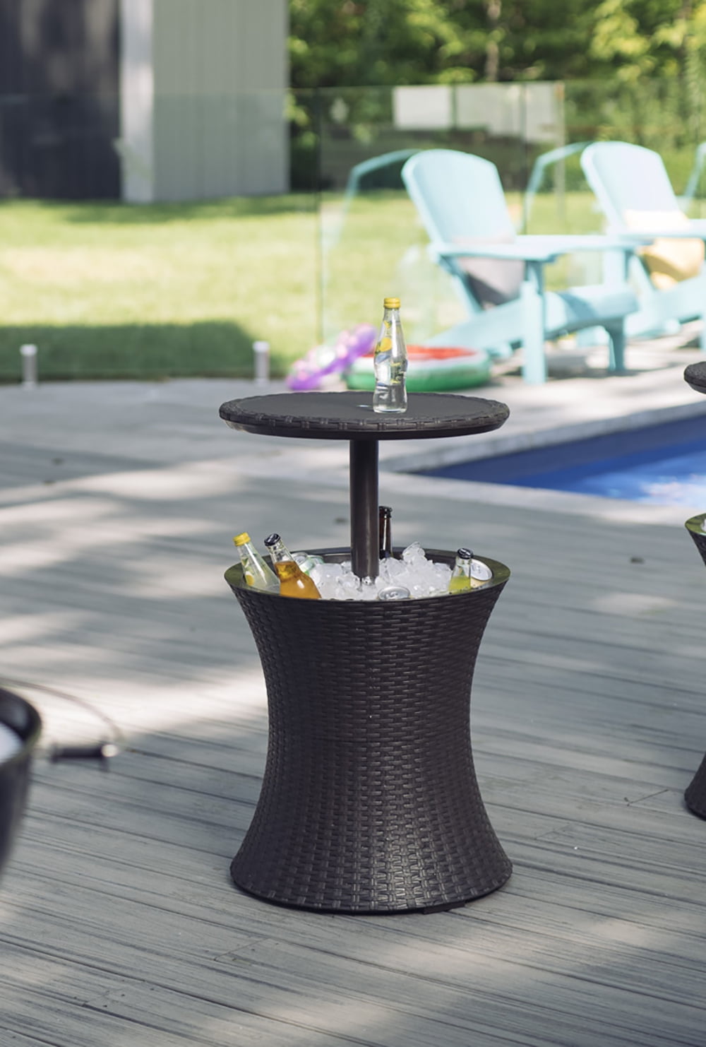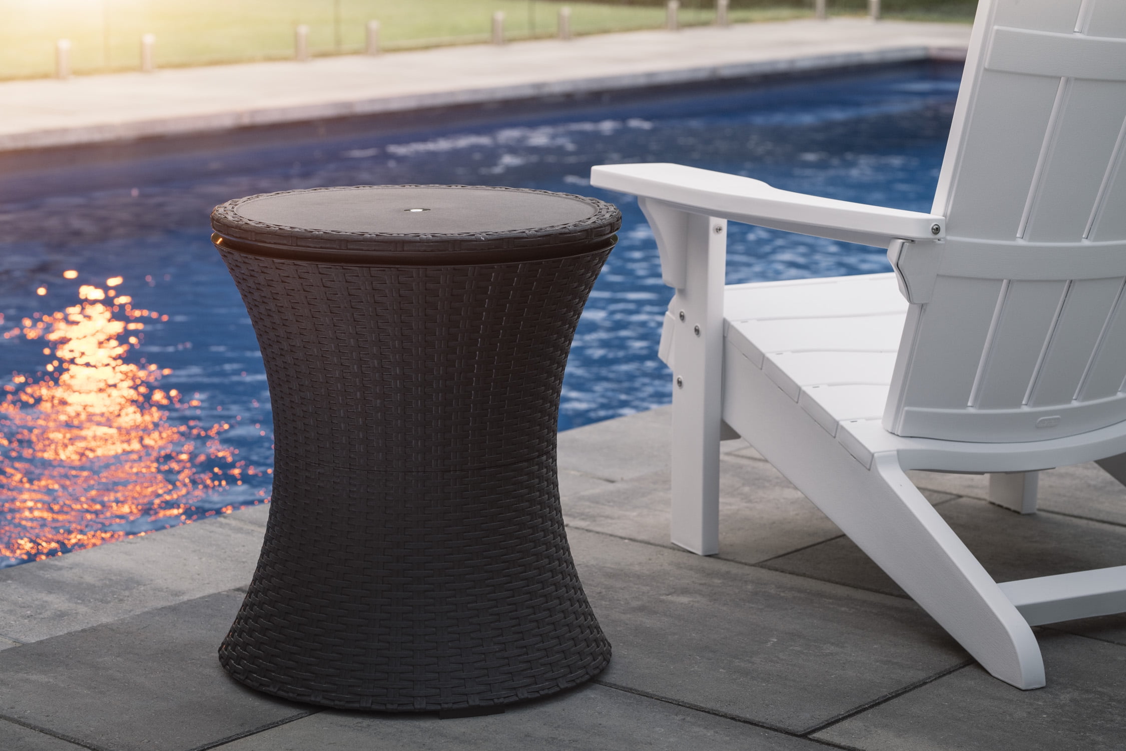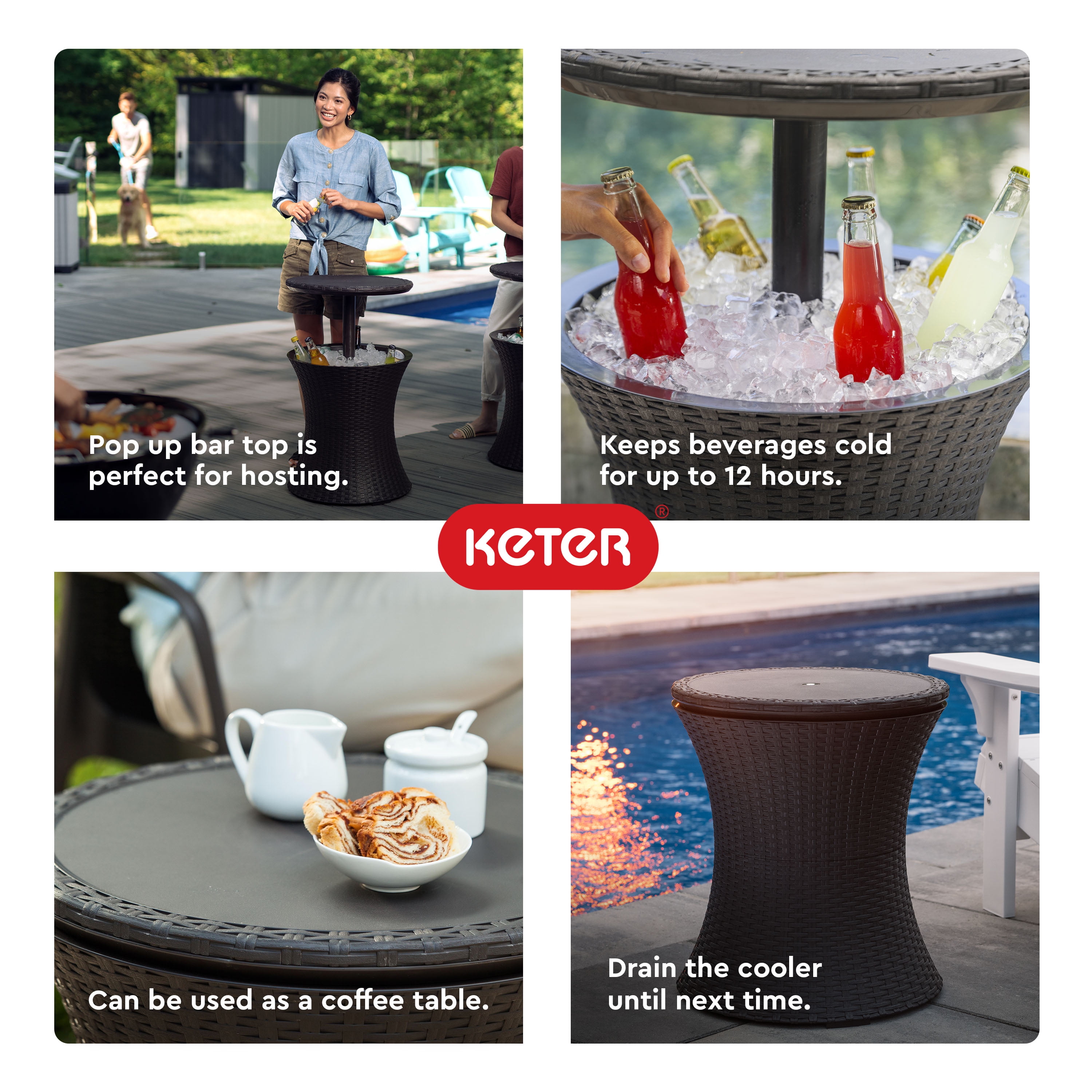 Keter 7.5 Gallon Cool Bar Patio Beverage Cooler Table IDEAL SIZE: Dimensions: 19. 5 D x 33. 2 H in. POP UP TOP: Lid elevates upwards 10 inches above the rim for use as a cocktail table HIDDEN COOLER: 7. 5 gallon drink storage capacity to handle up to forty 12 oz. cans with ice RESIN CONSTRUCTION: It’s made out of all weather-resistant resin with an appealing rattan-look texture EASY CLEANUP: Drainage plug for easy cleanup in a pinch GIFTS FOR DAD: The perfect gift and bar accessory for the #1 BBQ Grill Master in your life VERSATILE USE: Use as a patio coffee table, bar table, drink cooler, and raised hot tub table