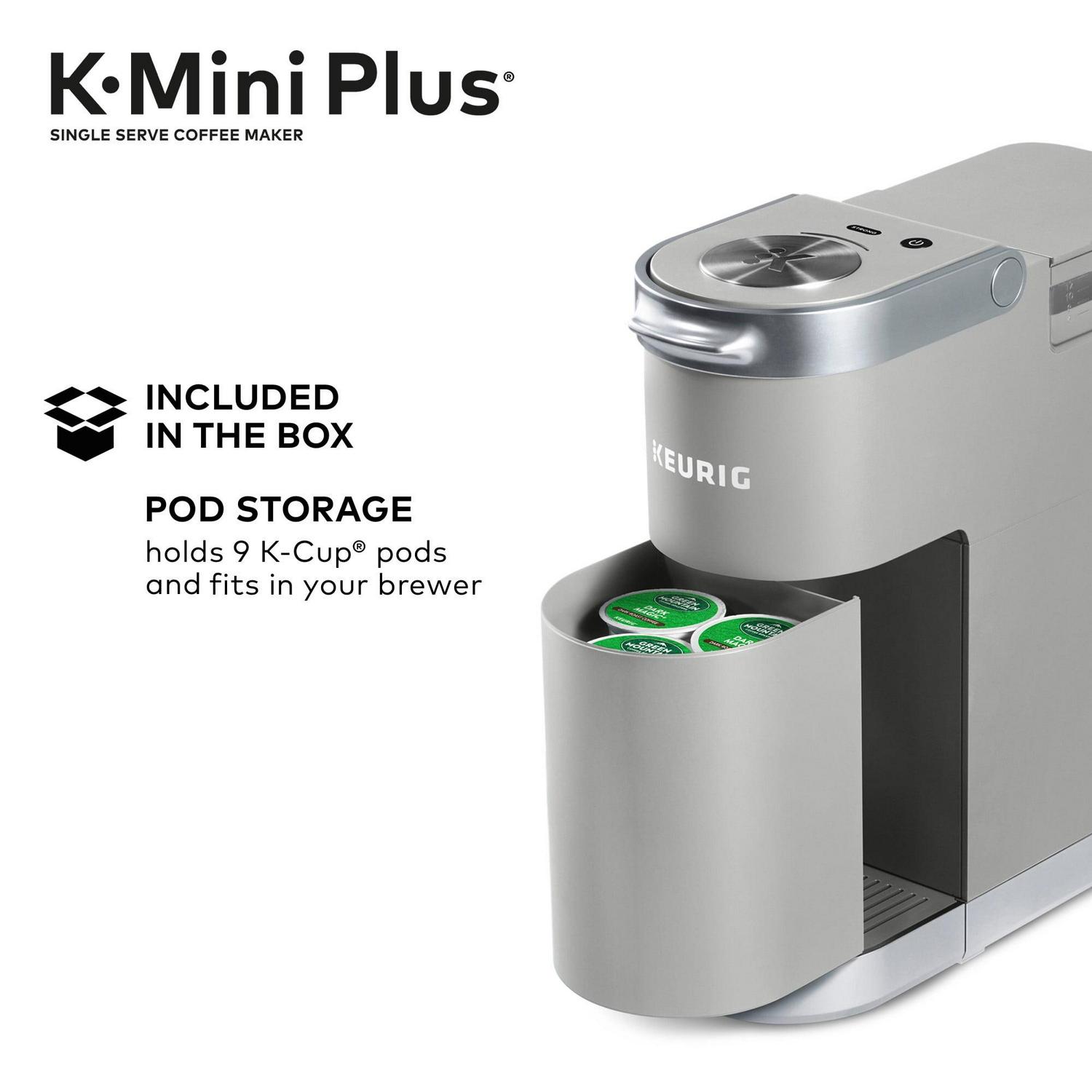 – WHAT’S IN THE BOX: Keurig K-Mini Plus single serve coffee maker, pod storage unit that fits in your brewer and can hold up to 9 K-Cup pods.