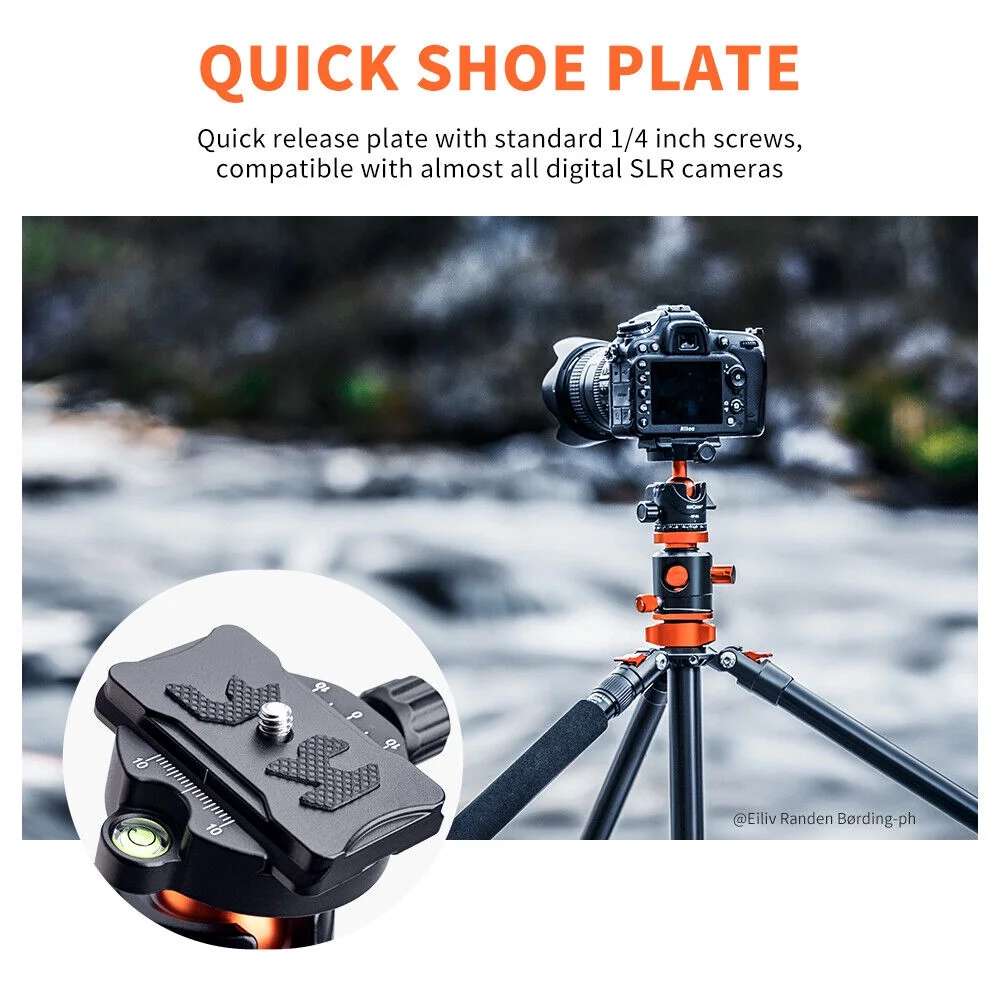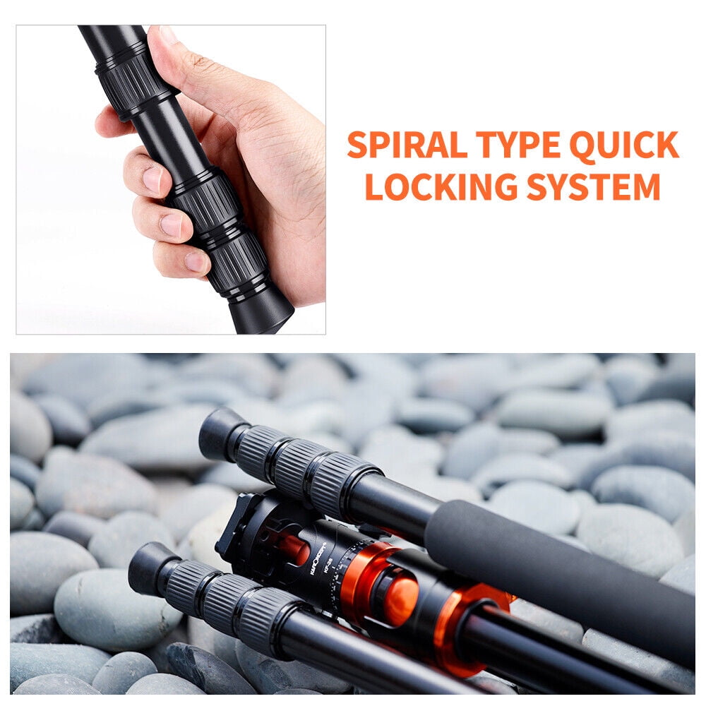 K&F Concept SA254T3 74 inch Aluminium Camera Tripod with extension arm 1.Center column can be rotated 360°horizontally,making it easier for photography enthusiasts to realize panorama shooting. 2.Center column inverted installation to realize the lowest angling shooting, macro shooting, and special photography. 3.Stretchable hook,can hang other heavy objects to increase the stability of the tripod. 4.Spiral type locking knob makes operation easier and quicker,better locking strength,saving you more time. 5.The bubble level helps you quickly find the balance of the rack, confirm the accuracy of the shooting, and achieve the perfect composition. 6.Monopod Conversion,AS a monopod or walking stick alone to make your photography more diverse.